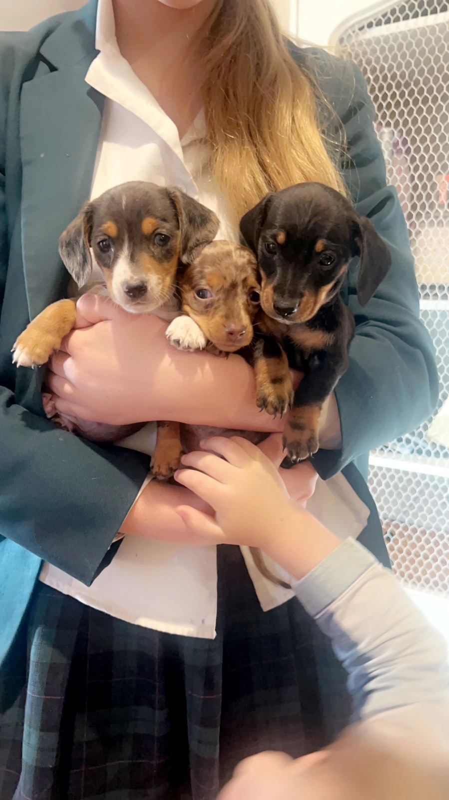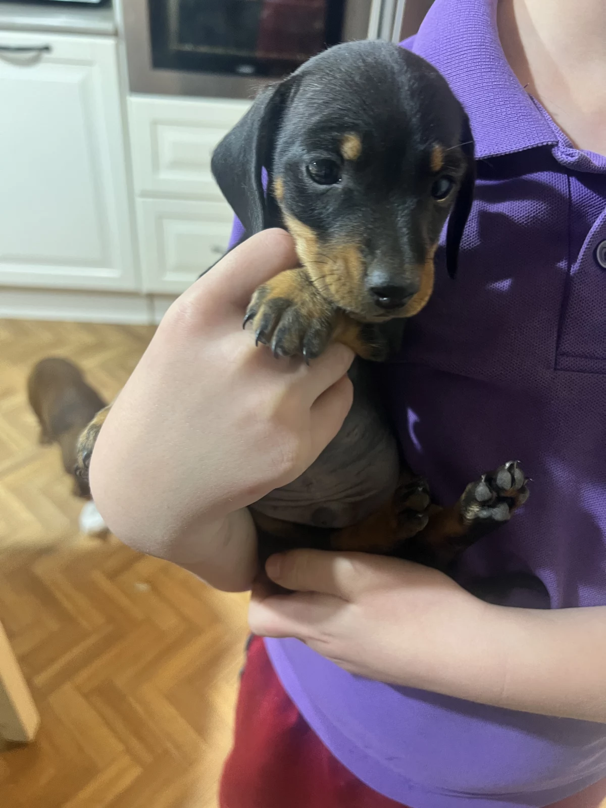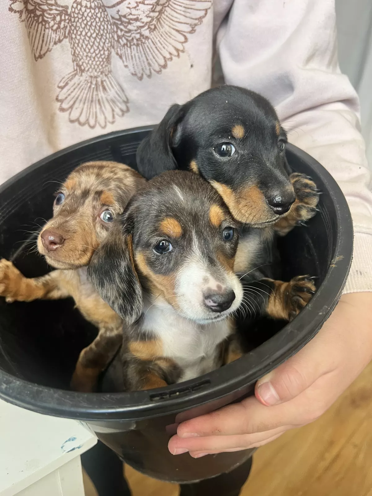 Three beautiful dapple miniature dachshunds looking for their forever homes. Raised with children and other animals. Both parents are available to view and live with the pups. Parents are DNA tested and cleared.