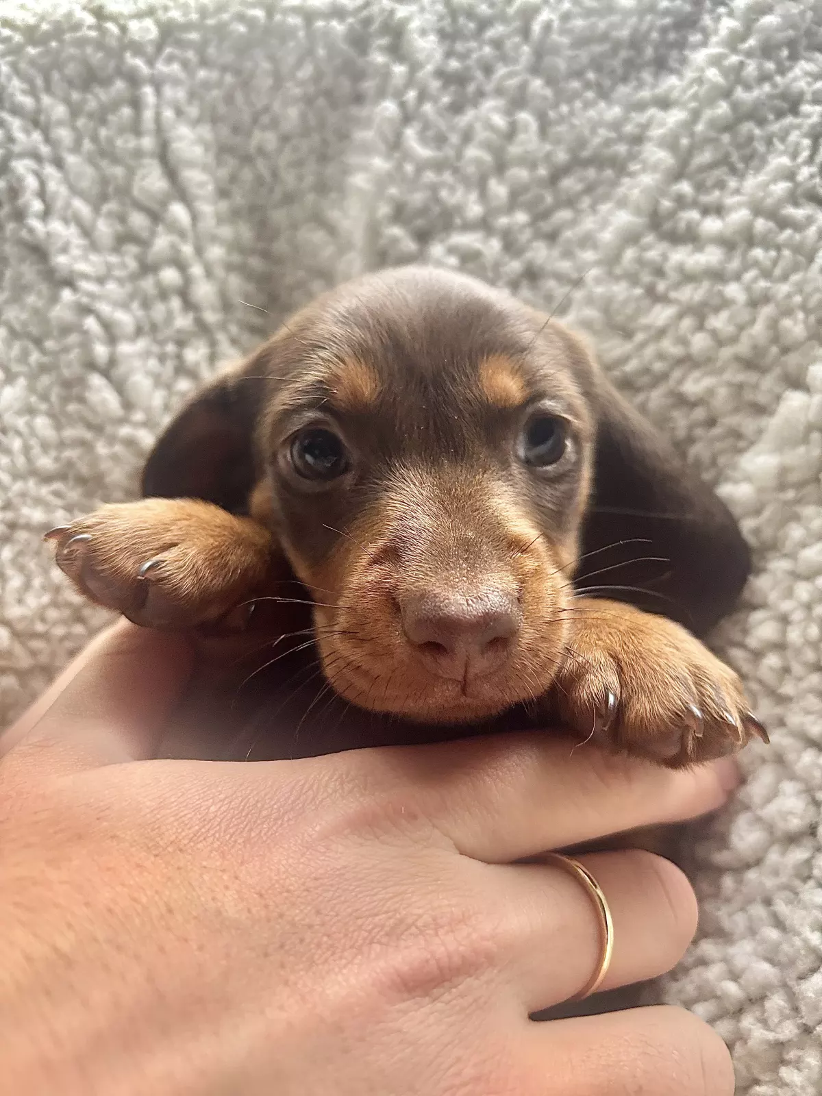 Gorgeous miniature dachshund chocolate & tan short-hair girl will be ready to go to her forever family very soon! She is an absolute sweetheart with a beautiful coat and lovely temperament, and she has been raised with plenty of love and attention from day one.