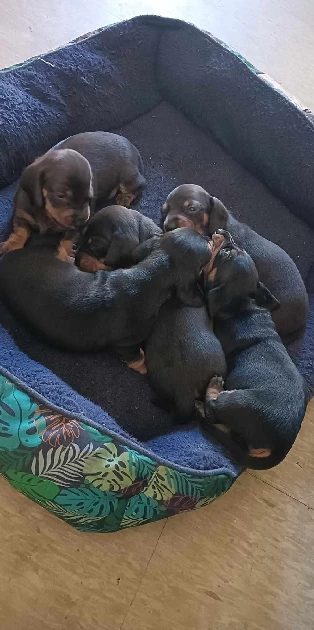 We have 5 beautiful Dachshund puppies now ready to go to their new homes. This lovely litter includes 3 males and 2 females, all raised in a caring family environment. There are 3 black and tan pups and 2 dark chocolate and tan pups, each with their own sweet personality and gorgeous colouring.