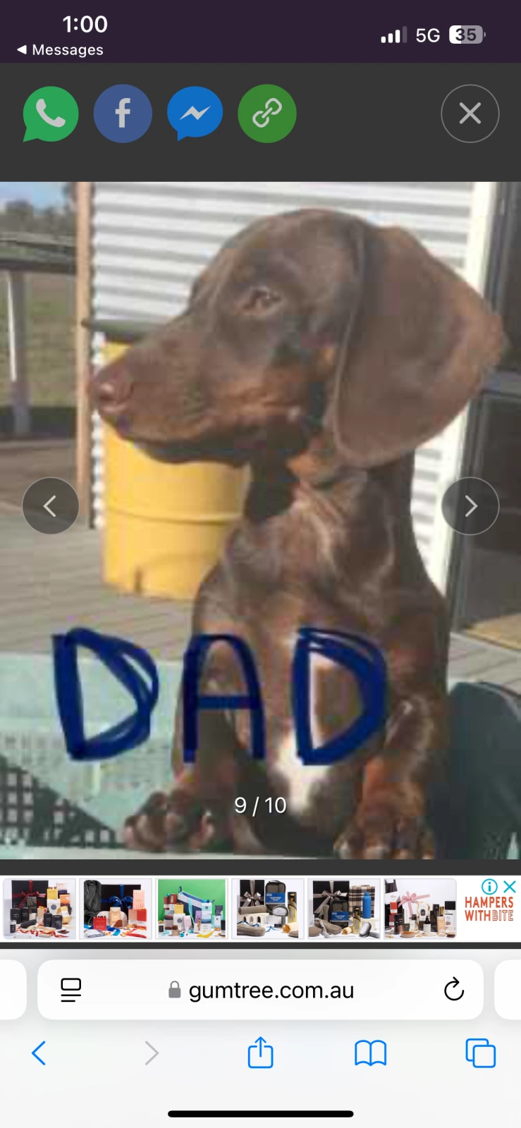 Father is Chocolate with gold markings, he is 5 years old and 6kg (he is a little overweight-should be 5kg) his father is red and 5kg and his mother is black and tan and 4kg.The father can be stubborn like most dachshunds however he is incredibly loyal and very much attached at the hip with his human, he is affectionate and eager to please.