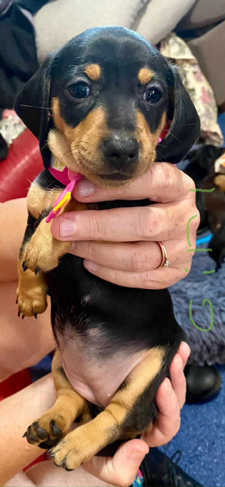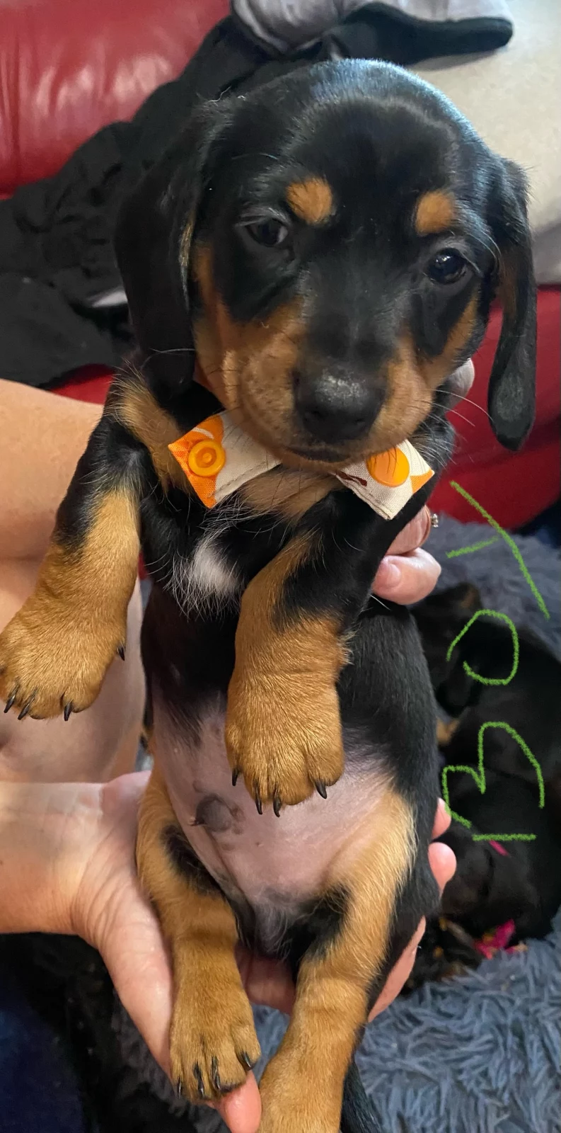 One beautiful little mini dachshund puppy. Father a rare rabbit mini mum a mini. There is only one litter as dad has been desexed and mum will be as soon as puppies have gone to their forever families. Six were born in the litter. Five already sold. There is one boy. Priced to sell. Need gone soon. They have all been vet checked, microchipped, n first vaccinations. They all have beautiful personalities and love cuddles. They are great with children as well as adults. Crate trained and puppy pad training. They all eat wet n dry food. They drink water and puppy milk. They were born on the 1st April 2025. Ready to go to forever homes. They also get along with other animals. Thanks.