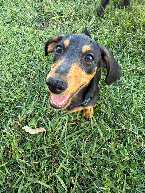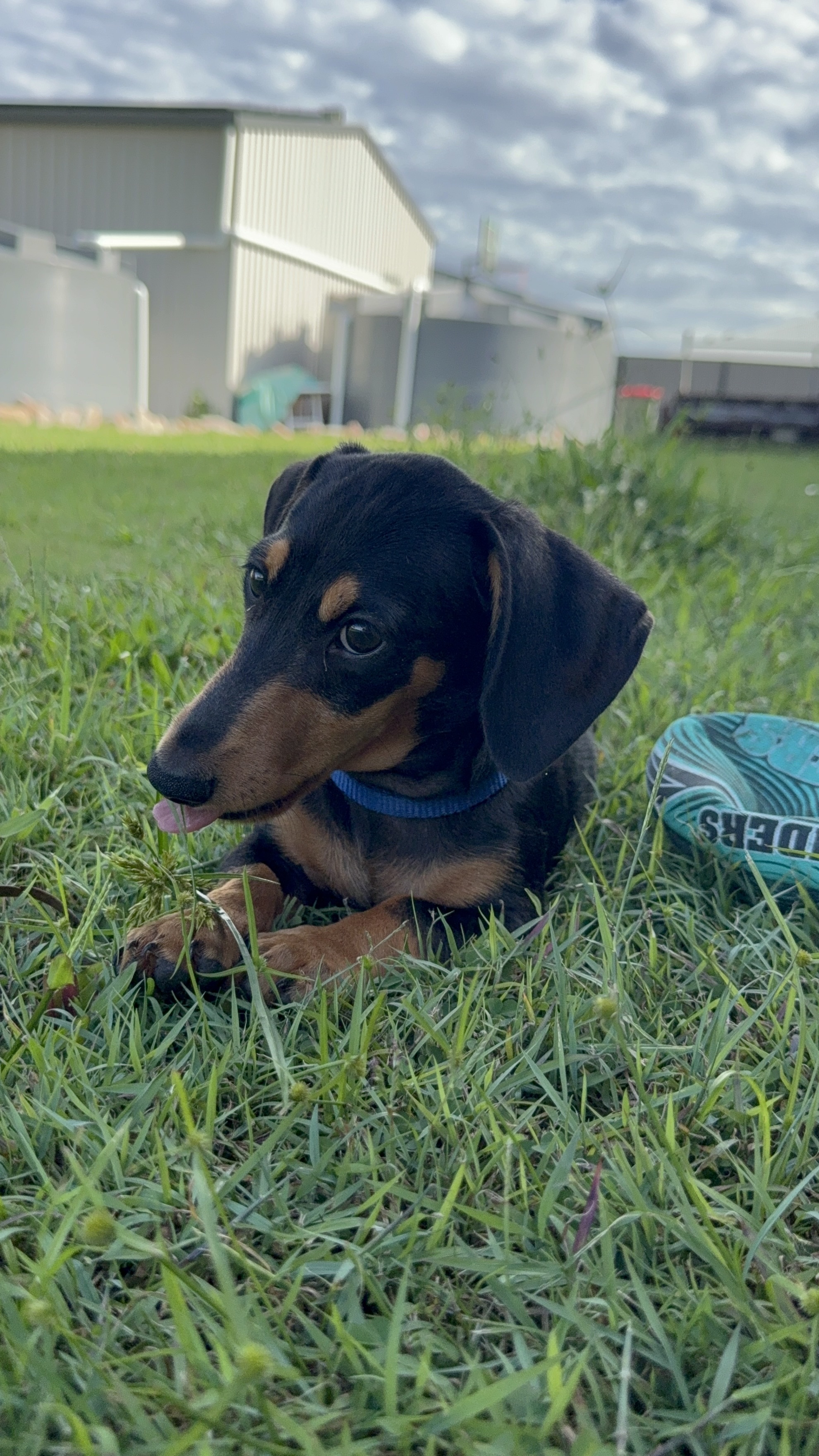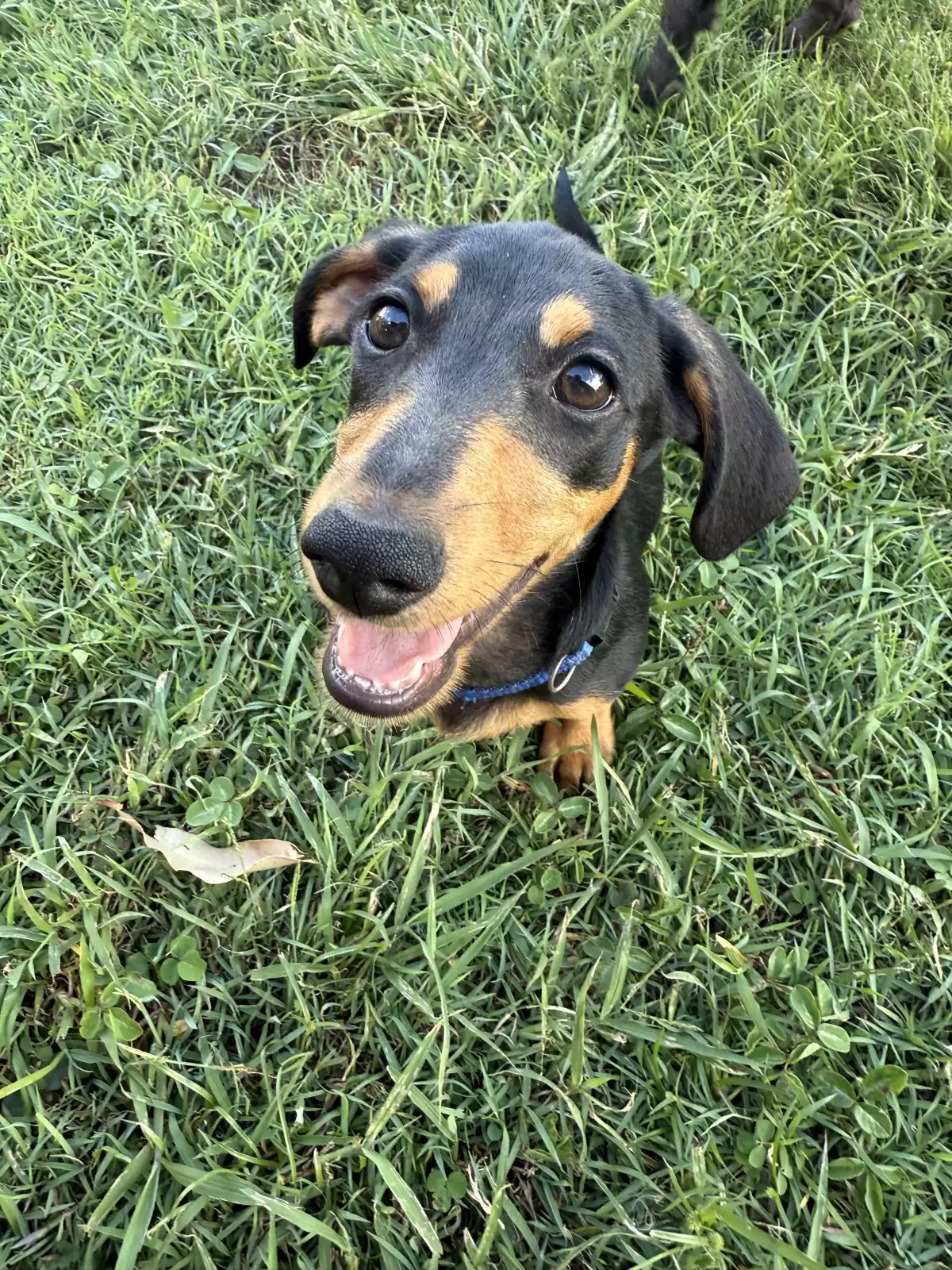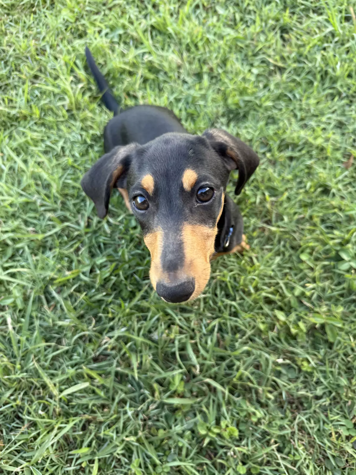 Meet this absolutely adorable black and tan miniature purebred Dachshund puppy, just 15 weeks old and already full of charm.