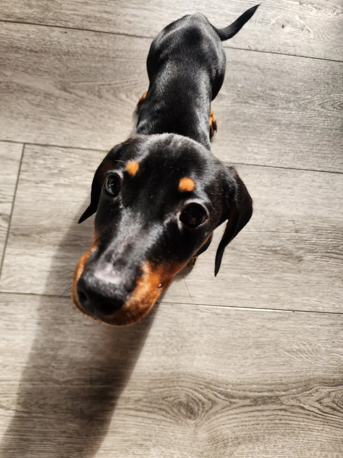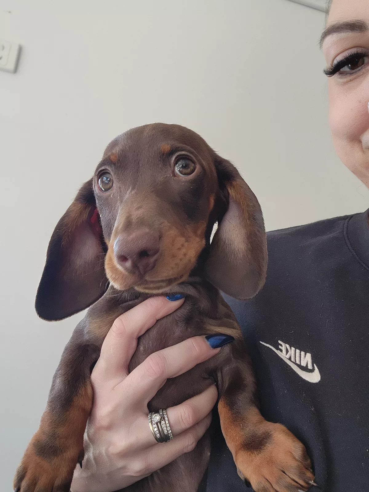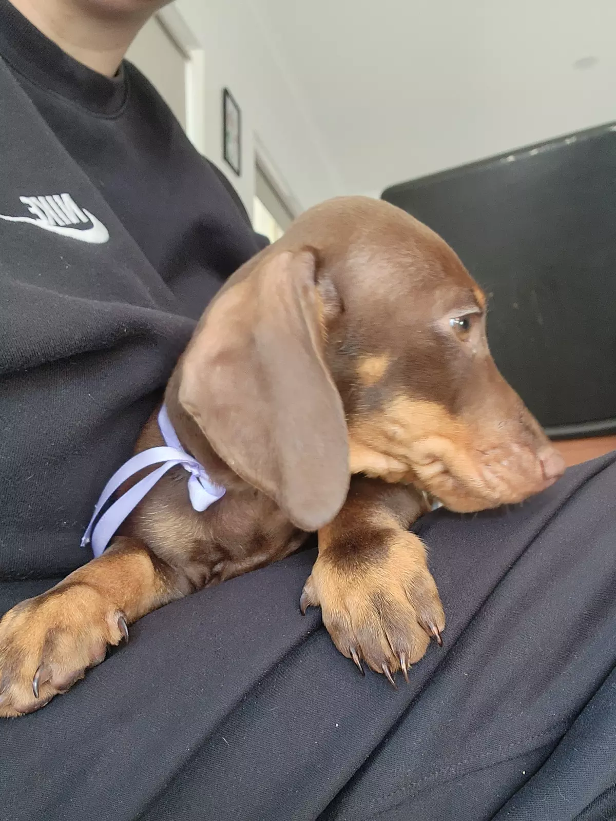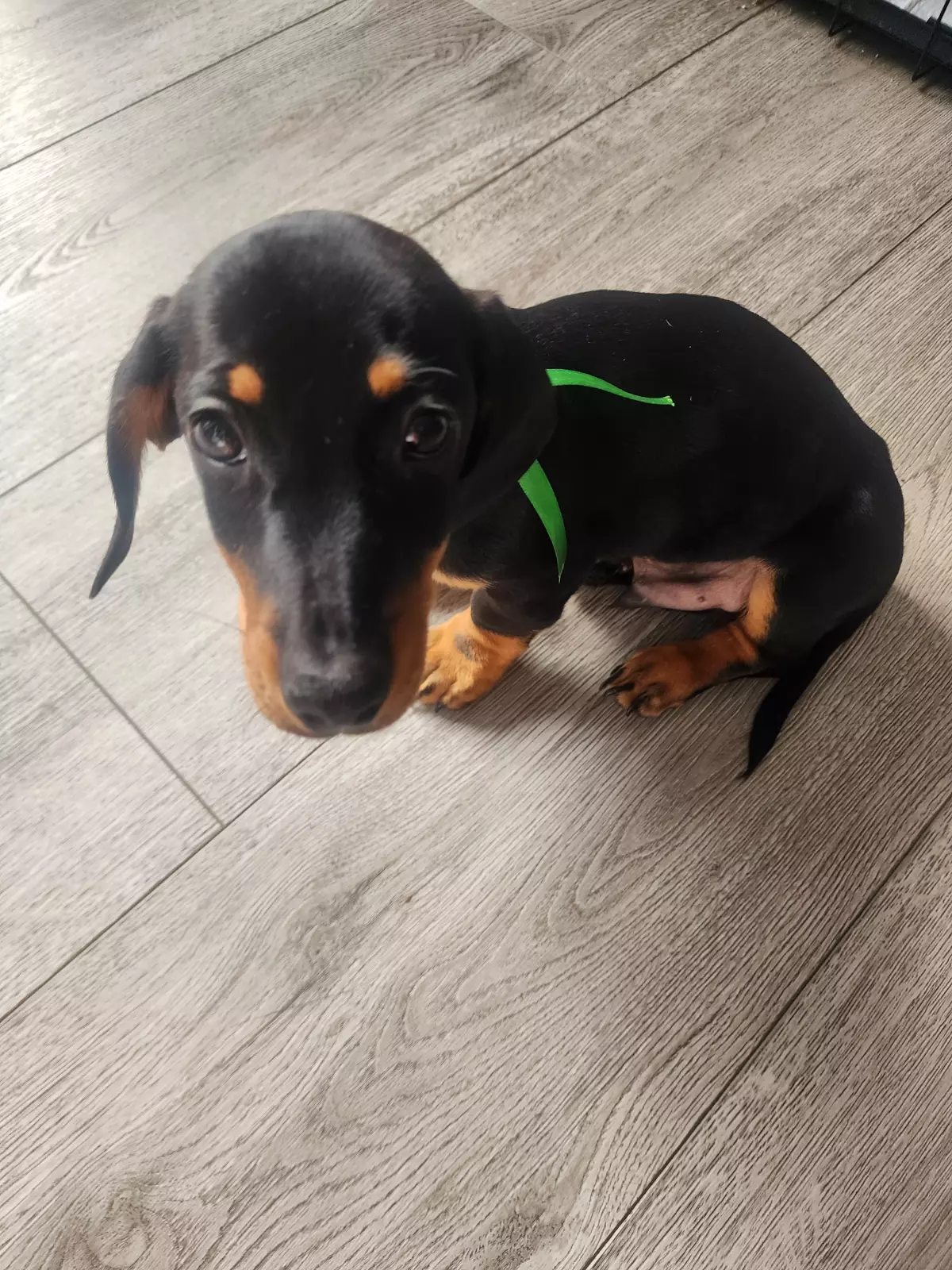 4 male miniature dachshund puppies for sale, born 15/02/20. There are 3 chocolate and tan boys and 1 black and tan boy, all beautiful examples of the breed. These puppies are healthy, thriving, and developing well, and have been raised in a caring home environment with regular handling and attention.