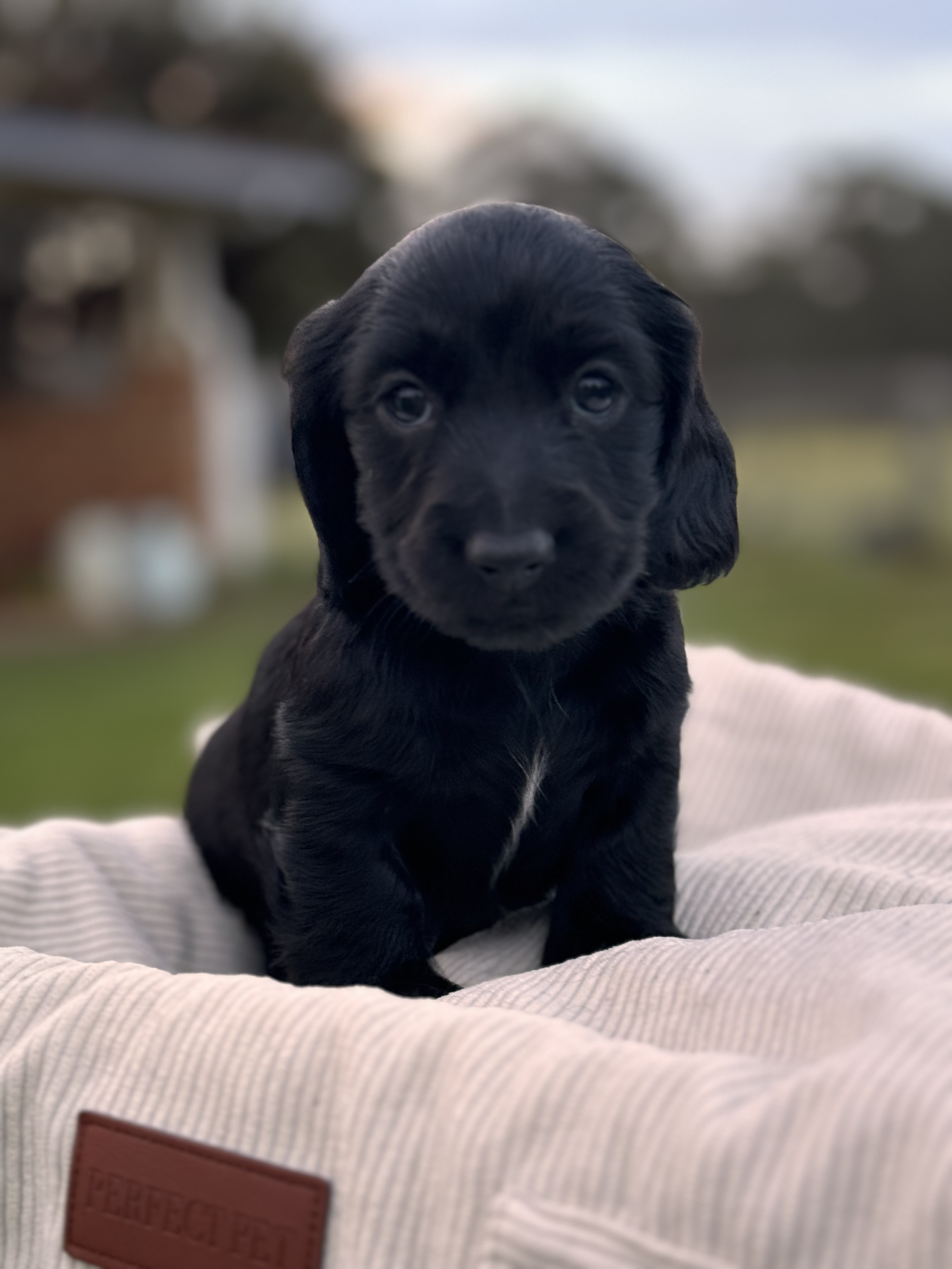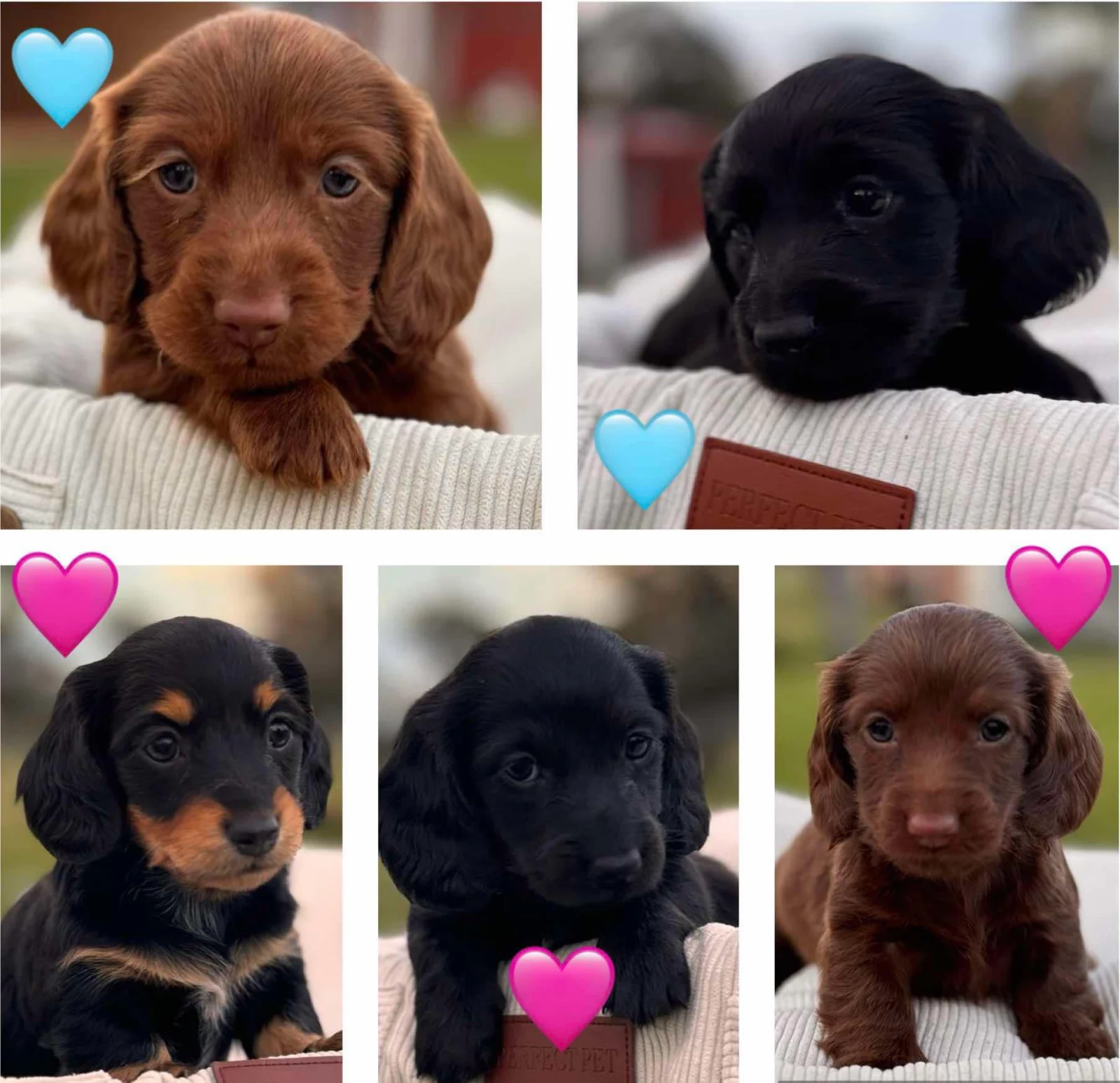 Longhair Miniature Dachshund puppies looking for loving forever homes. These beautiful puppies have been raised with care in a family environment and have had an excellent start to life. Mum is a solid black longhair and Dad is a chocolate and tan pied longhair. Both parents have clear DNA results, with full paperwork available to be sighted for peace of mind.