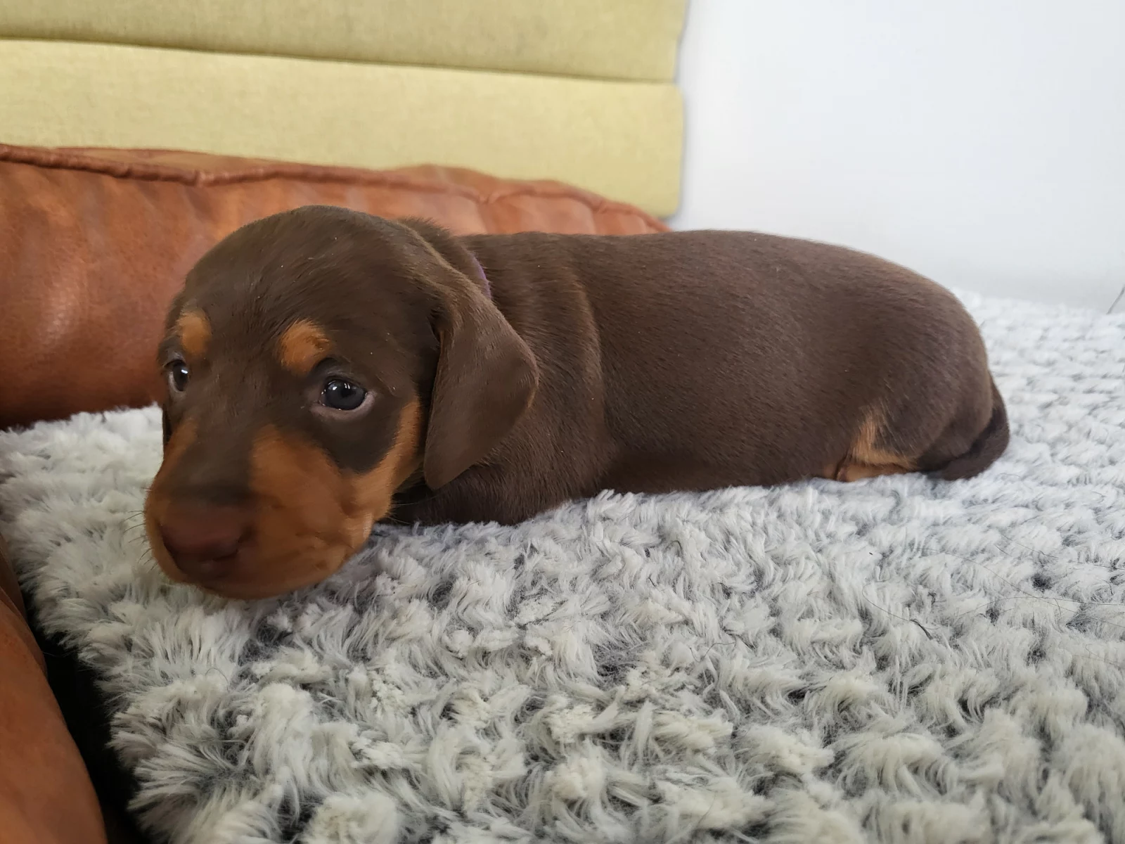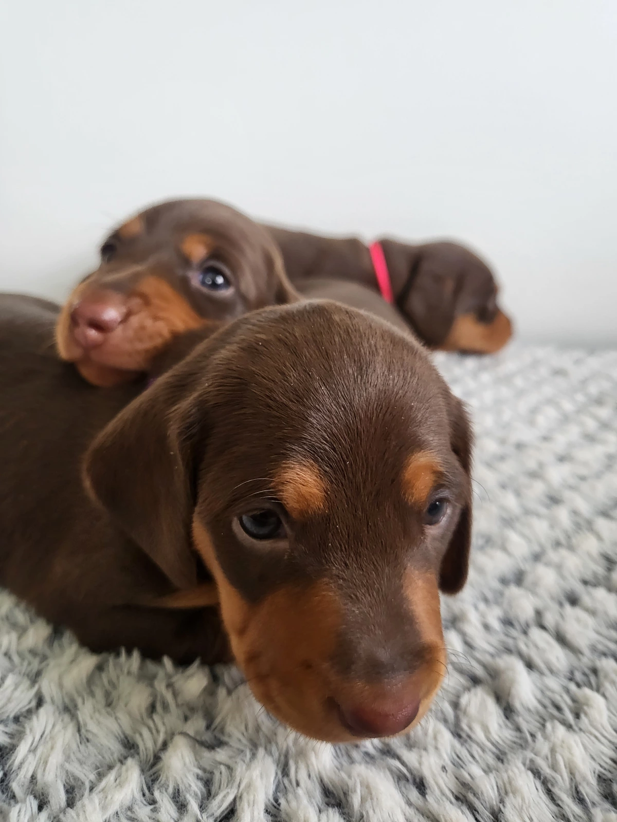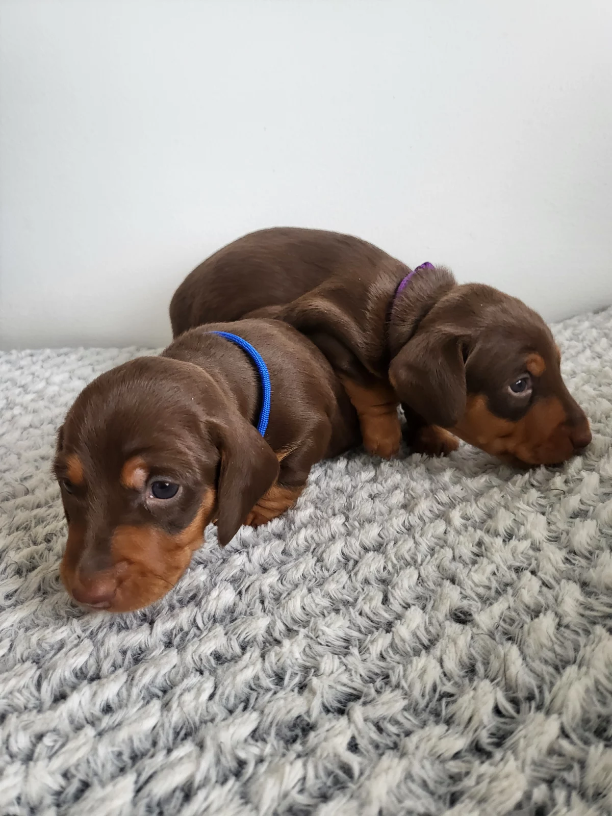 We have 2 gorgeous little chocolate and tan short-haired miniature dachshunds looking for their forever homes. This beautiful pair includes 1 x male (Blue) and 1 x female (Purple), both already showing sweet personalities and lovely colouring. They have been raised with care and plenty of attention in a family environment, giving them the best possible start to life.