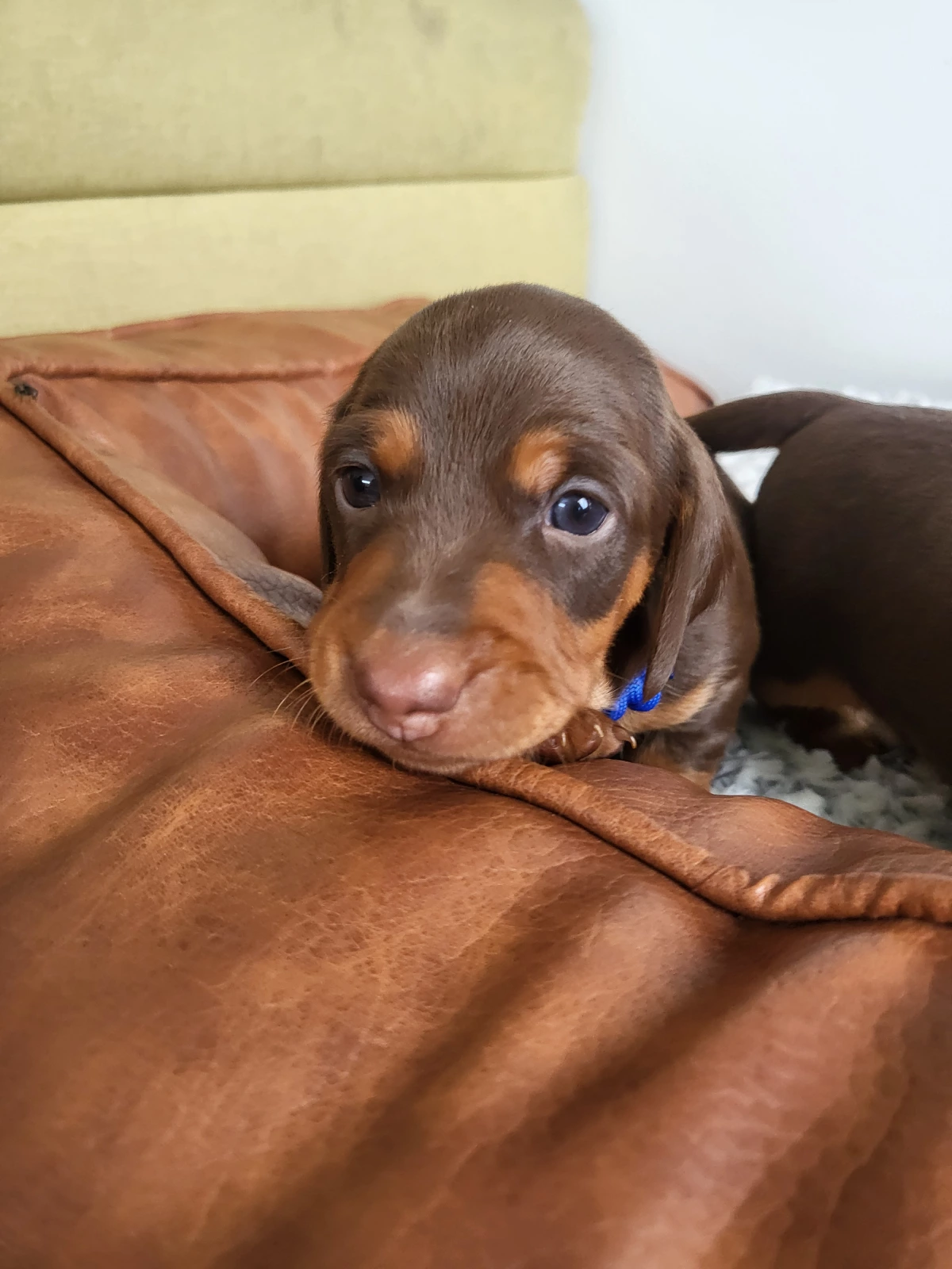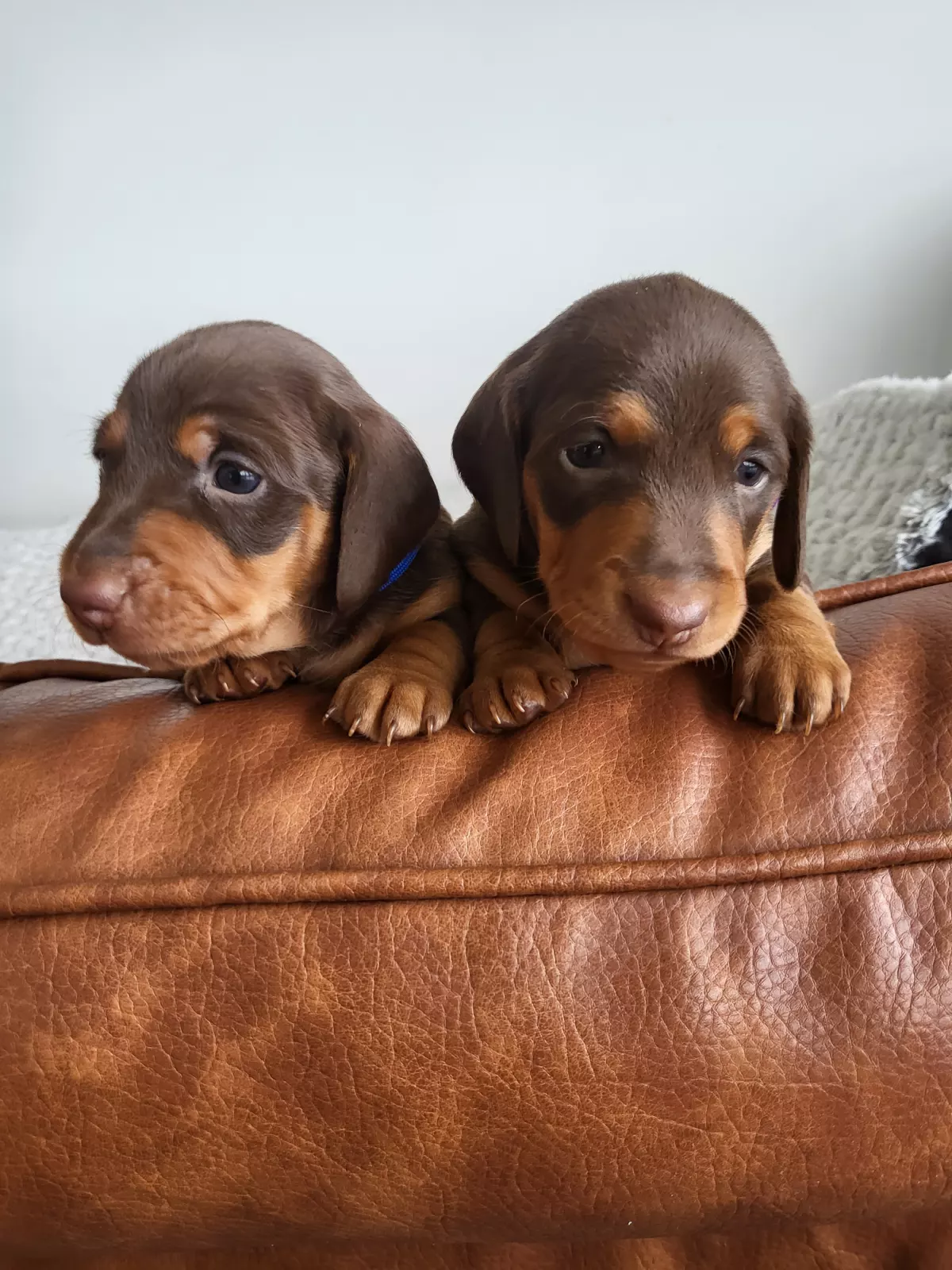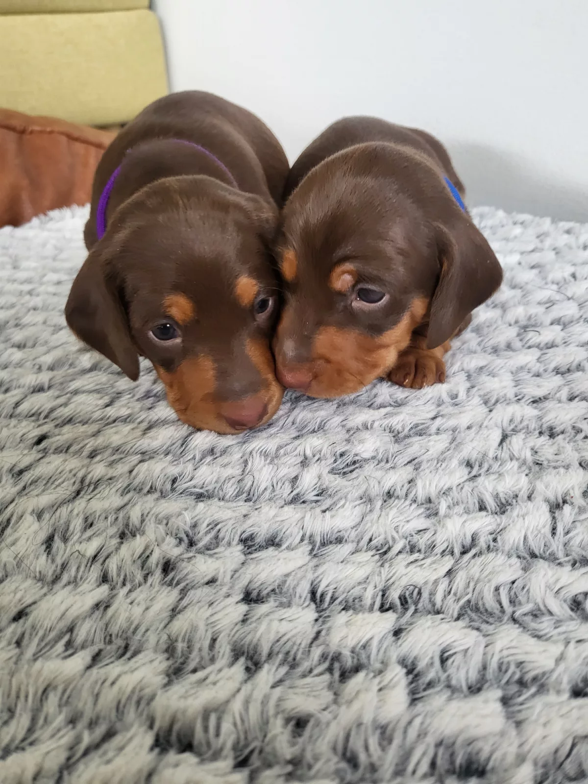 We have 2 gorgeous little chocolate and tan short-haired miniature dachshunds looking for their forever homes. This beautiful pair includes 1 x male (Blue) and 1 x female (Purple), both already showing sweet personalities and lovely colouring. They have been raised with care and plenty of attention in a family environment, giving them the best possible start to life.