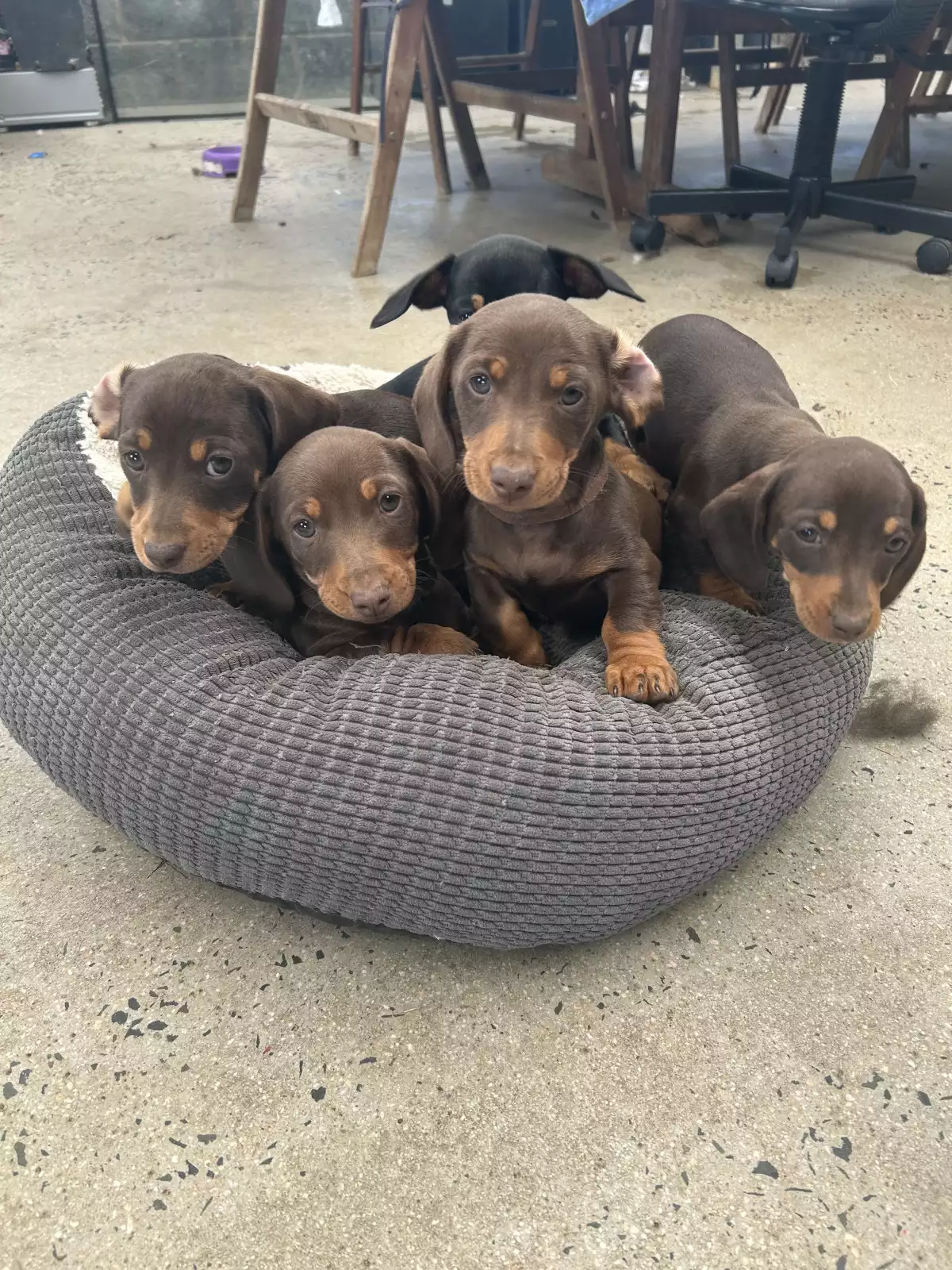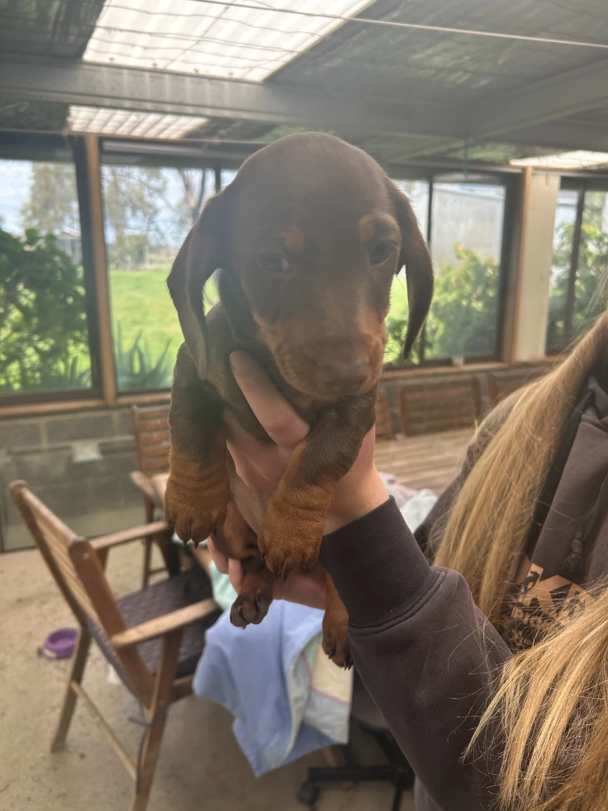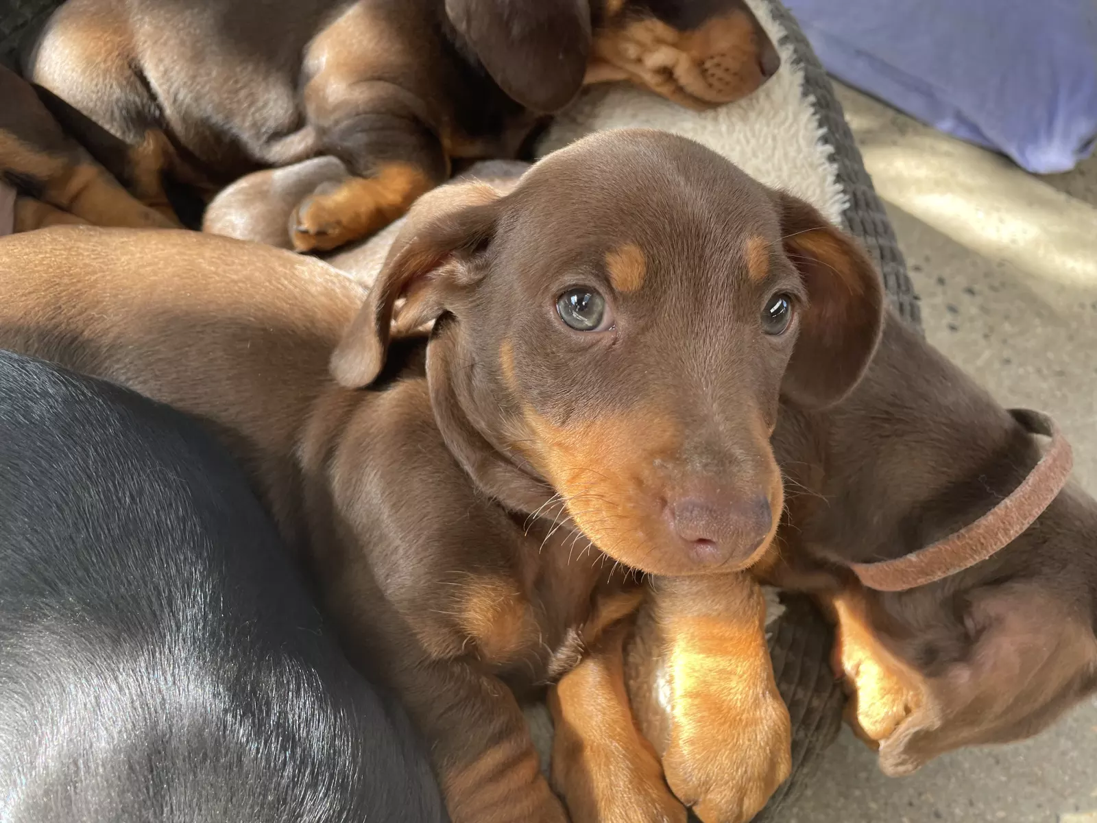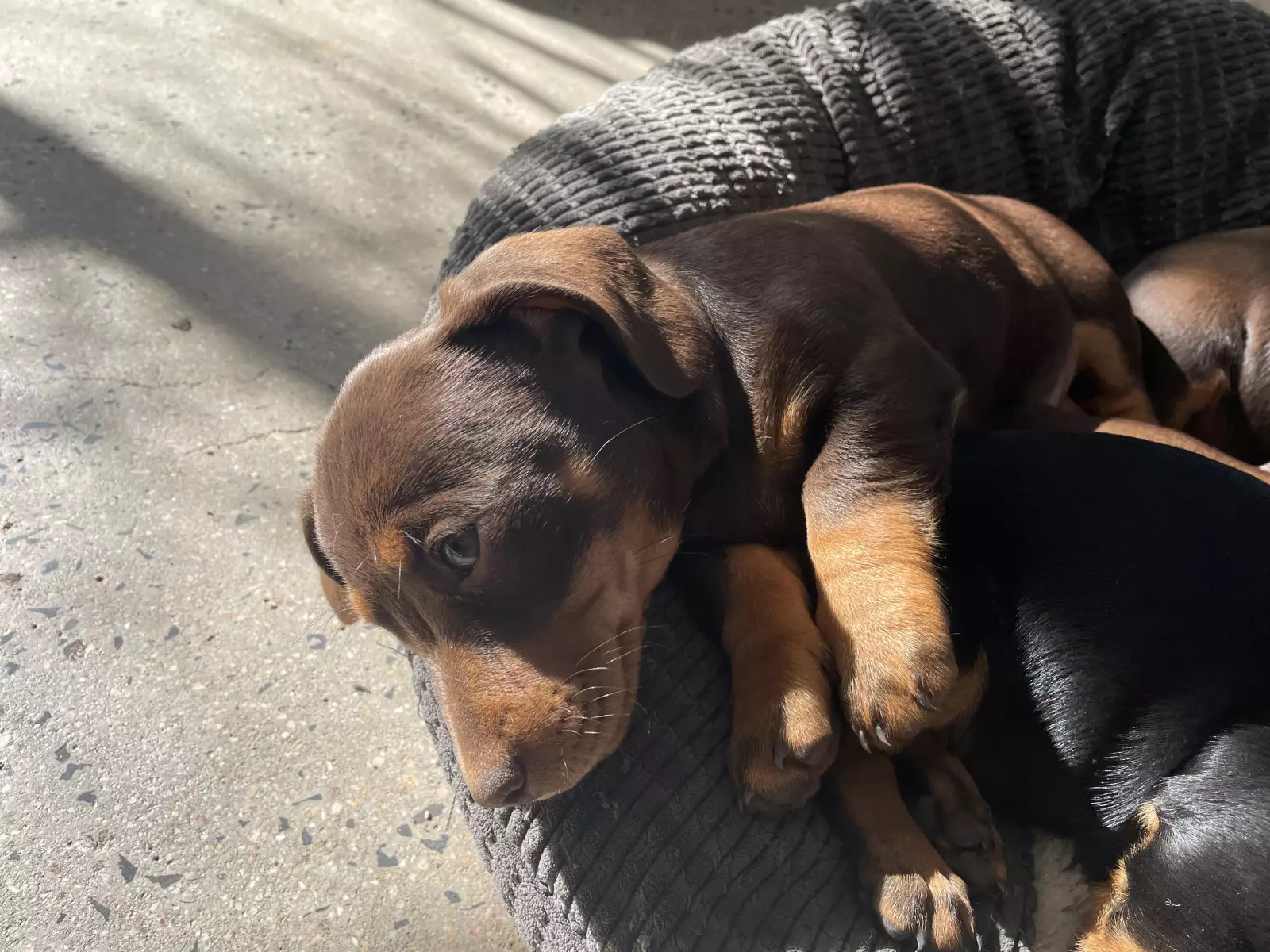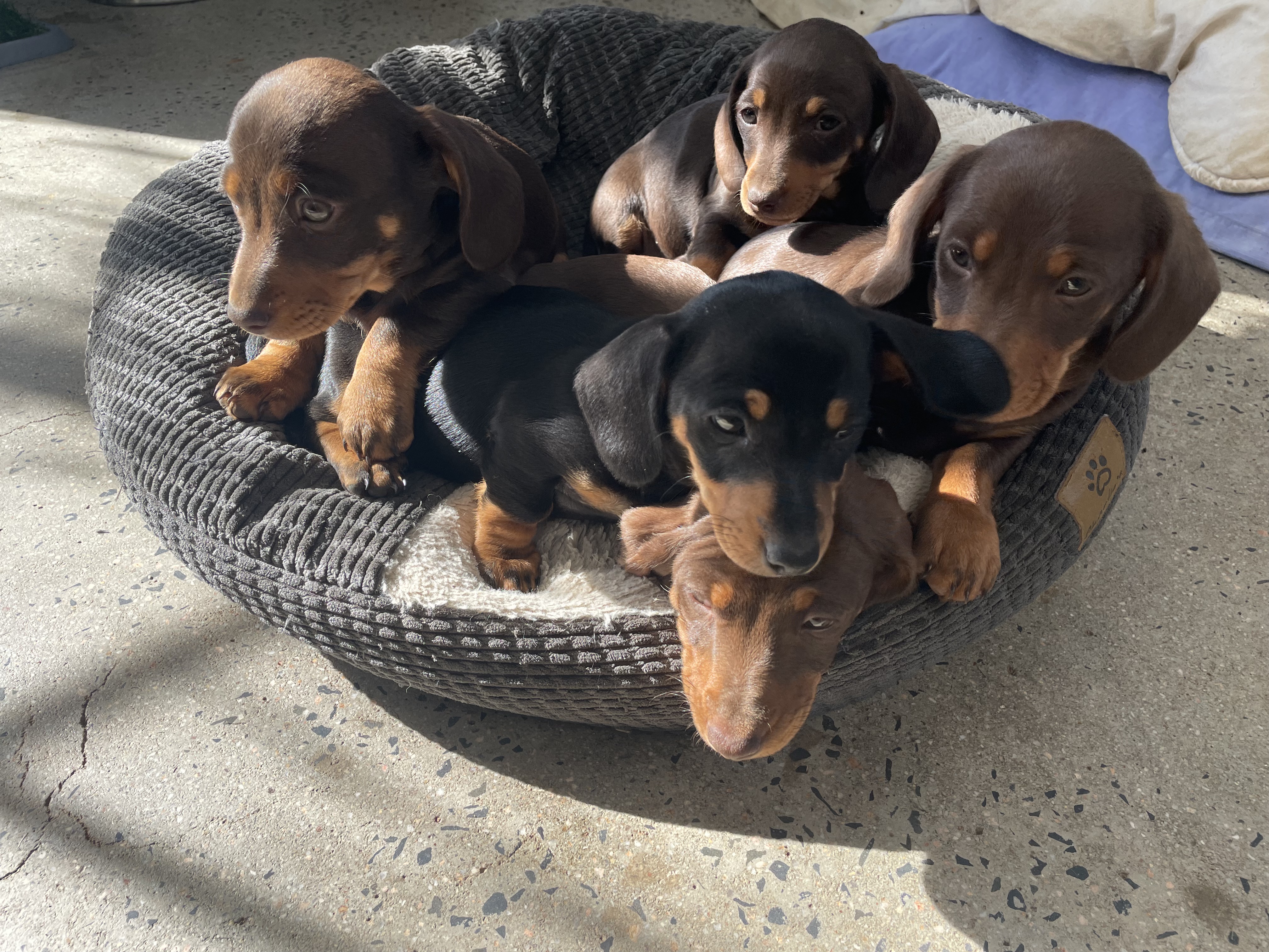 We have 4 gorgeous miniature Dachshund puppies for sale, 1 Black and Tan Female and 3 Chocolate and Tan Males born on the 18th July 2025.
