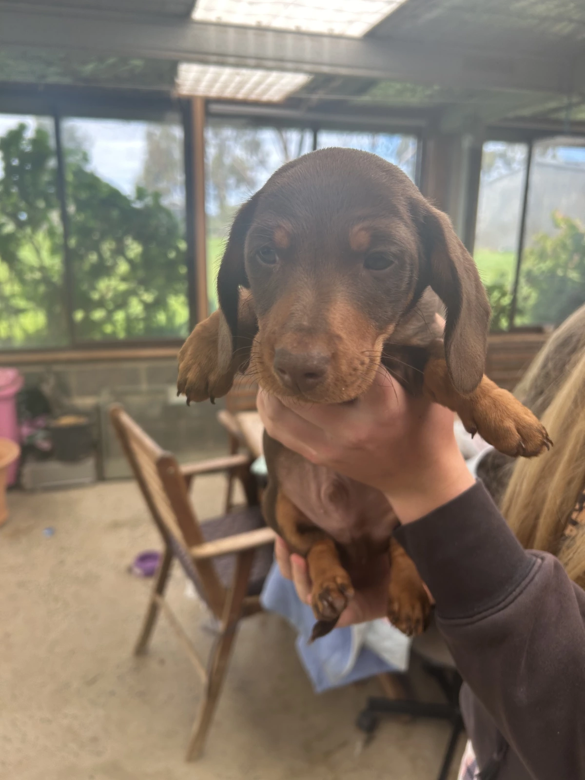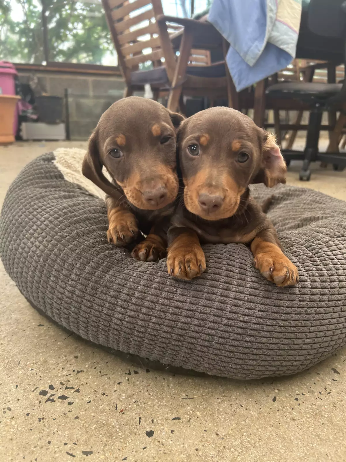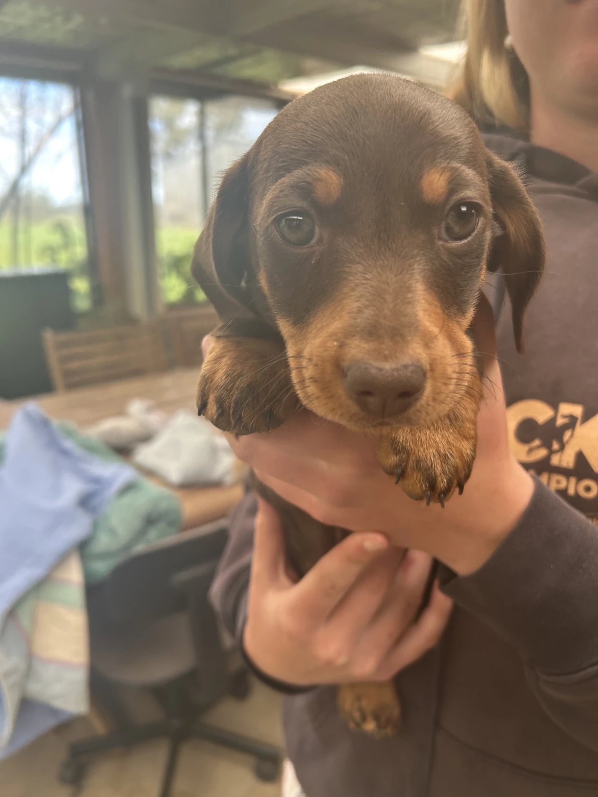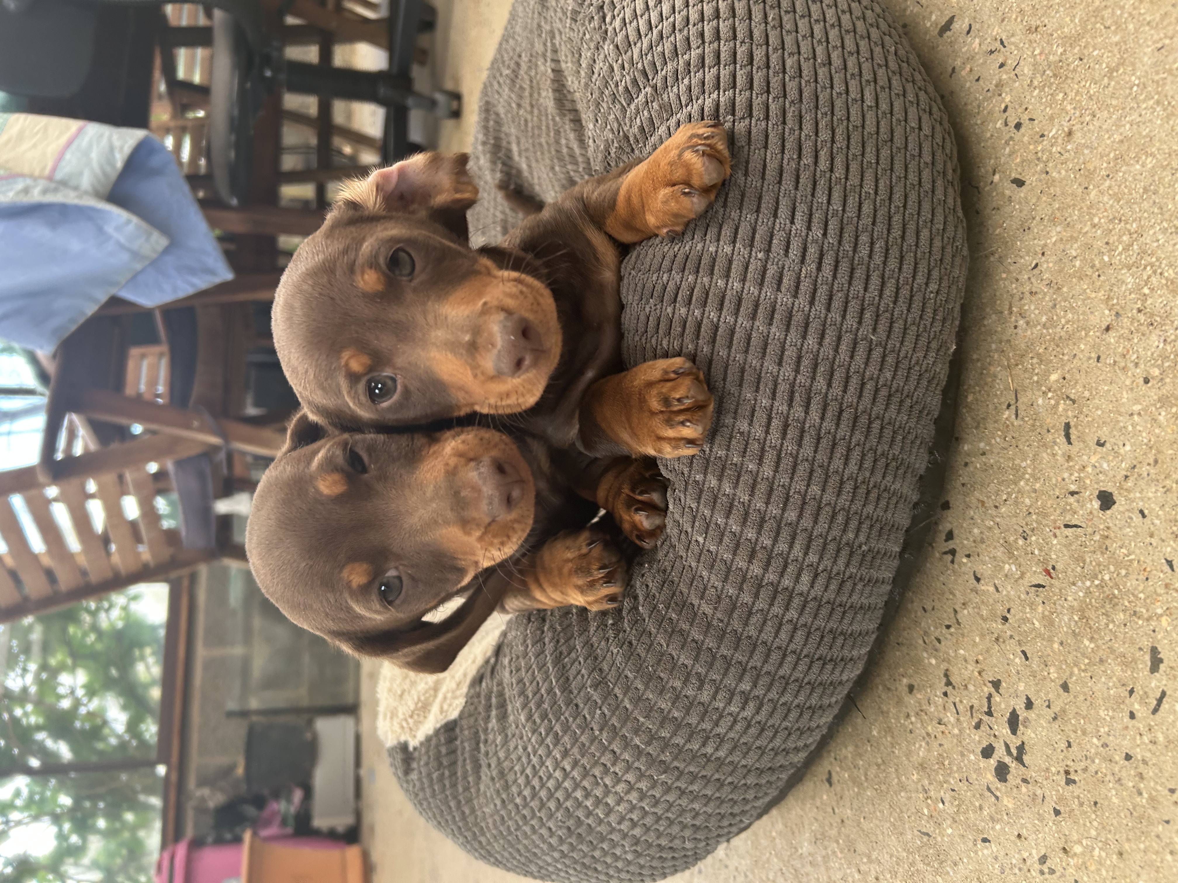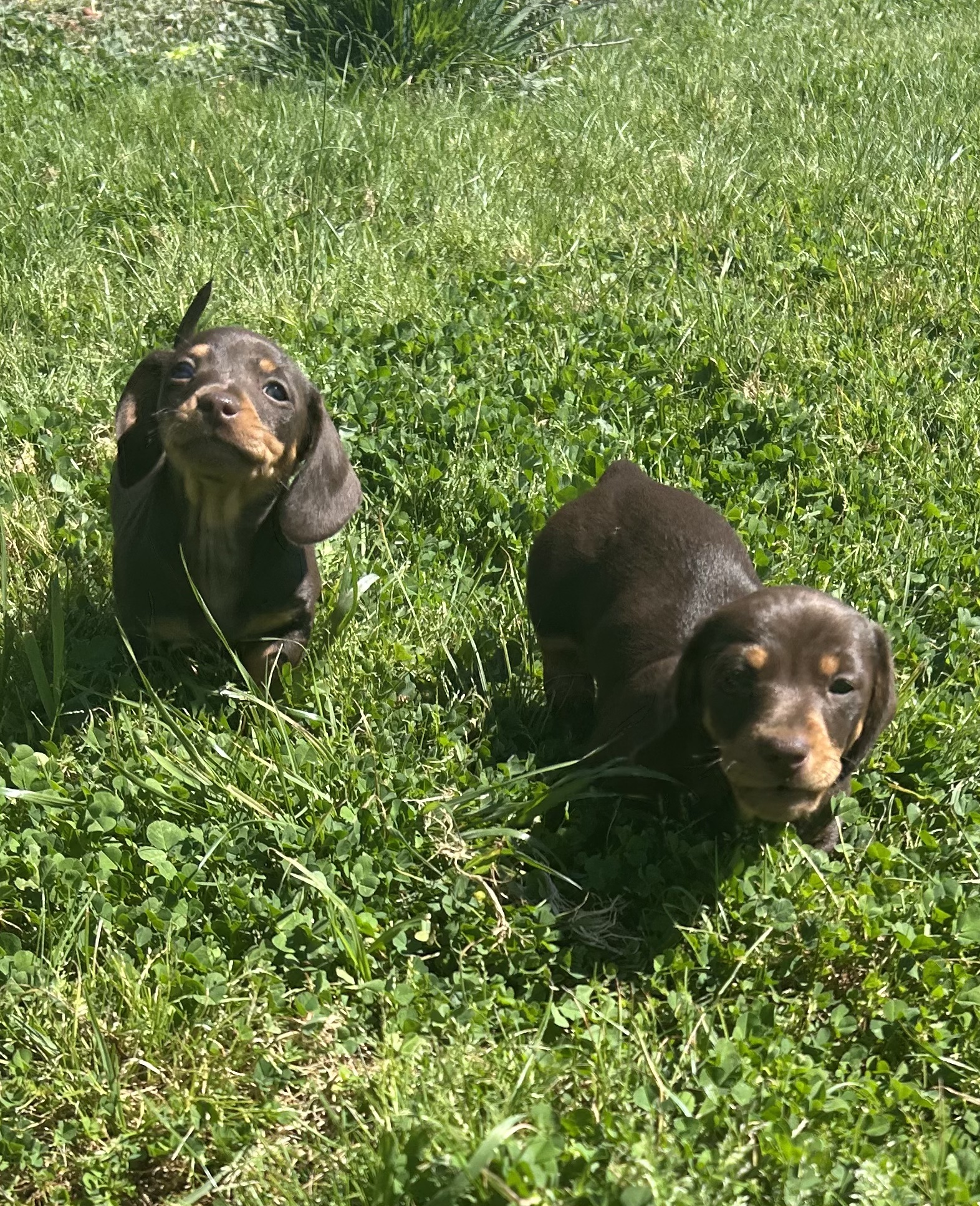 We have 4 gorgeous miniature Dachshund puppies for sale, 1 Black and Tan Female and 3 Chocolate and Tan Males born on the 18th July 2025.
