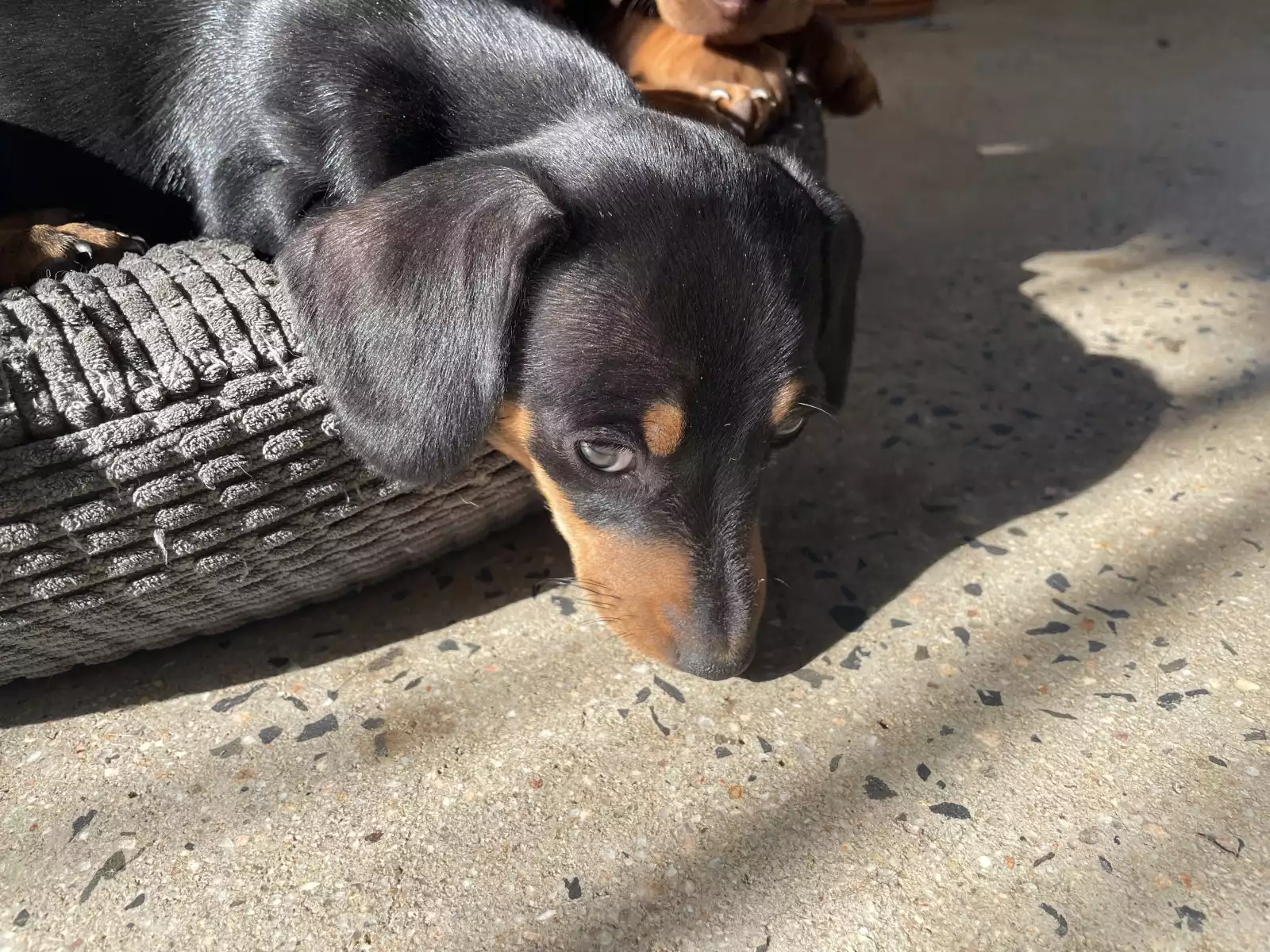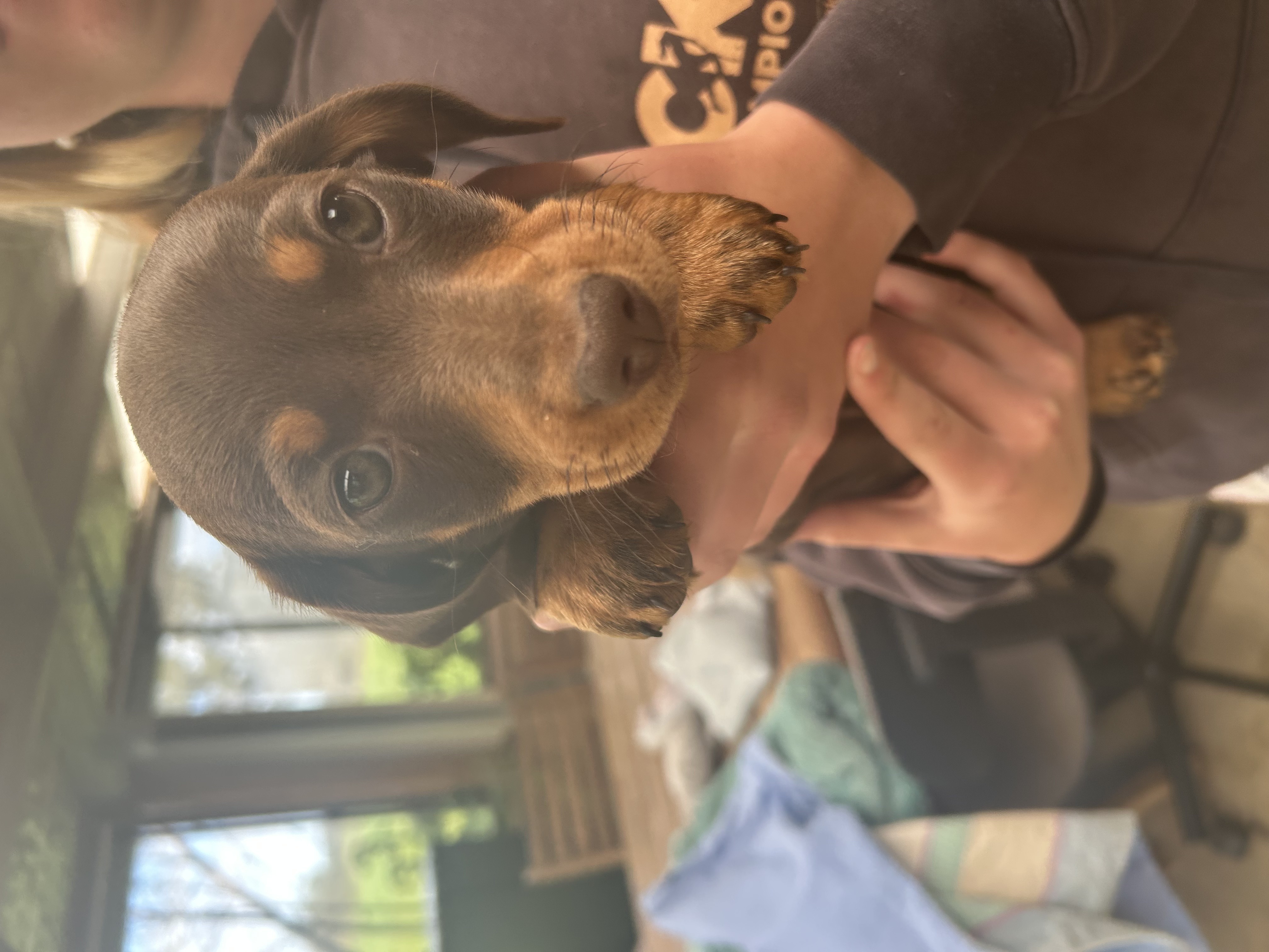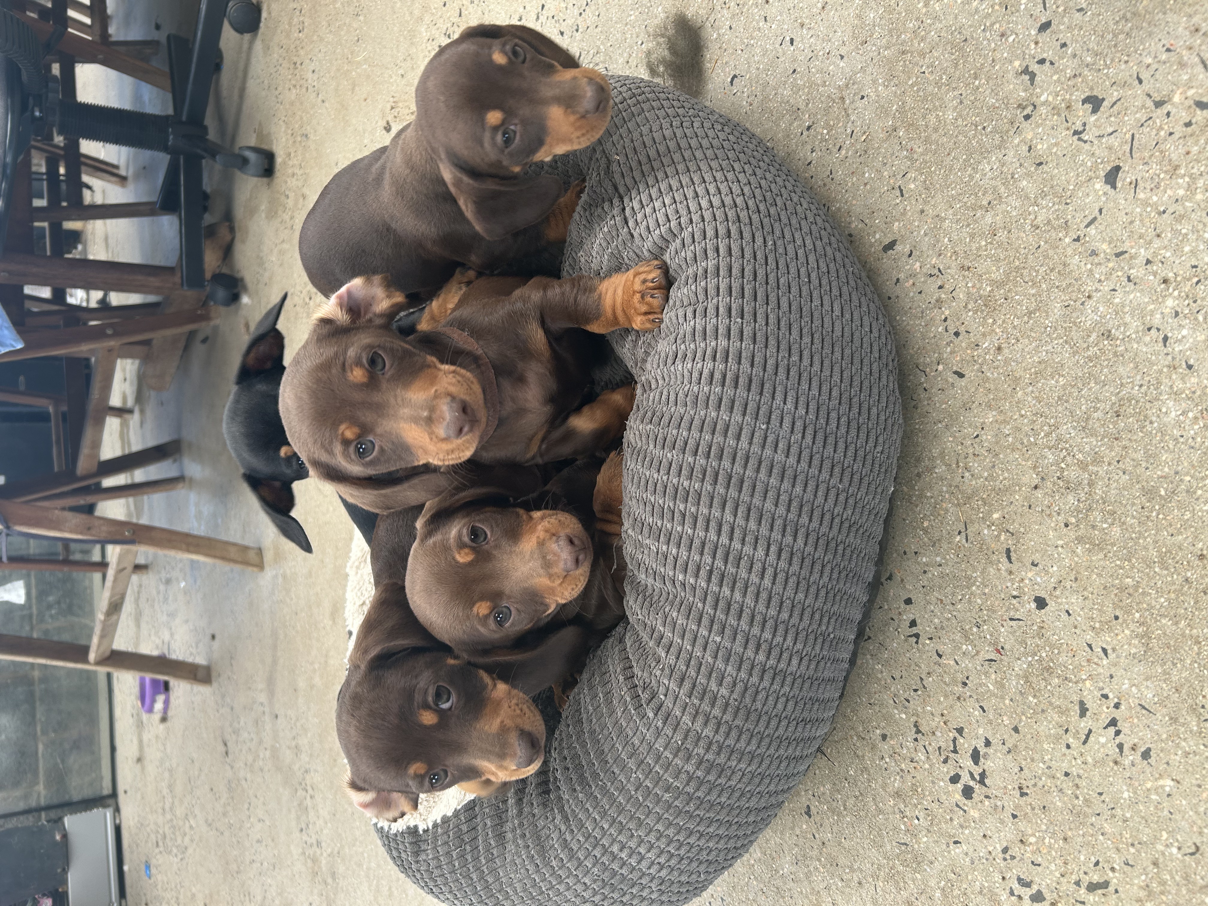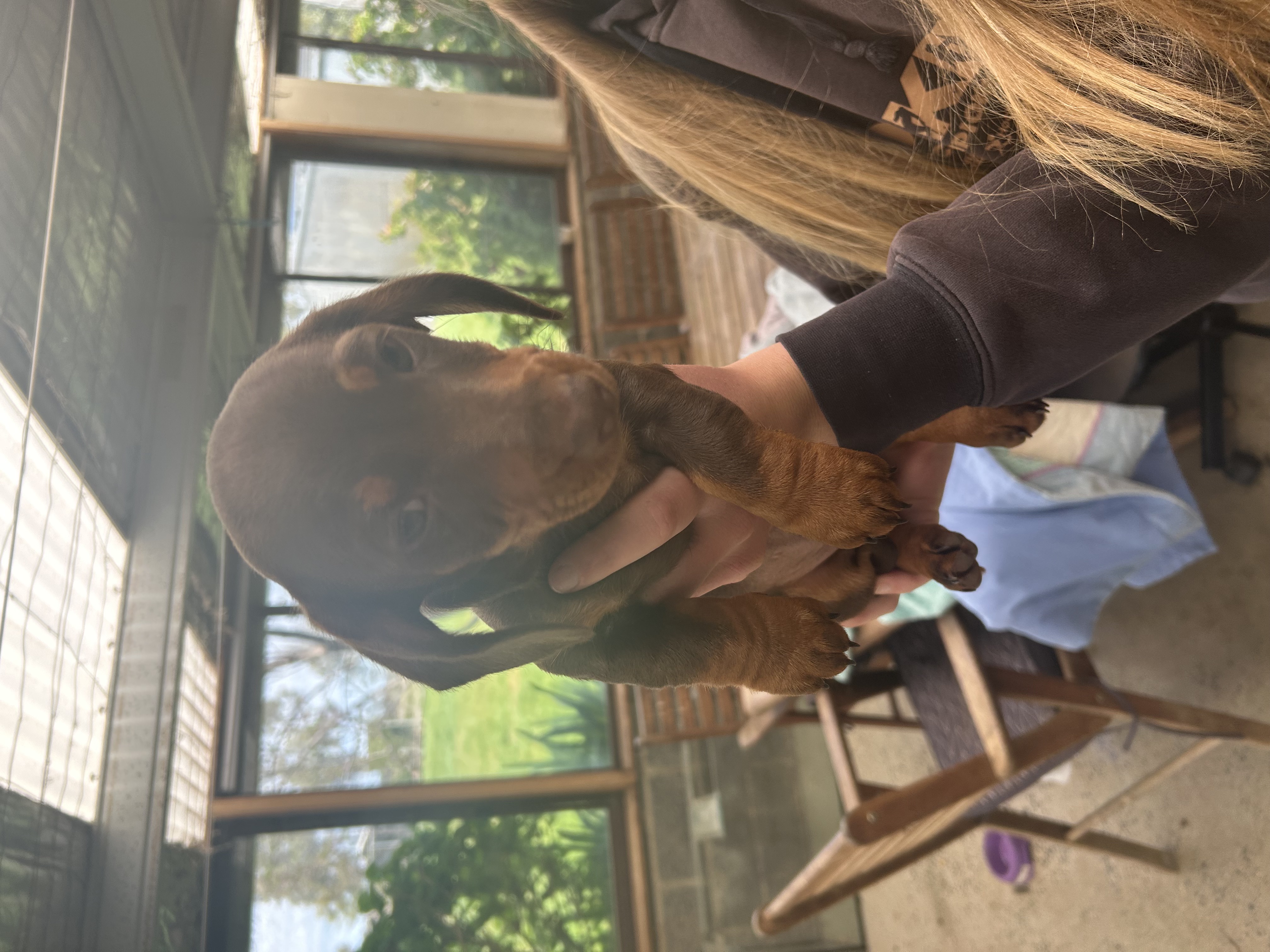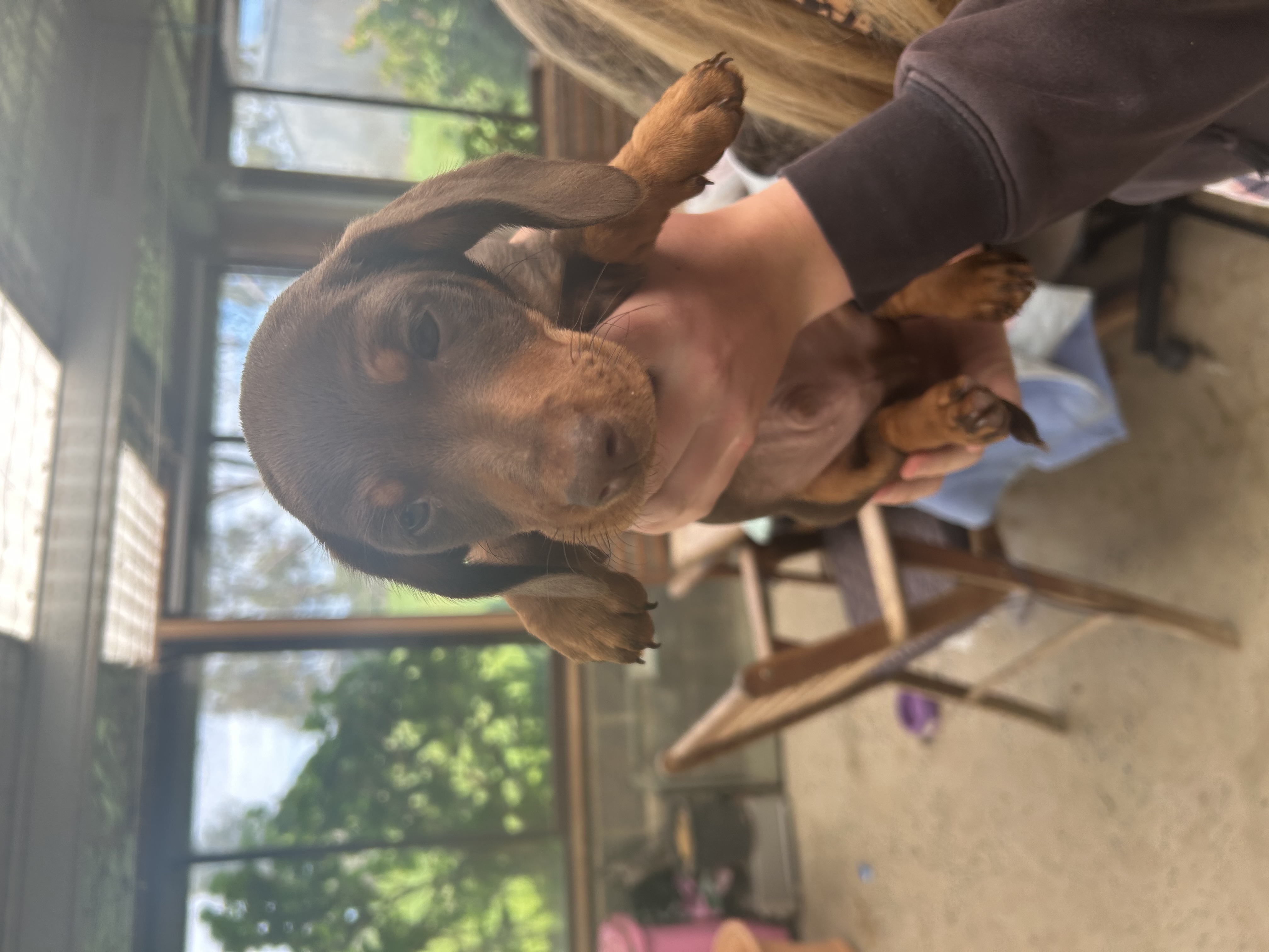 We have 4 gorgeous miniature Dachshund puppies for sale, 1 Black and Tan Female and 3 Chocolate and Tan Males born on the 18th July 2025.