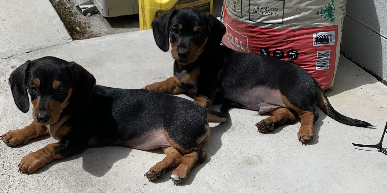 Both puppies are fully vaccinated and wormed and are happy, healthy, and growing well. Mum is a red miniature dachshund, and Dad is a black and tan standard, giving them a lovely mix of size, structure, and personality. There is **ffected. Dapple is in the bloodline, as Mum’s mum is a dapple, which has resulted in some unique markings.