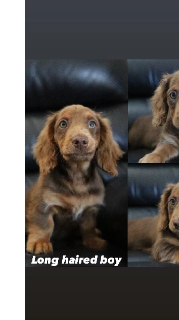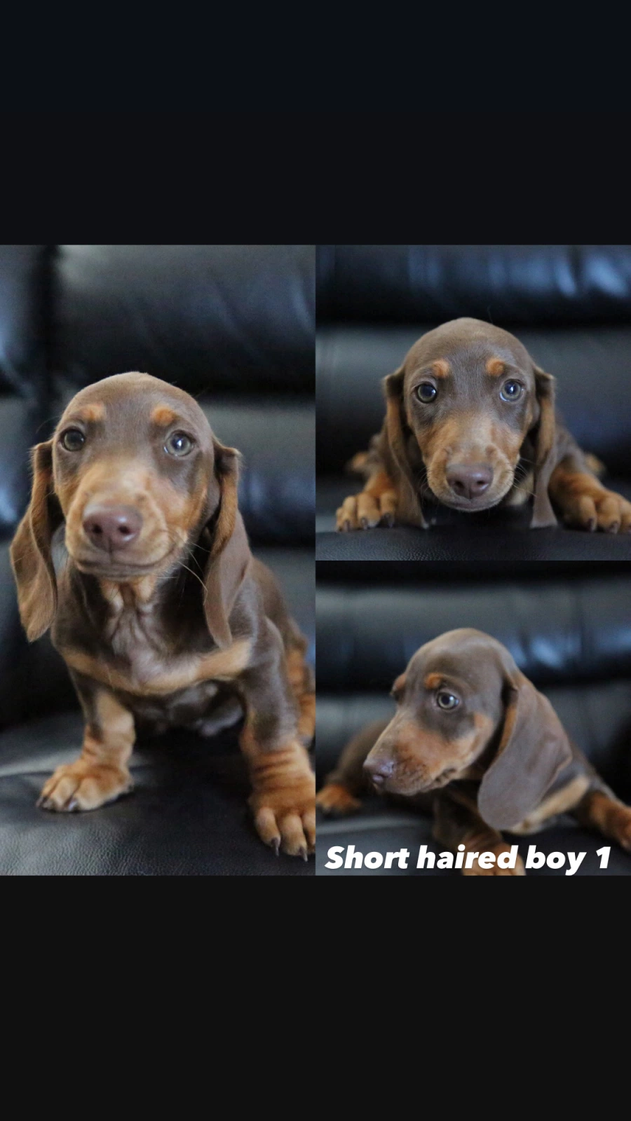 Chocolate & tan short haired mini dachshunds.