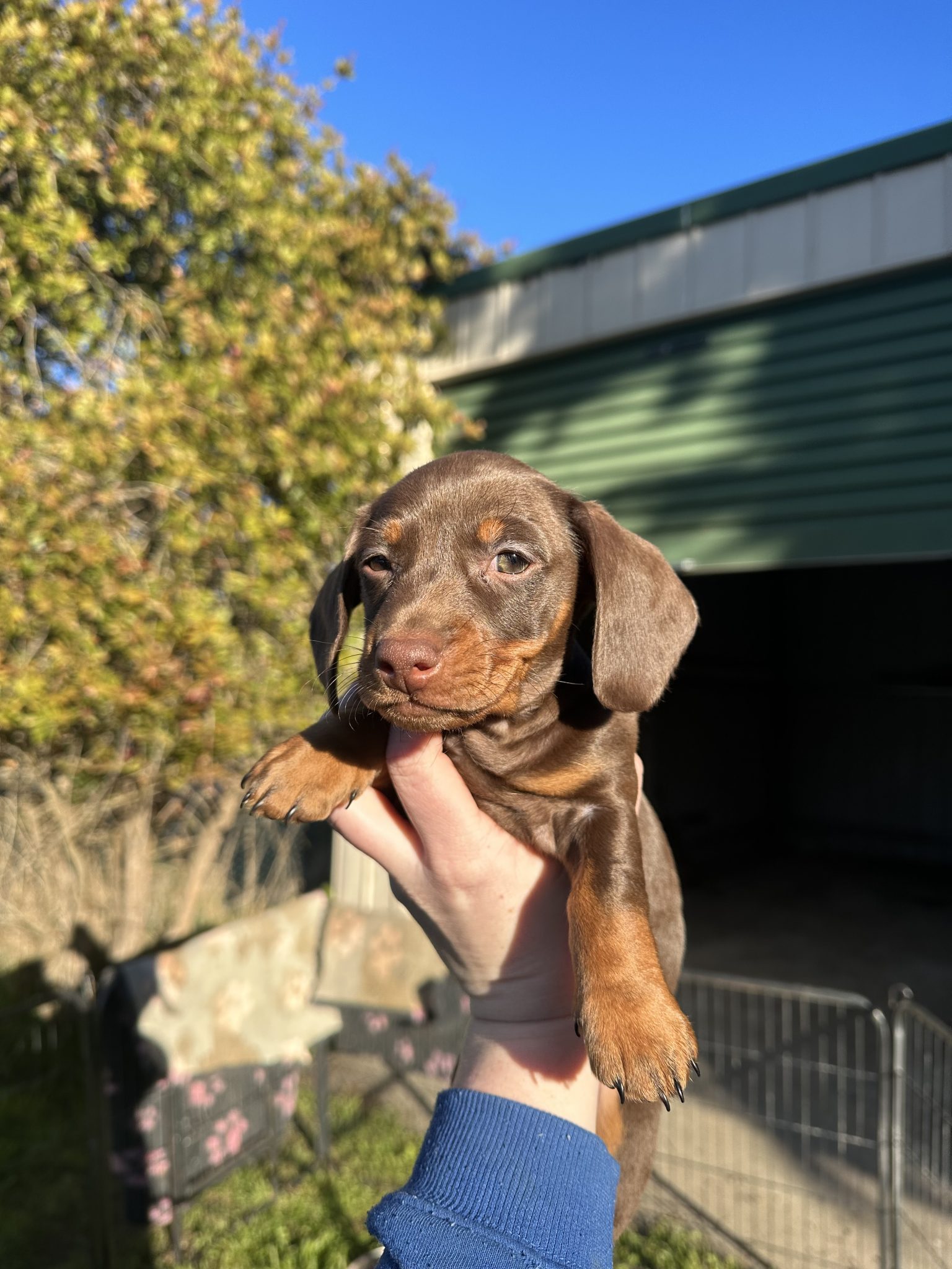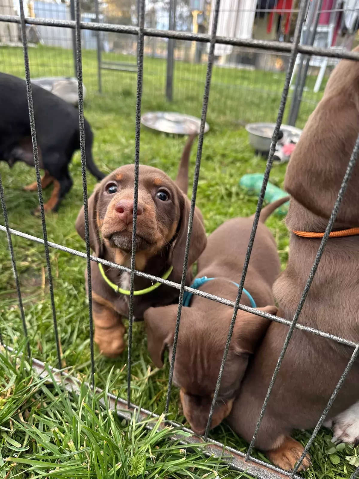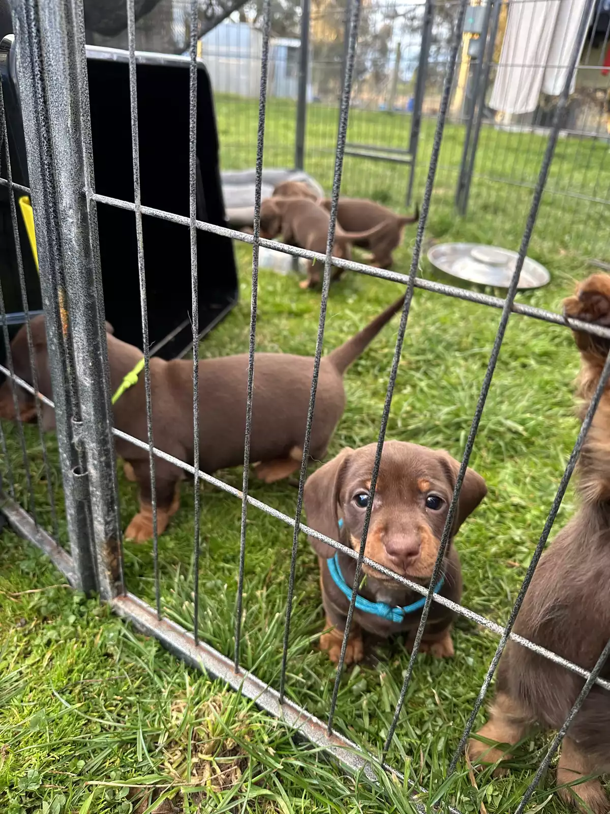 4 beautiful male miniature dachshunds chocolate and tan in colour with a white spot on some of there chests.