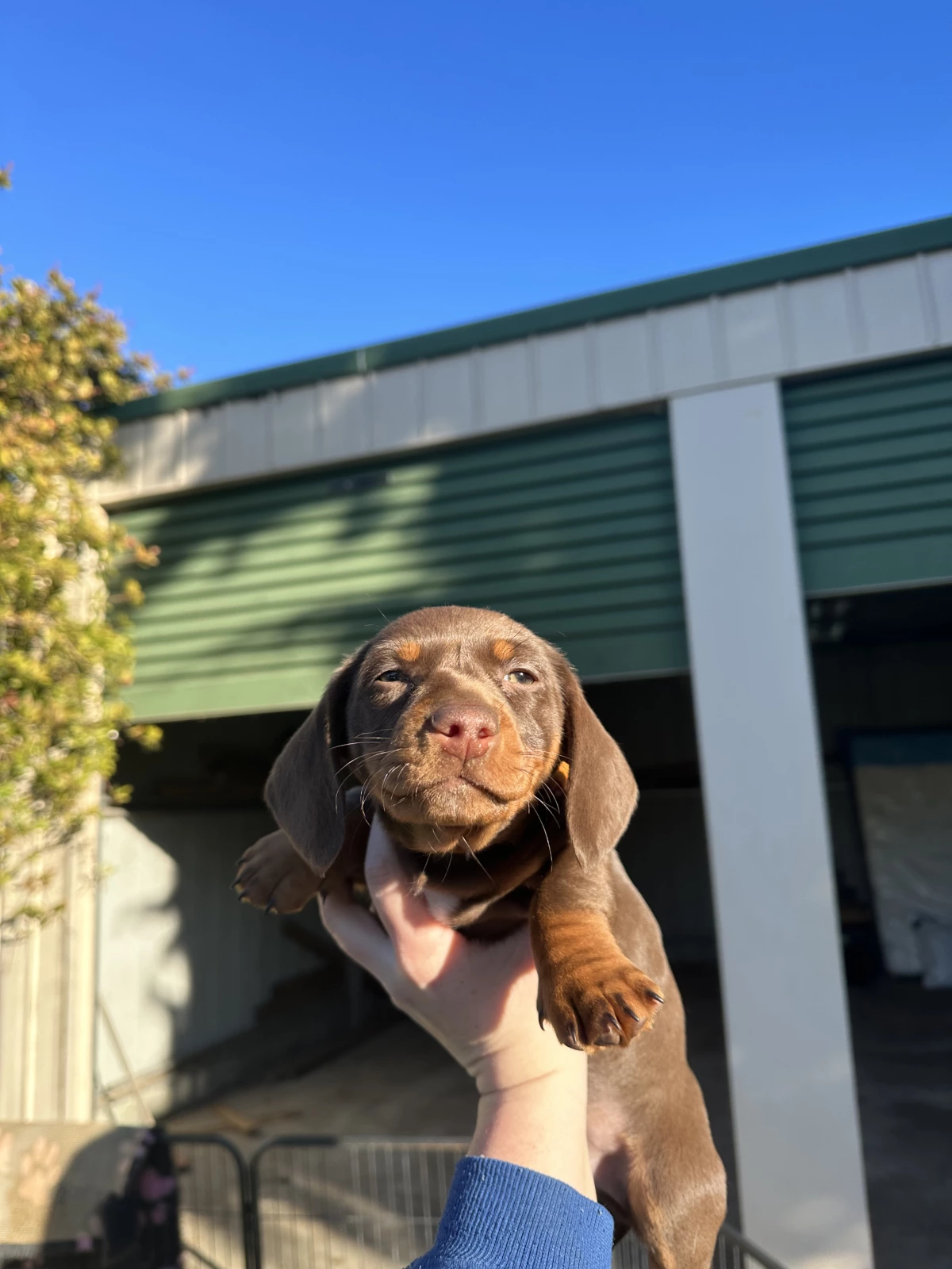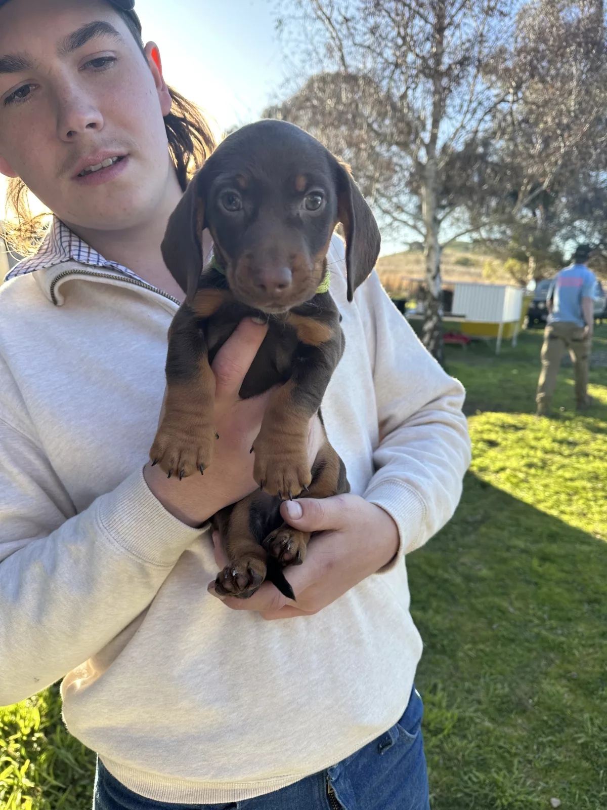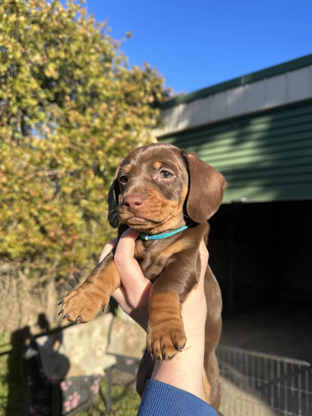 4 beautiful male miniature dachshunds chocolate and tan in colour with a white spot on some of there chests.
