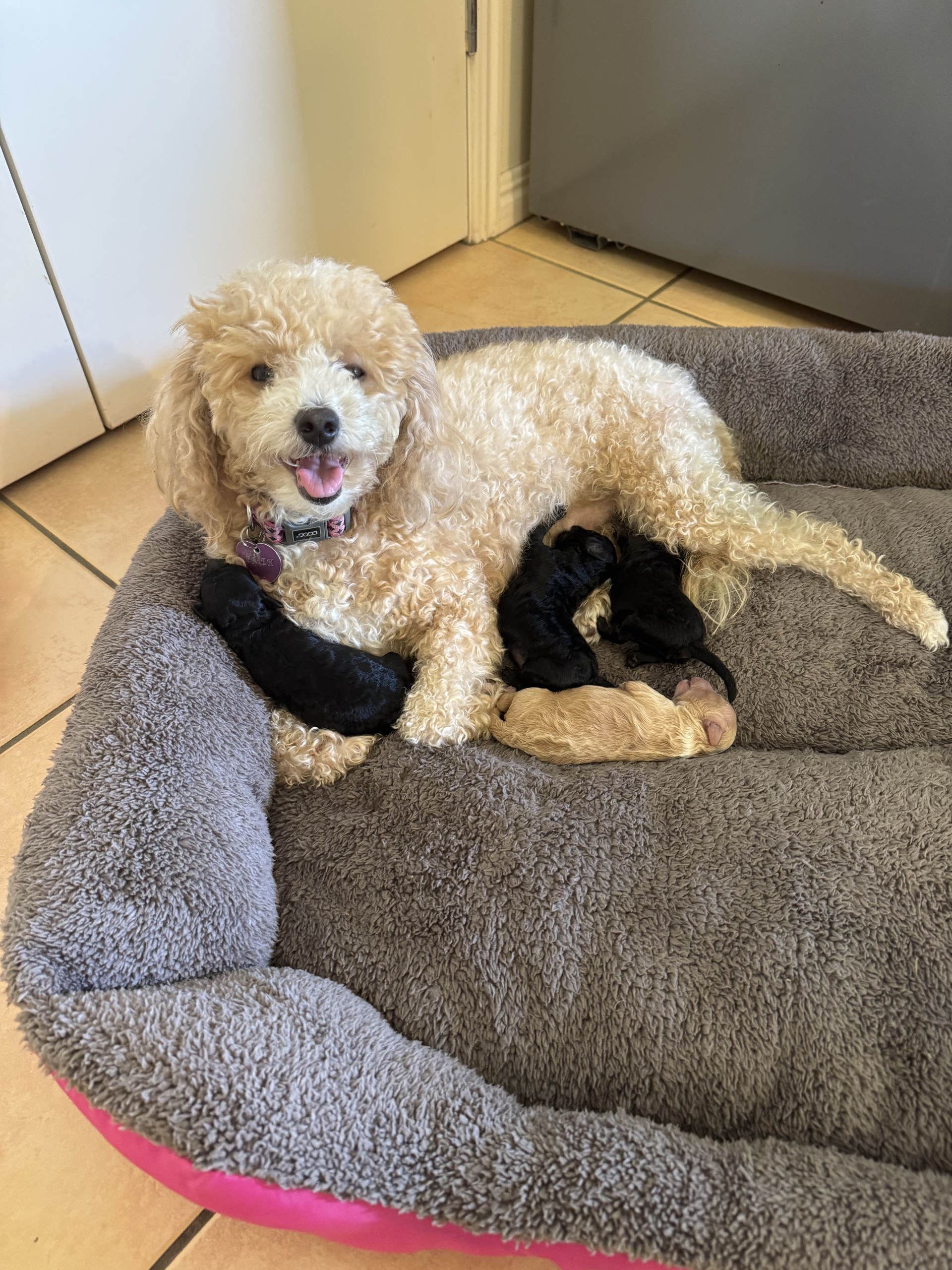 We have 3 Boys ready to bring immense joy and affection into their new homes! This little trio displays a lovely range of colouration: 1 Caramel, 1 All Black, and 1 Black with white markings. These colours often produce gorgeous, fluffy, low-shedding coats typical of the Moodle crossbreed, though regular grooming is essential.