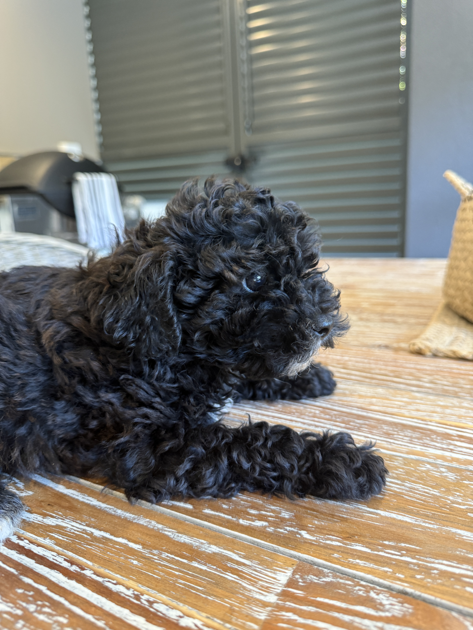 This handsome Toy Moodle black male is ready immediately for his new forever home! This popular Maltese x Toy Poodle crossbreed ensures a small, manageable size combined with the breed's signature affection, intelligence, and typically low-shedding coat. This Moodle is guaranteed to be a devoted and engaging companion, though remember that consistent grooming is vital for his beautiful black coat.