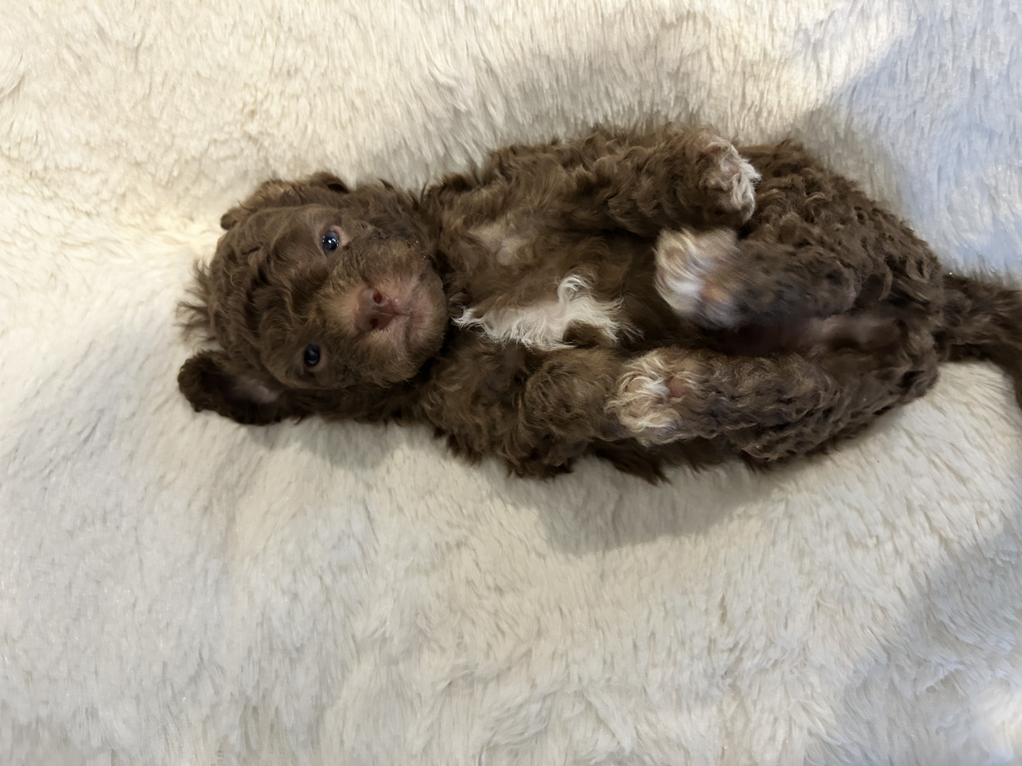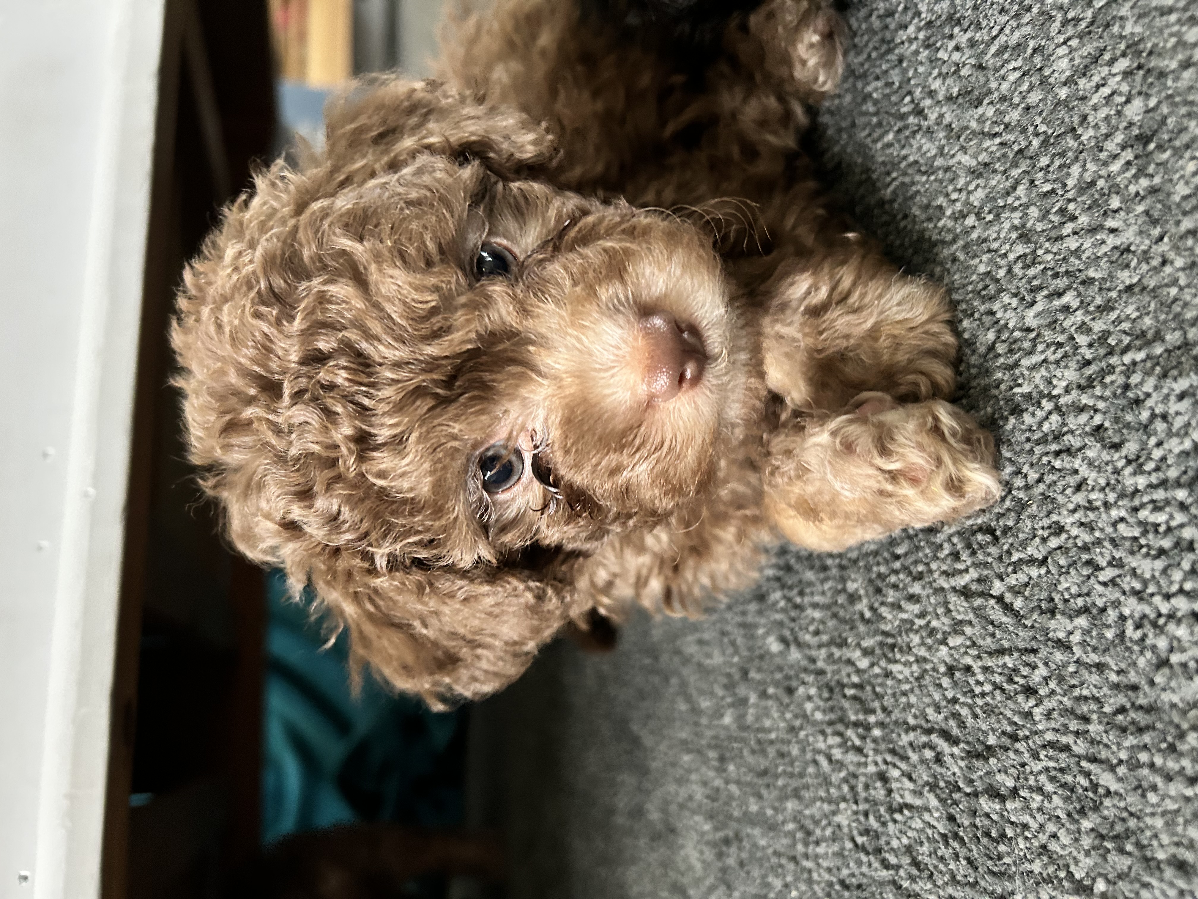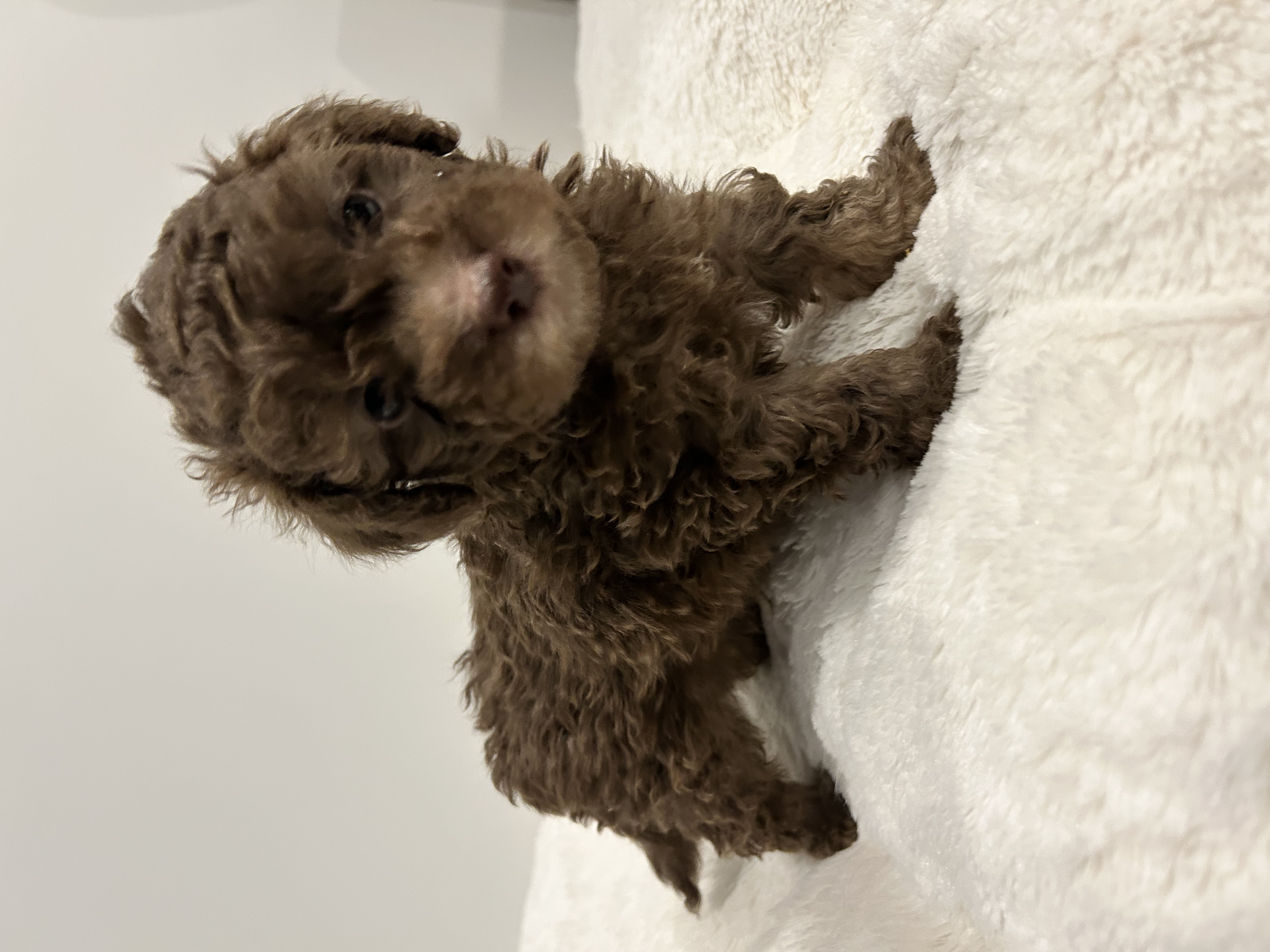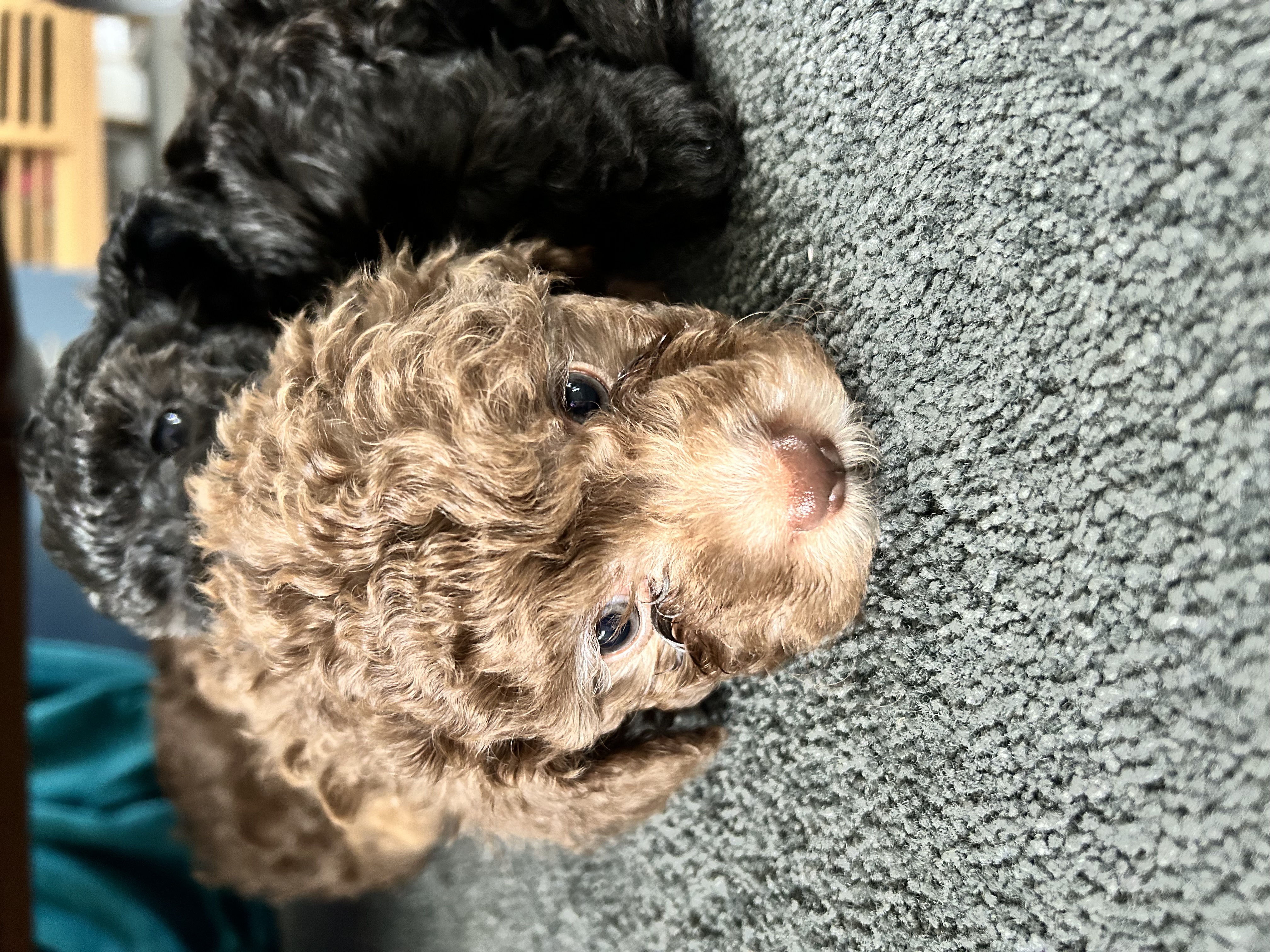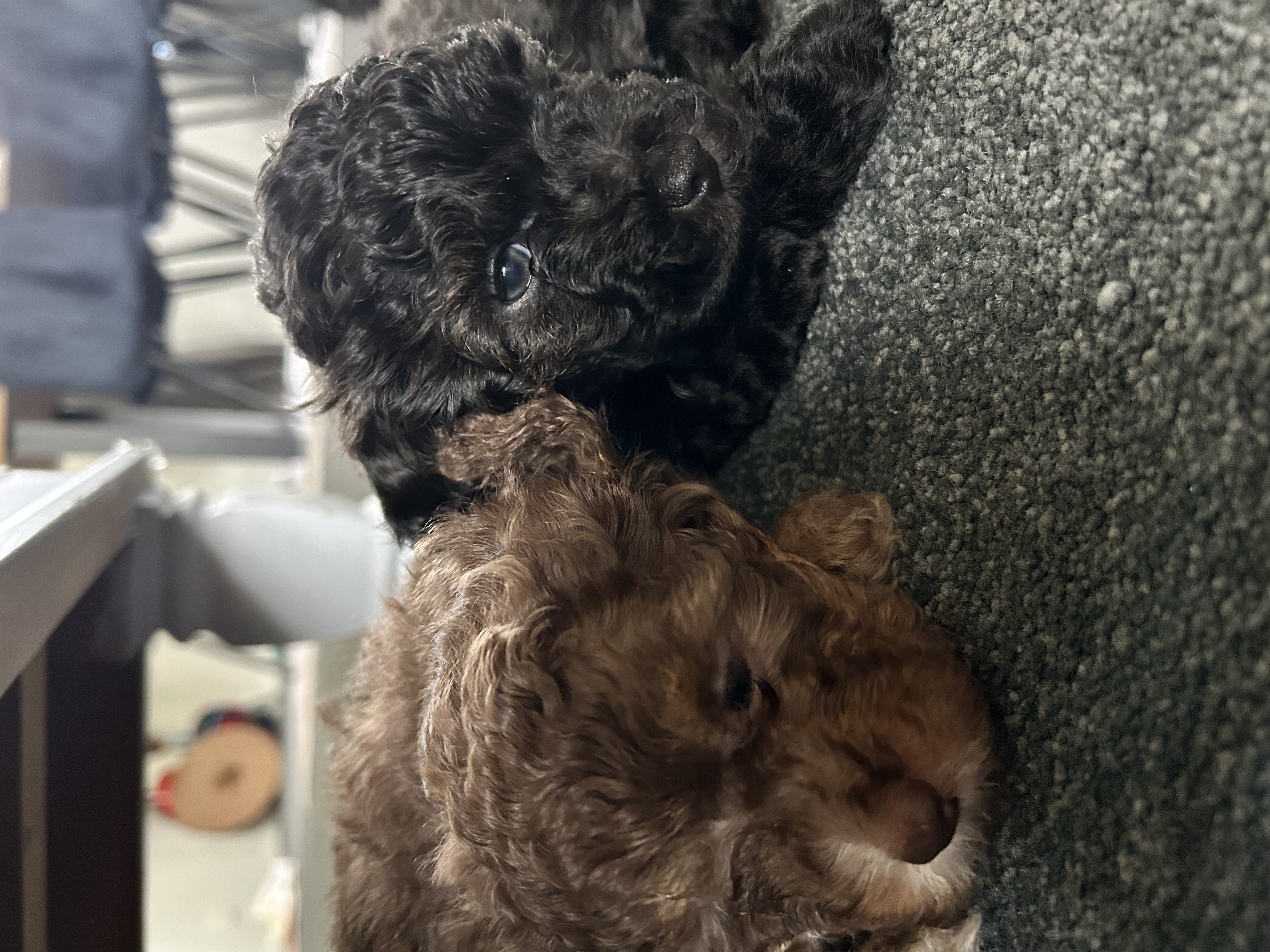 - 2 male Moodle puppies. One black with dark brown highlights and the other is chocolate with blue eyes.