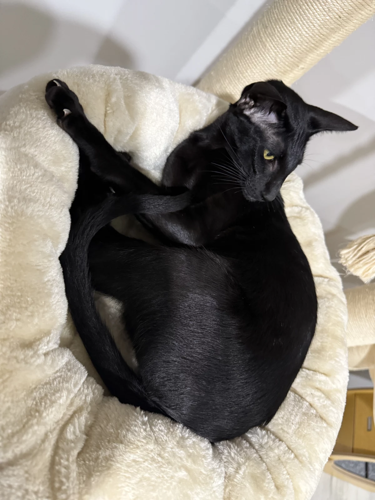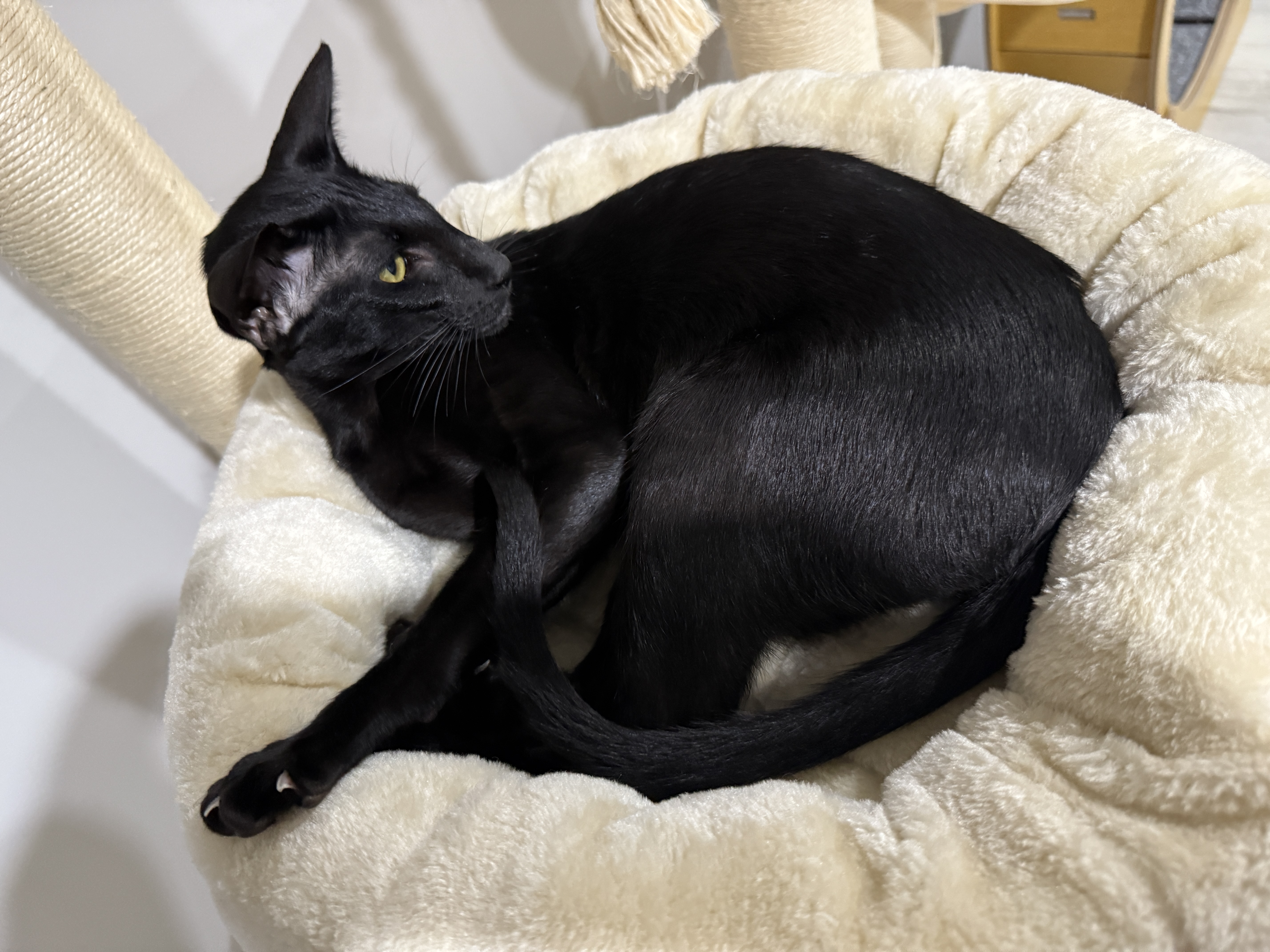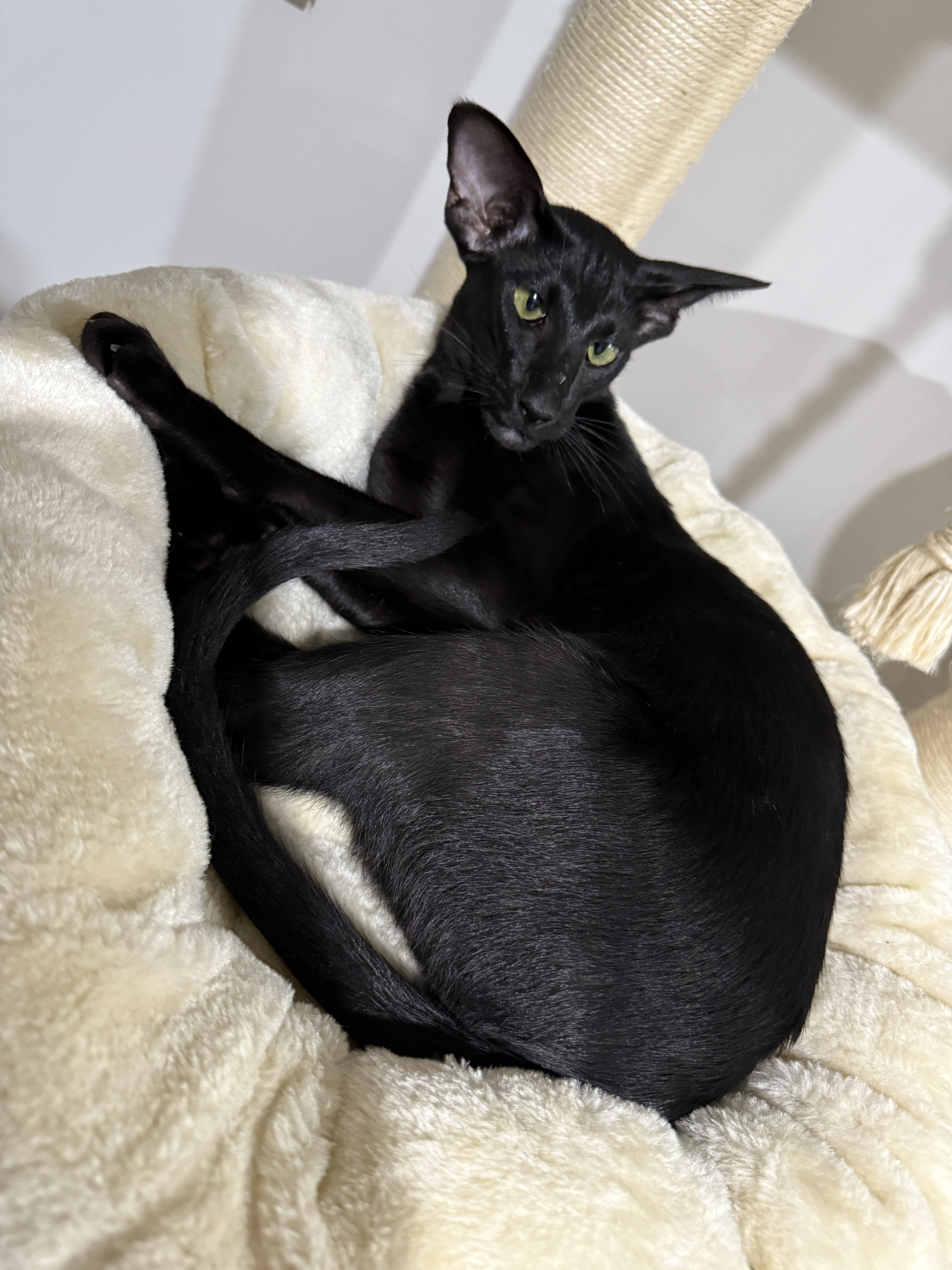 We have a 9 month old desexed, purebred Oriental Shorthair kitten that needs to find his perfect home. He is a sleek, elegant, black boy with beautiful green eyes and a playful, very loving personality. He is very much a people cat and would love his own person to cuddle with. He is litter trained, microchipped and up to date with vaccinations. His ideal home would be as a solo companion cat and indoors only. Papers are available
