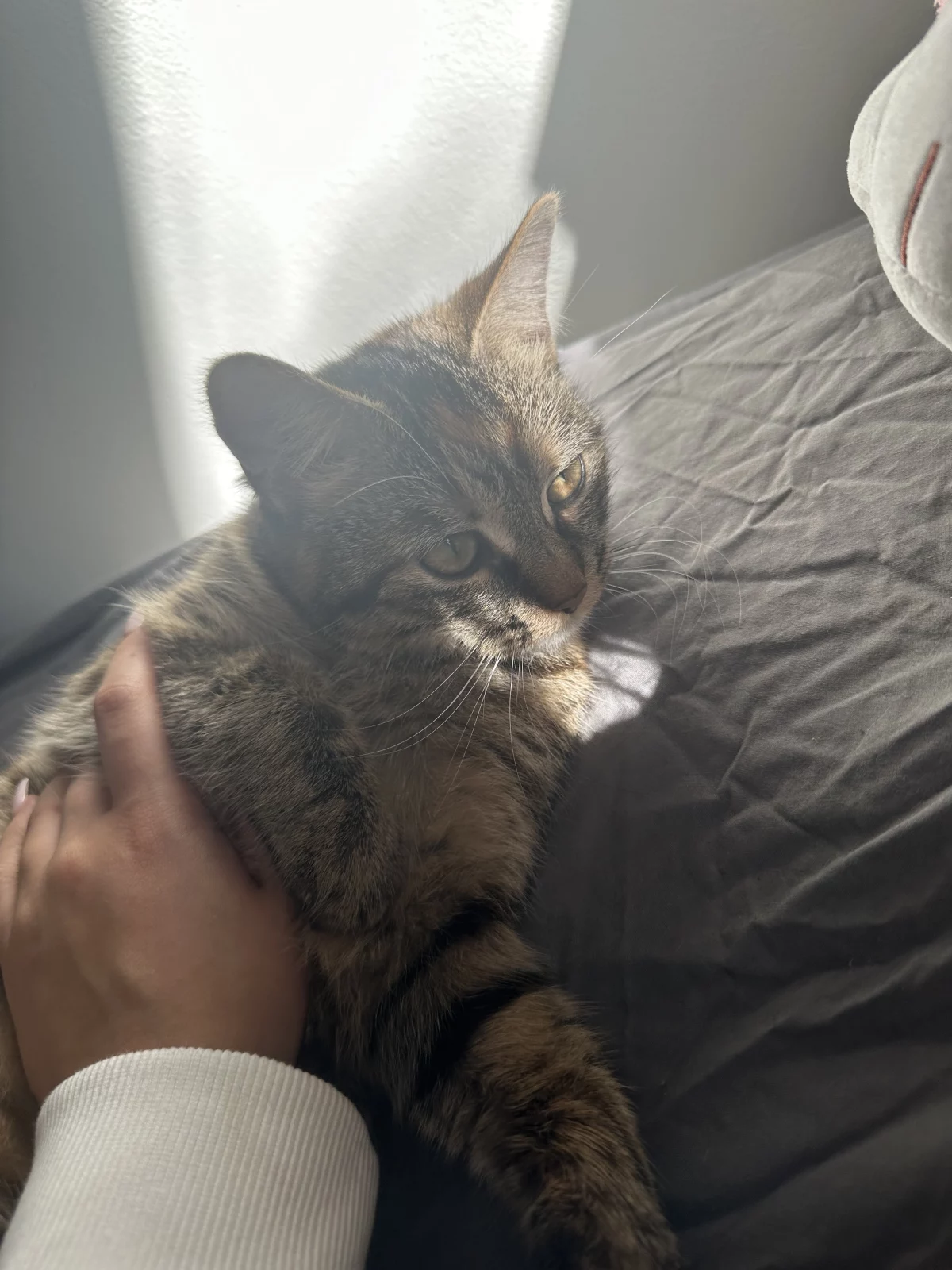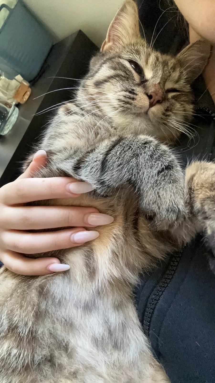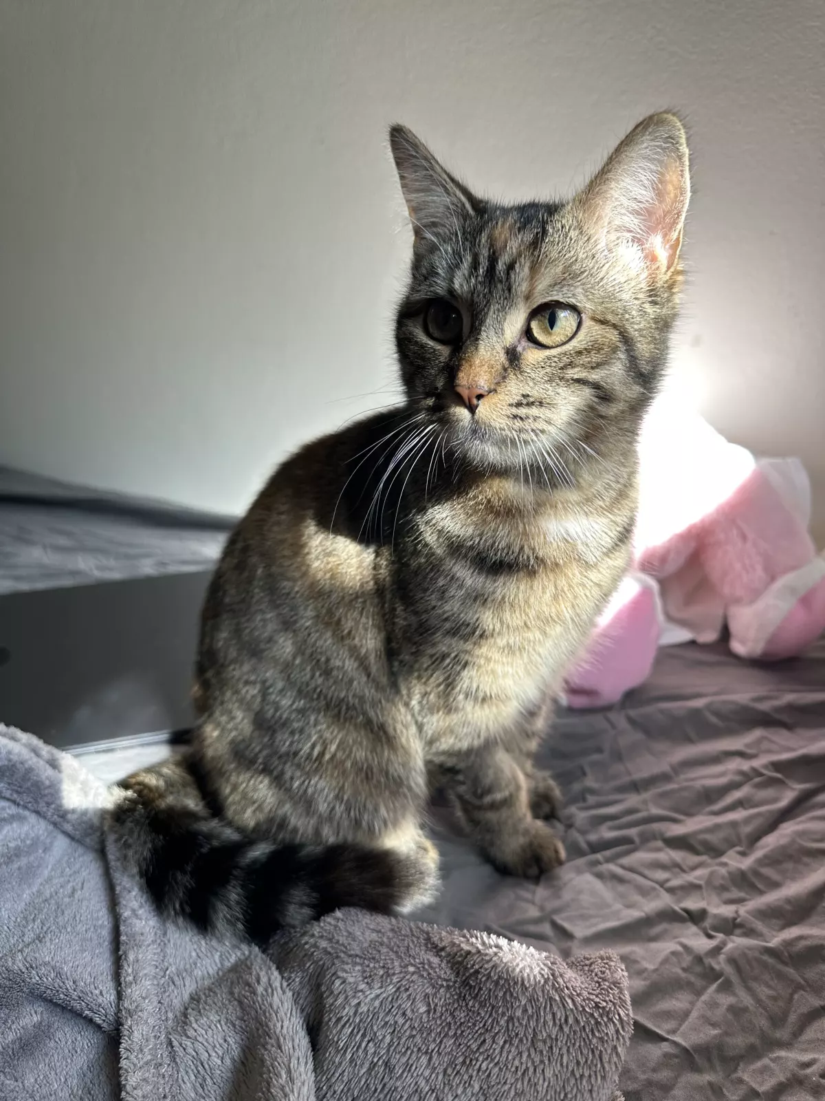 tabby x ragdoll , naturally small female cat- desexed, vaxxed, flea treatment done. Very good with other cats, cuddly.