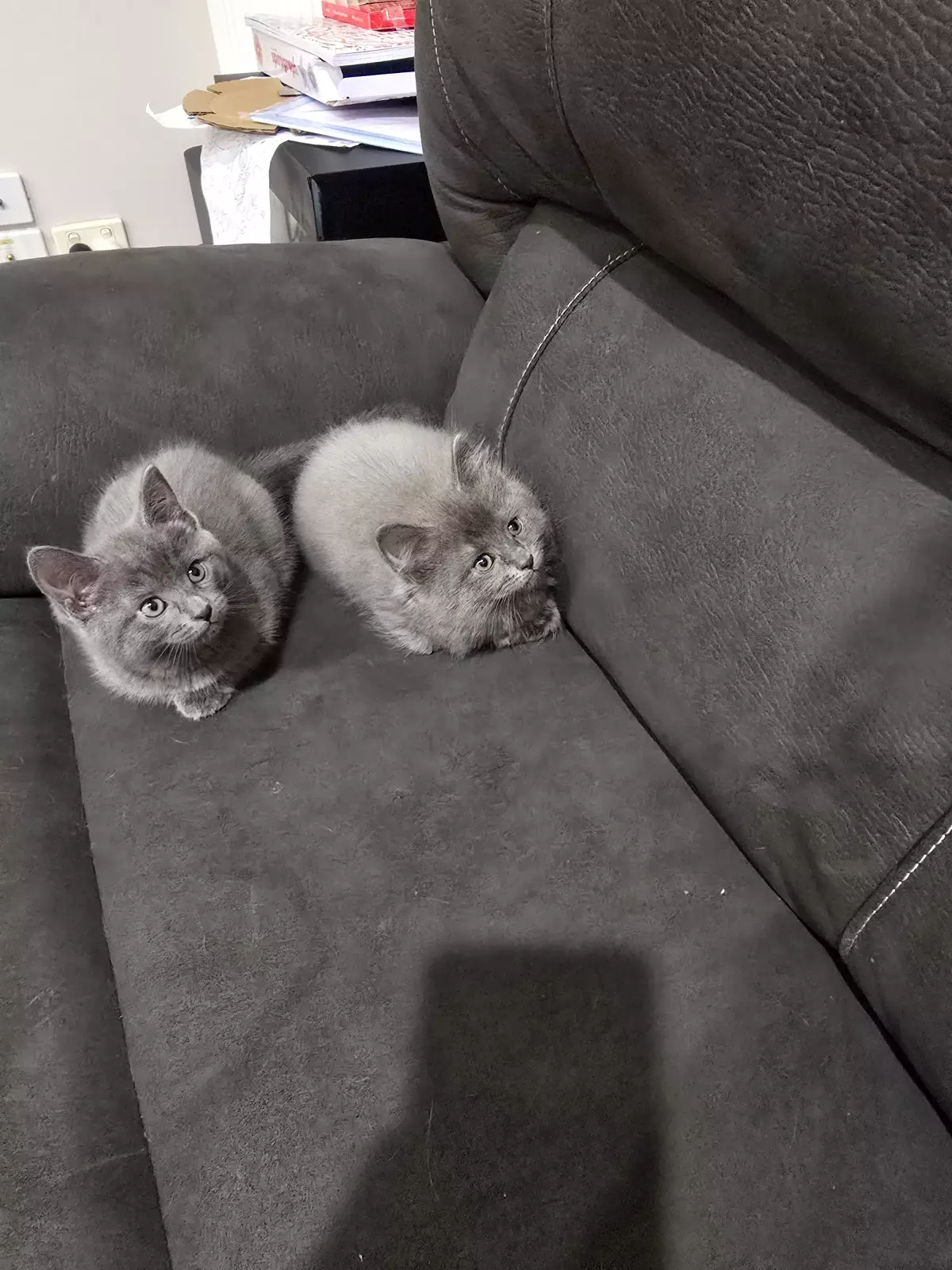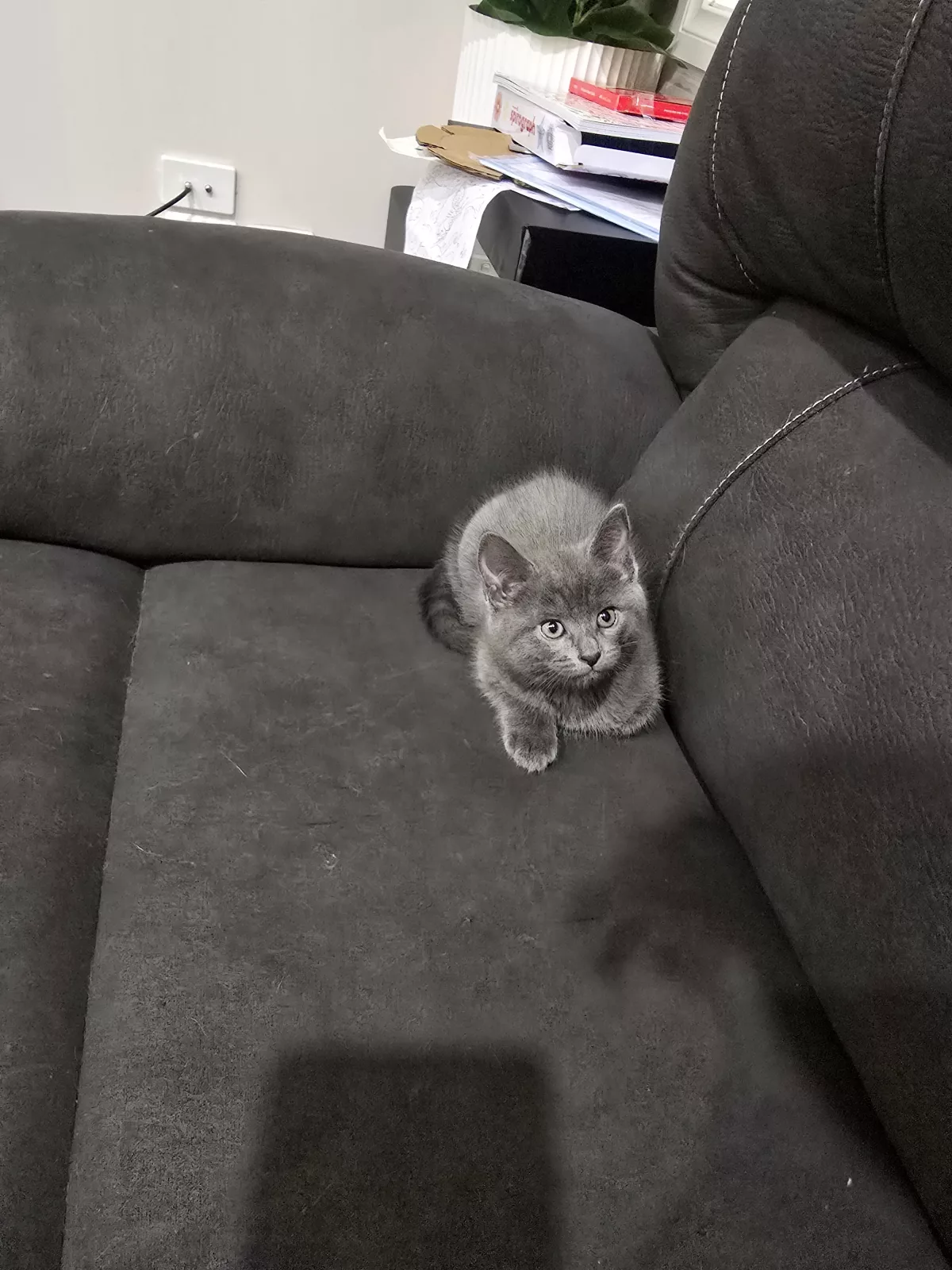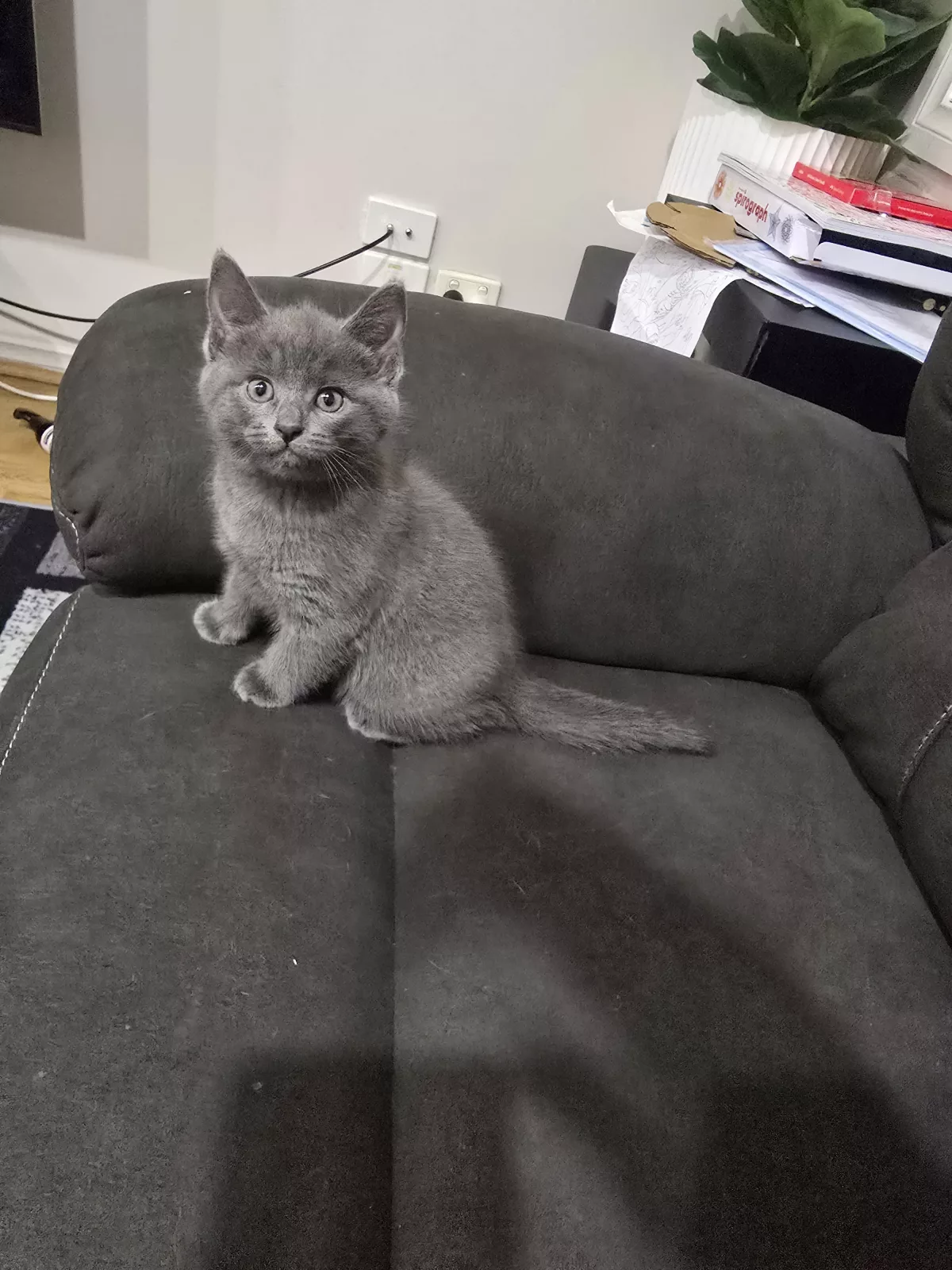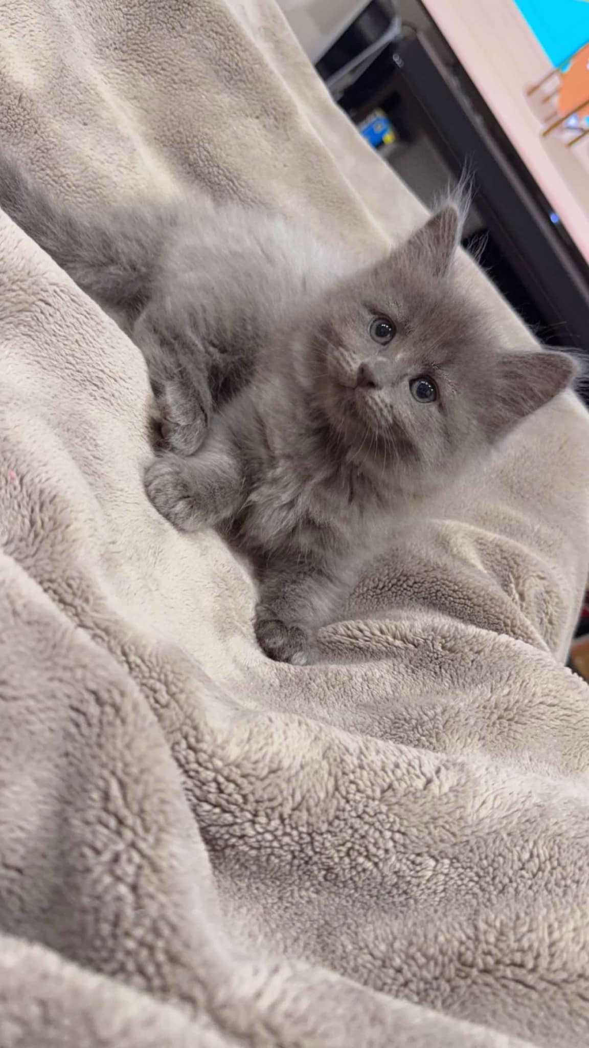Male kitten has a flufgy thick coat, the coat is dark blue on the head and fades away to a lighter blue till the tail and then darkest up on the tail. He has a very unique colour. He's very playful, very chill and gentle with kids, lays nest to you all day if he's napping or chilling.