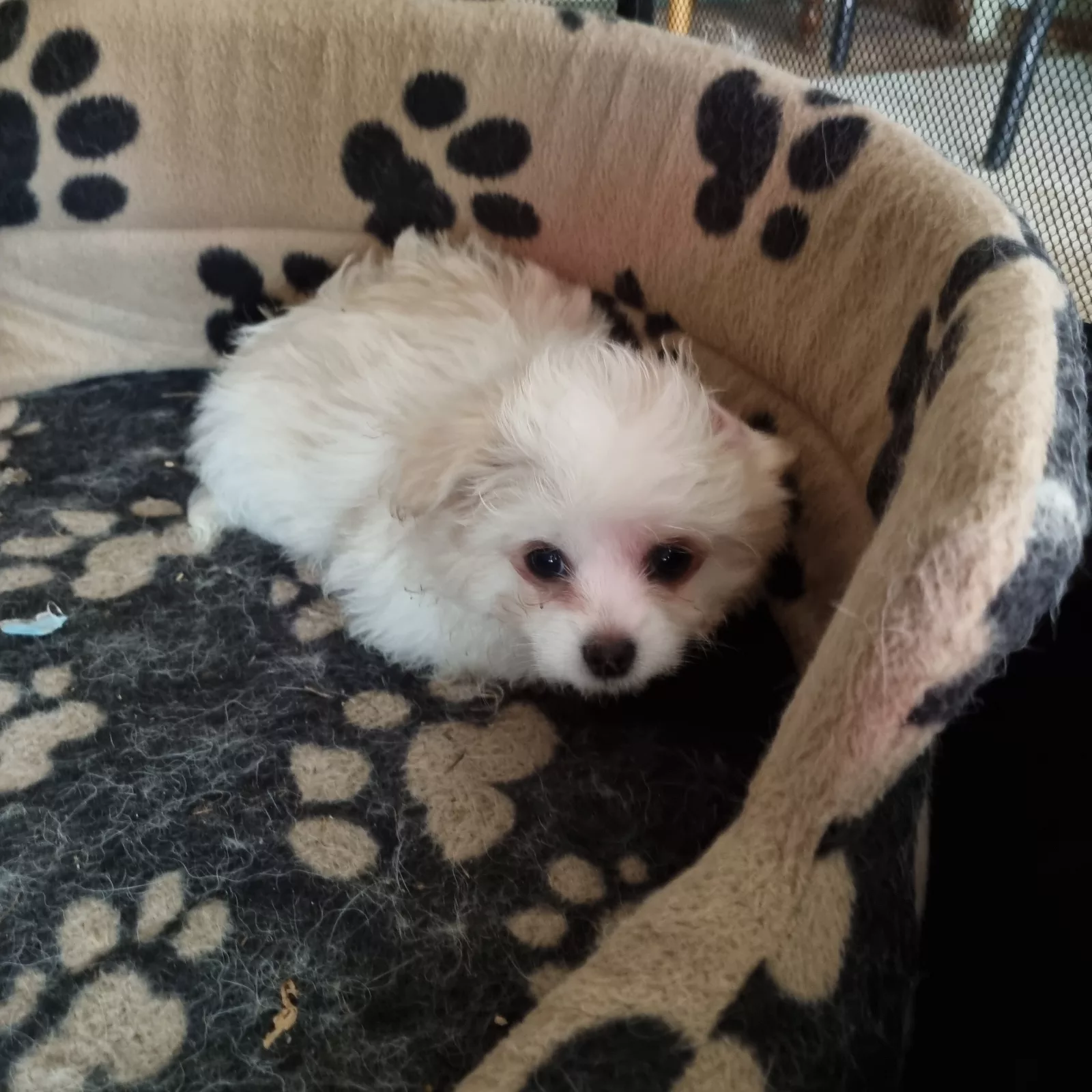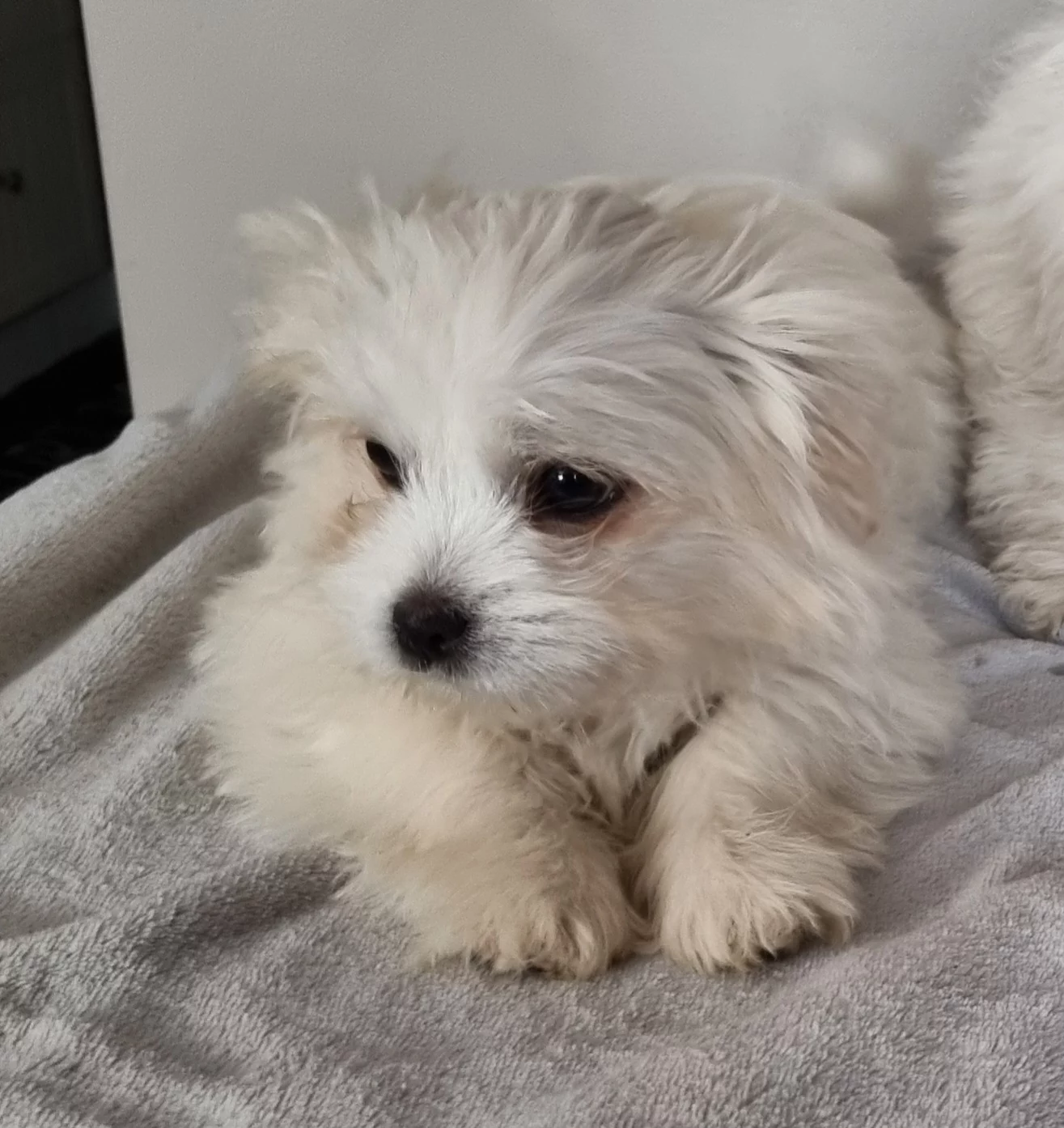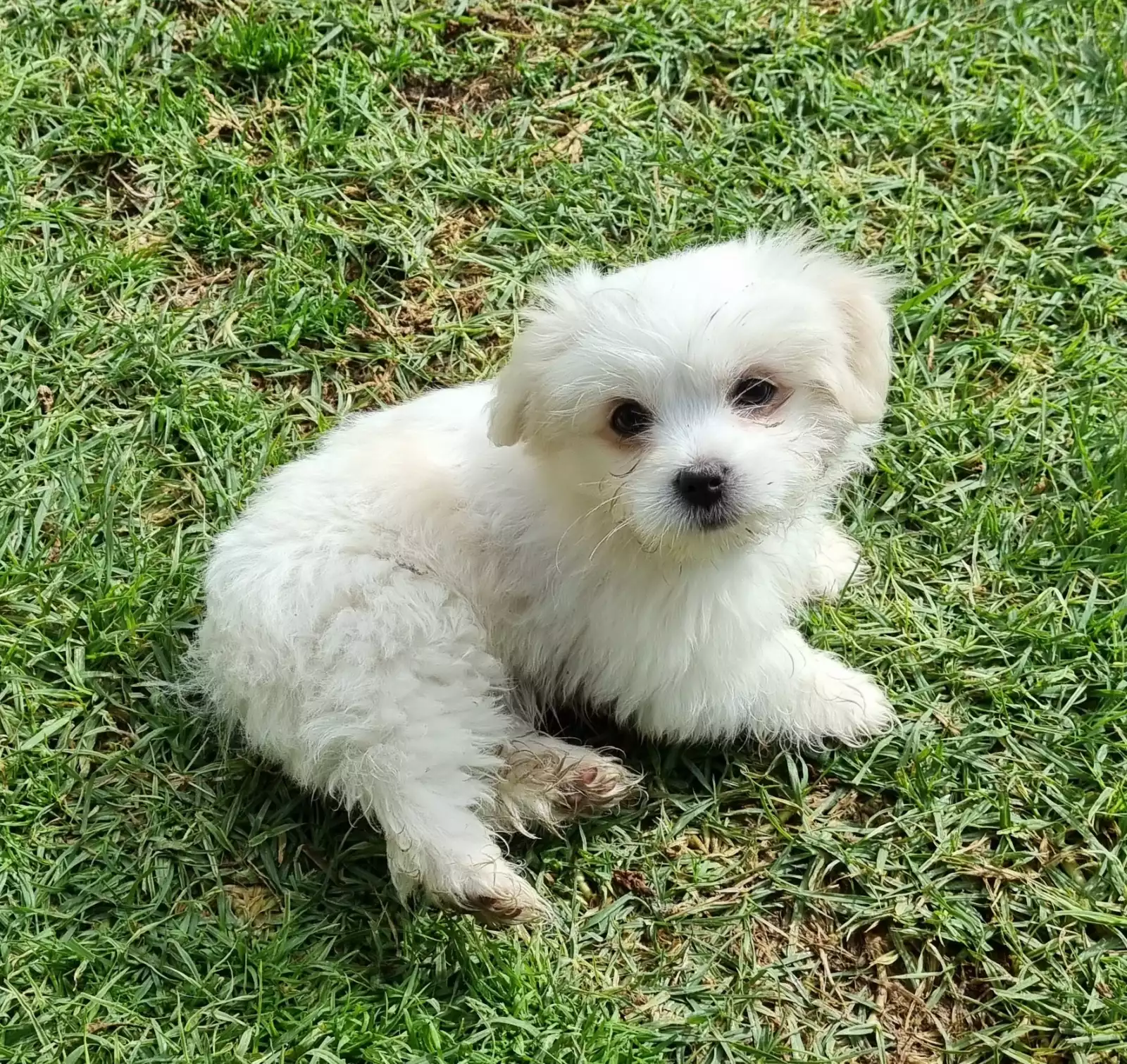 Mother is a Pure Bred Miniature Maltese and Father is a Pure Bred Tibetan Spaniel.