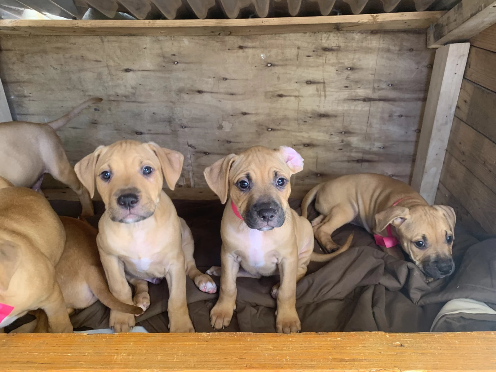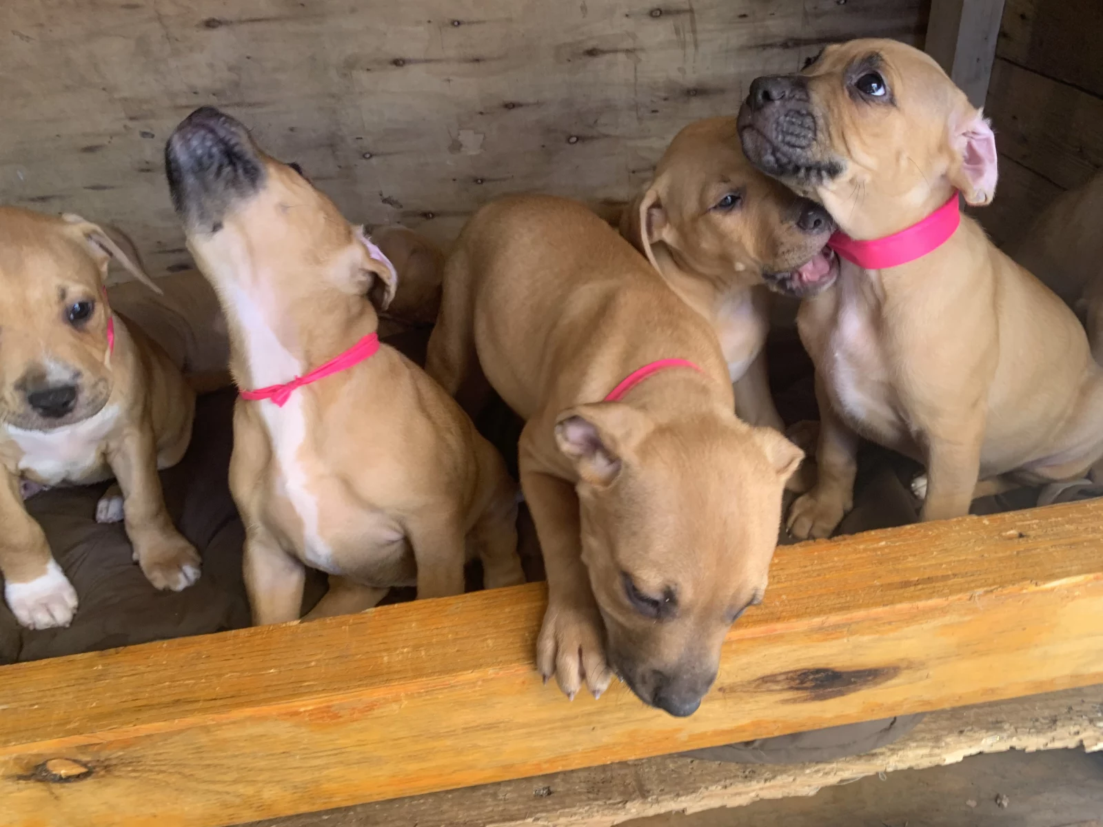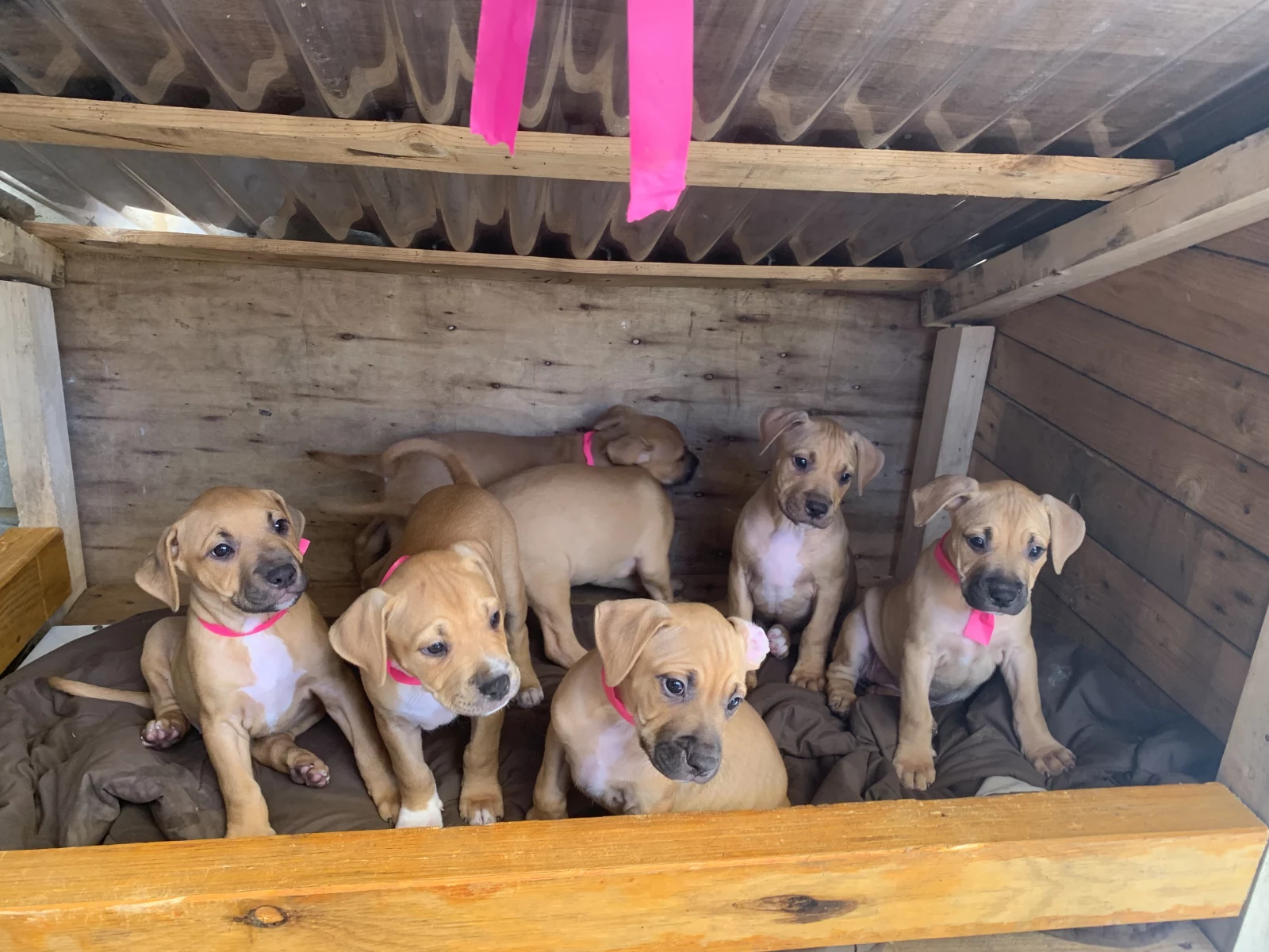 5 Girls: pink ribbons all pretty big just as big as the boys if not bigger.some have few white markings mostly tan with white chest’s really gorgeous looking puppies
