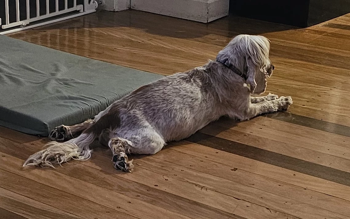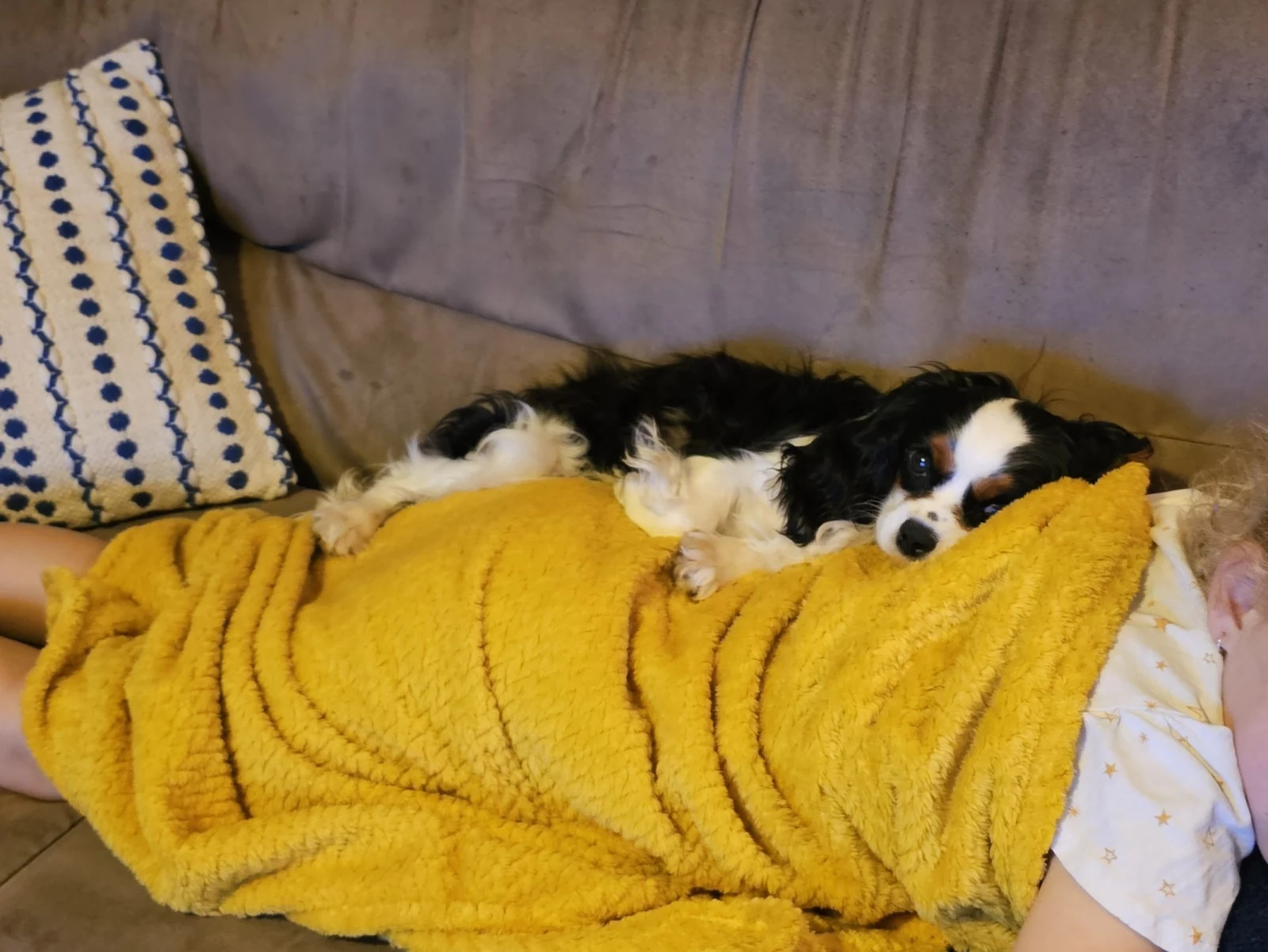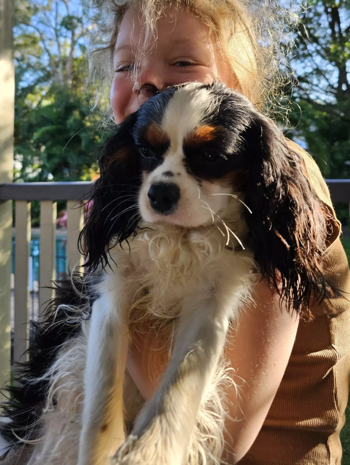 Mum - Callie - is a Lemon Roan purebred Cocker Spaniel (pictured staying cool in the aircon with her tummy full of puppies!!) and Dad - Louie - Tricolour purebred Cavalier King Charles (pictured) have had a litter of puppies in the first week of February. Callie is a very gentle and placid soul whereas Louie is a complete goofball and very funny, who adores a snuggle; so as suspected, we have a mixed bag of males and females in a combination of coloring: black and white, white and gold/tan (the tricolour and solid black pup in the pics already have families).