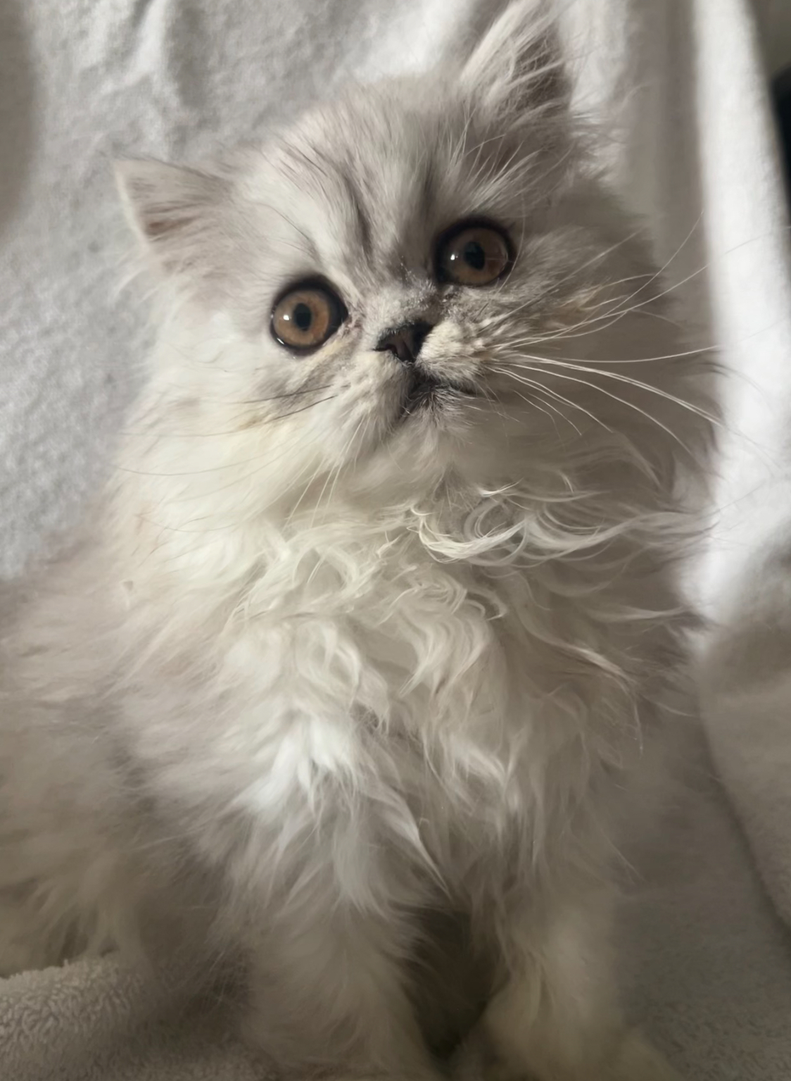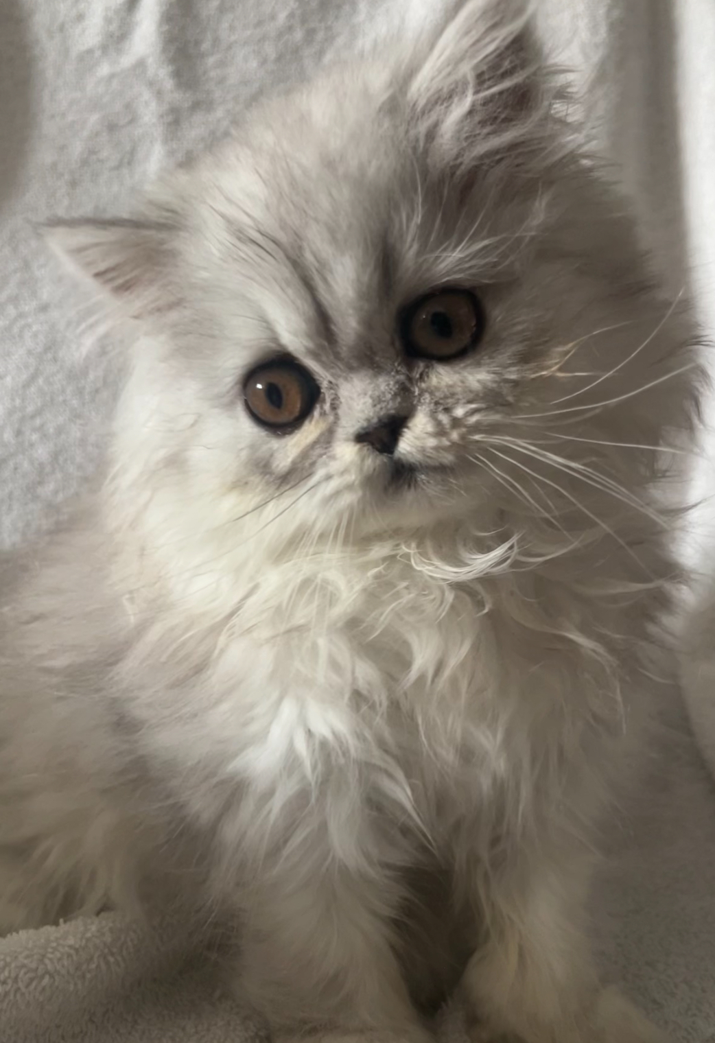Dior is the sweetest little fluffy girl with a soft silver coat and big round eyes that give her the cutest teddy bear face 🧸