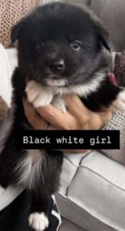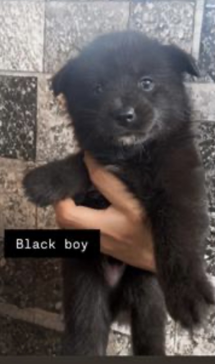 1 black tri girl , 1 black and white girl, 1 merle girl and 1 black boy