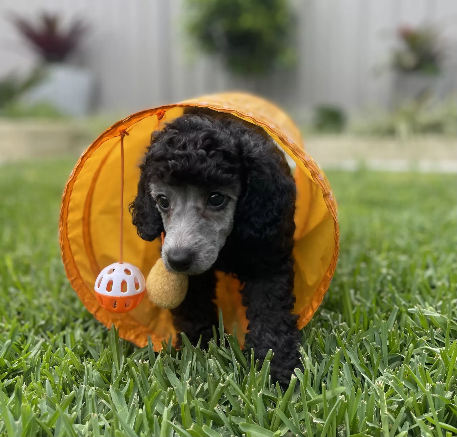 - Puppies play with teething and sensory toys and enjoy playing in our grassy backyard.