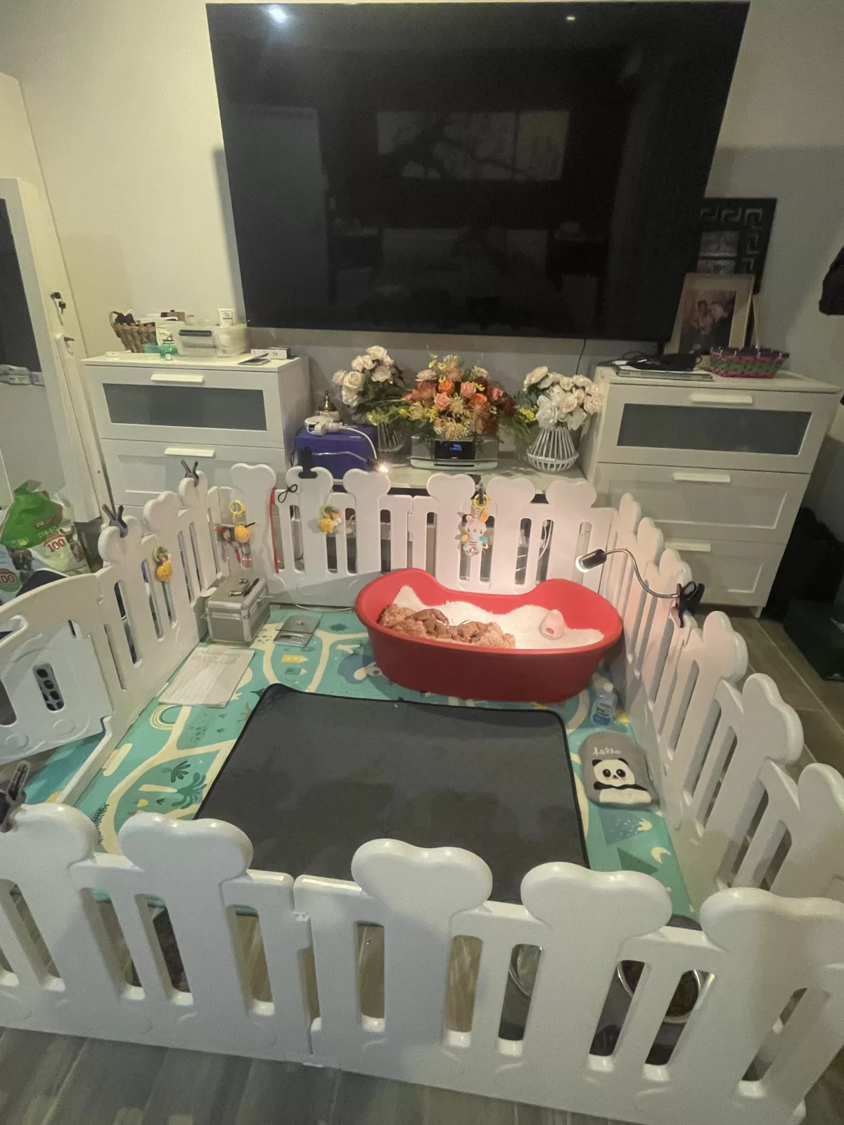Dogs have access to: warm bedding, water at all times, ample space to exercise, natural light