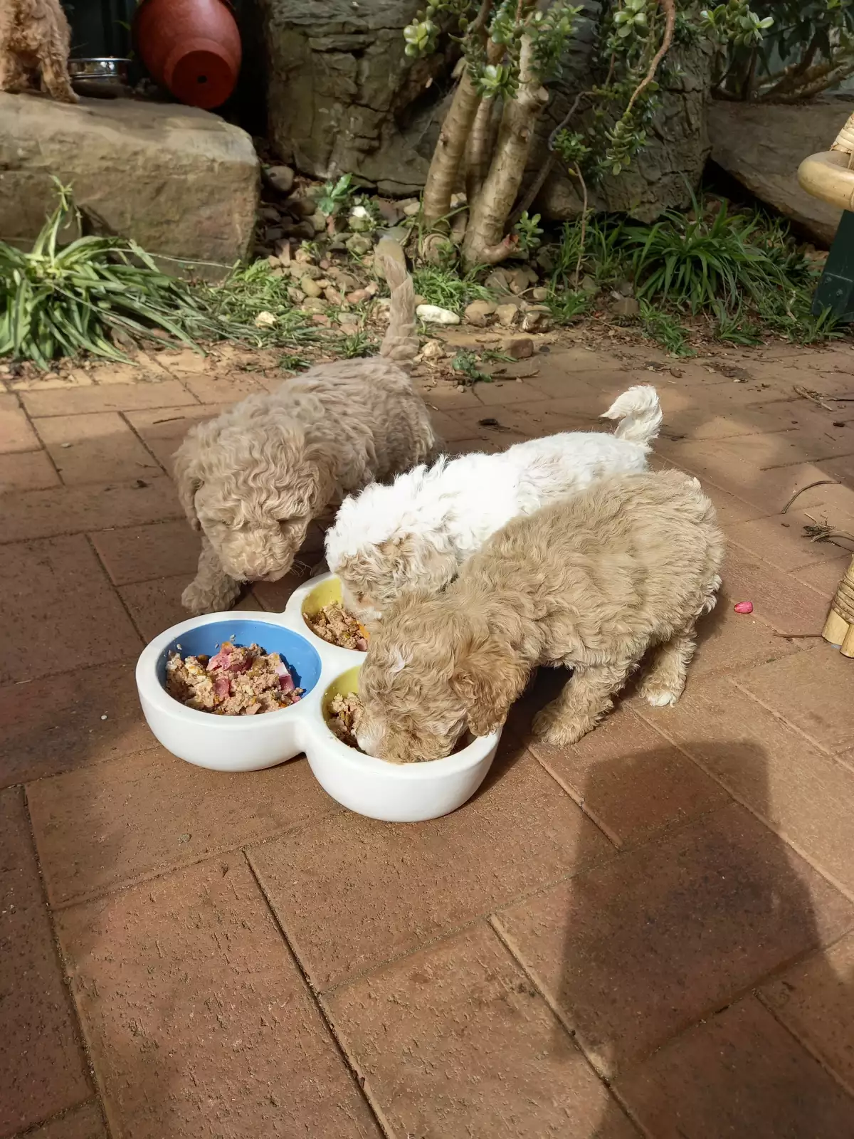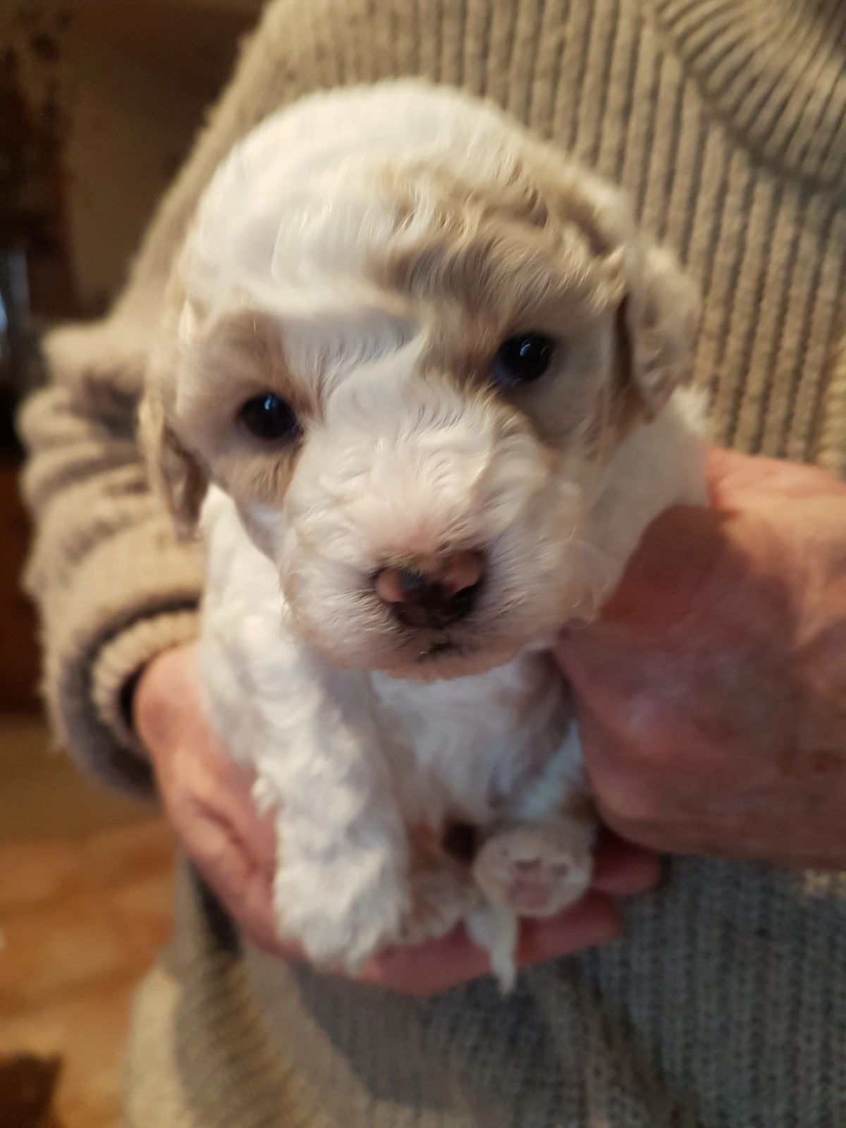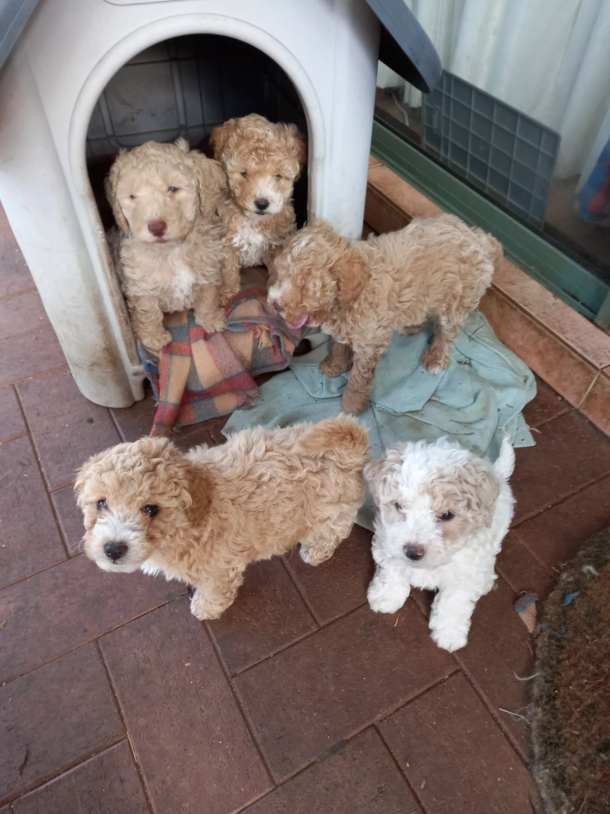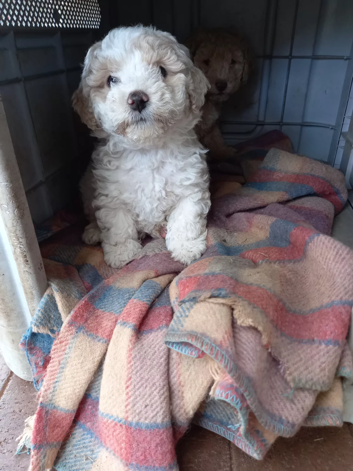 Bichon Poodle Pups. Hypo allergenic. Available now. 3 males and 2 females. Full DNA profile available for both parents. Microchipped, wormed and vaccinated. These puppies have been house raised with cats and are an ideal breed for families or the elderly, loving either a nap on your lap or a run around the block. Easy to train, they are very loyal and will bark if a stranger approaches the house. They are, however, friendly and cuddly with family and friends. Their curly hair is easily groomed at home and requires cutting every few months as it does not shed but keeps growing. A loyal, intelligent, loving breed, they will be 7 - 10 kg when fully grown. These happy, undemanding dogs will be a joy for all. Details for each pup are;-
