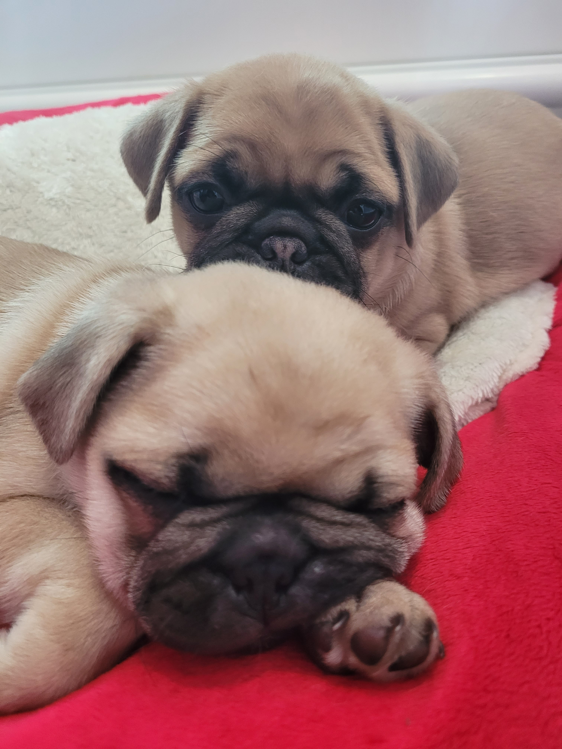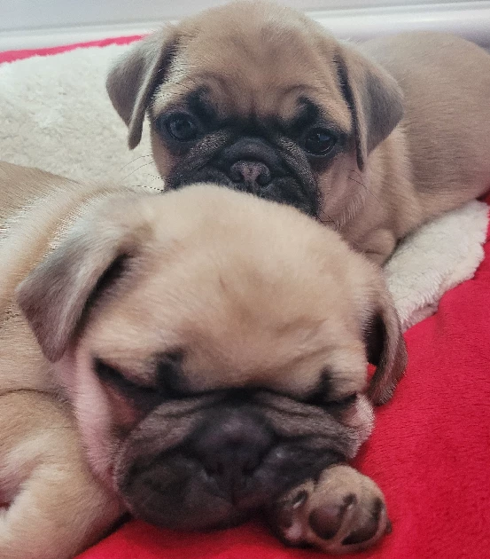 Fall in love at first sight with these absolutely adorable pug puppies! Their signature wrinkled foreheads, large round eyes, and pushed-in noses create expressions that will melt your heart daily. These puppies boast the classic pug coloring in beautiful fawn and black varieties, each with their own unique markings and personality quirks. Their curly tails and sturdy little bodies make them perfectly huggable companions who love nothing more than snuggling with their favorite humans.