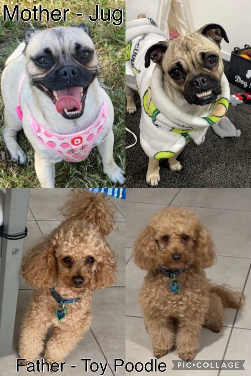 Mother is a Pug x Jack Russell and weighs around 5-6kg. Father is a pure breed Toy Poodle and weighs around 4-5kg. We own both parents can send more photos on request.