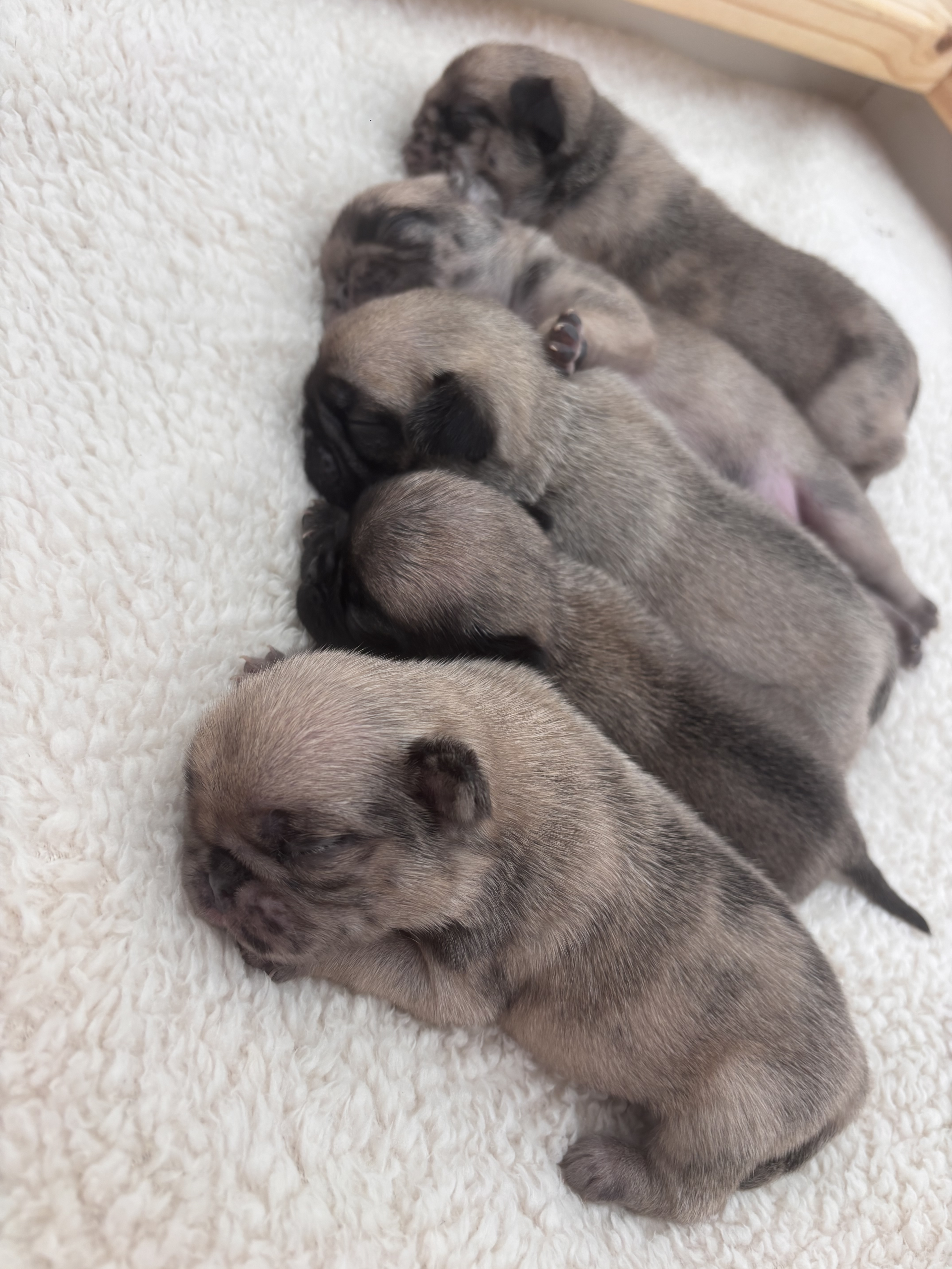 5 beautiful pugs, 3 fawn merle, 2 Merle. The cutest little things you will ever see! Born on 15/06/2025, Ready for a new home when they are 8-9 weeks old around 10/07/2025 to loving forever homes only!! 🐾