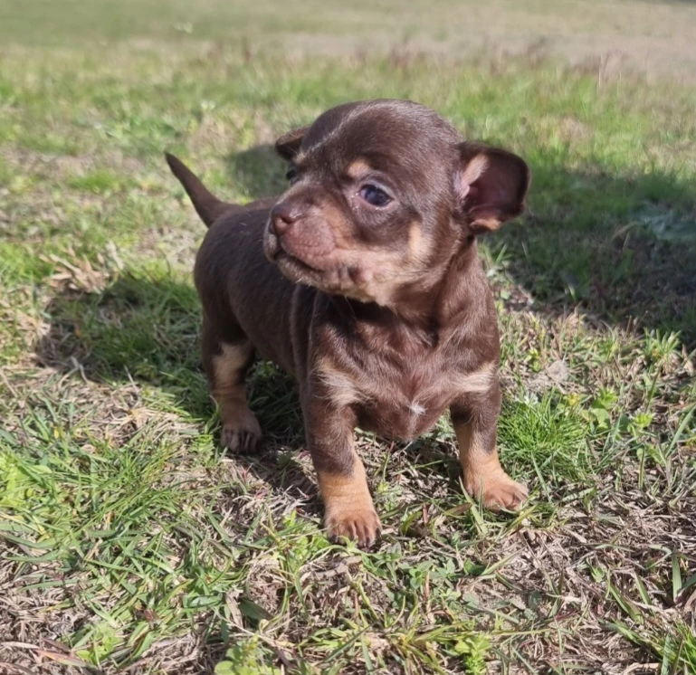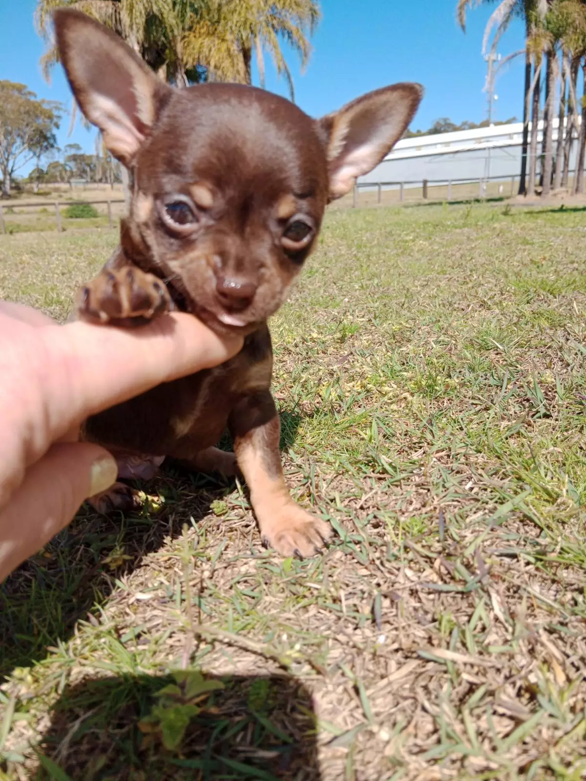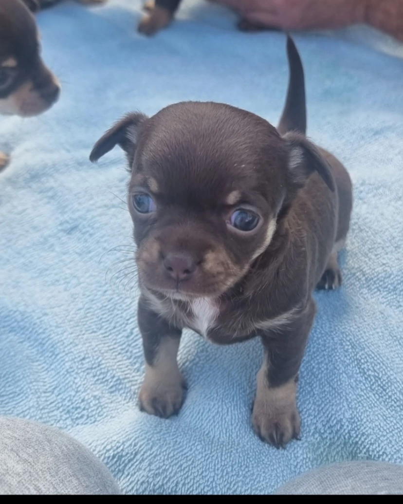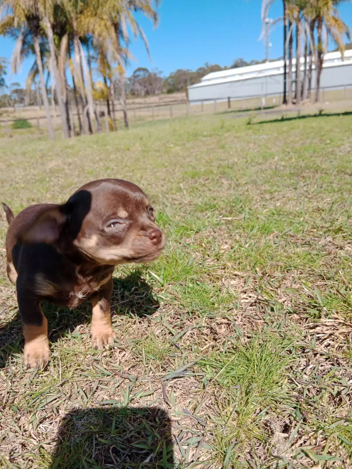 Girl 2- Smooth coat darker chocolate with tan points. This little girl is very affectionate & loving ,always happy to see you.