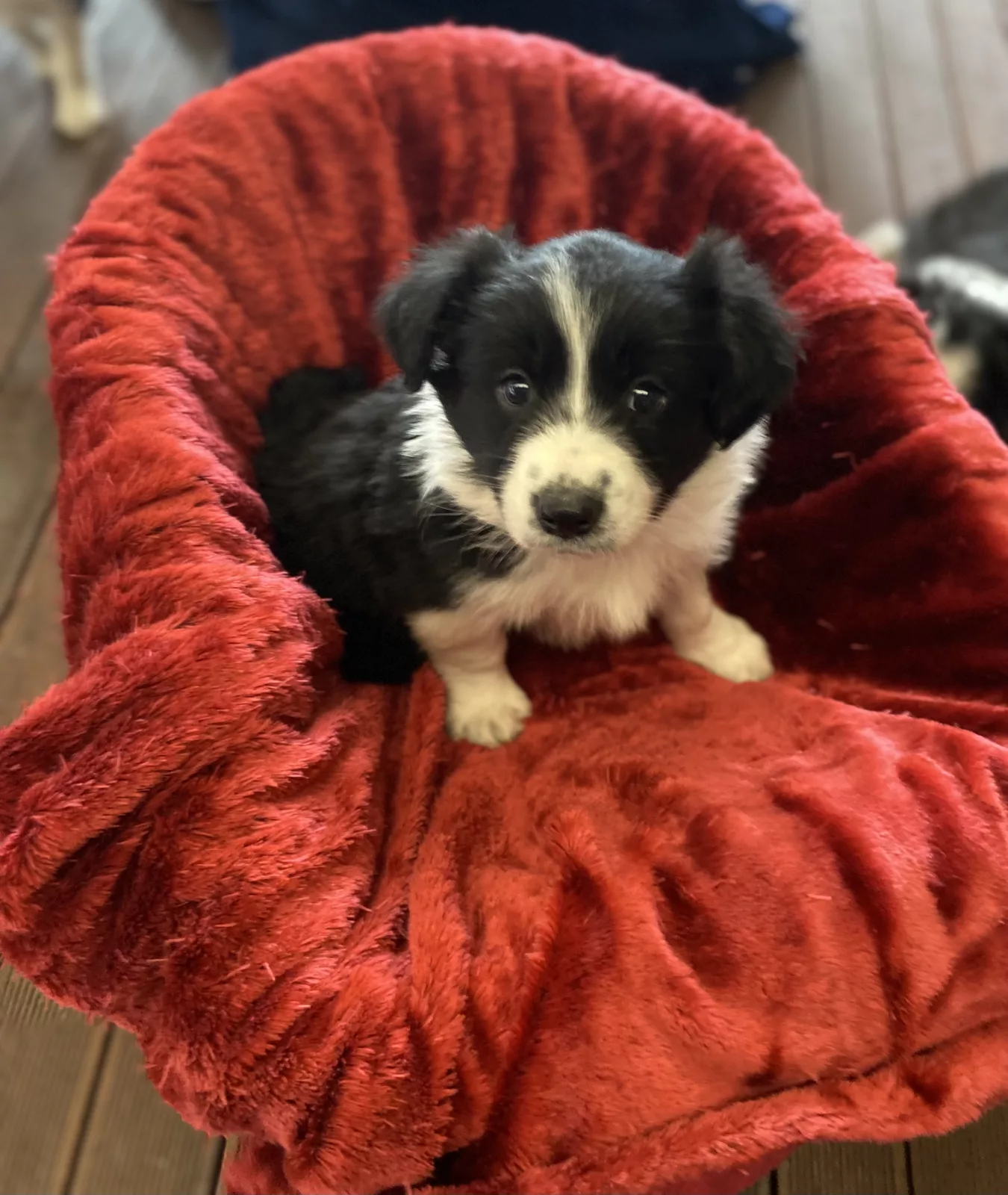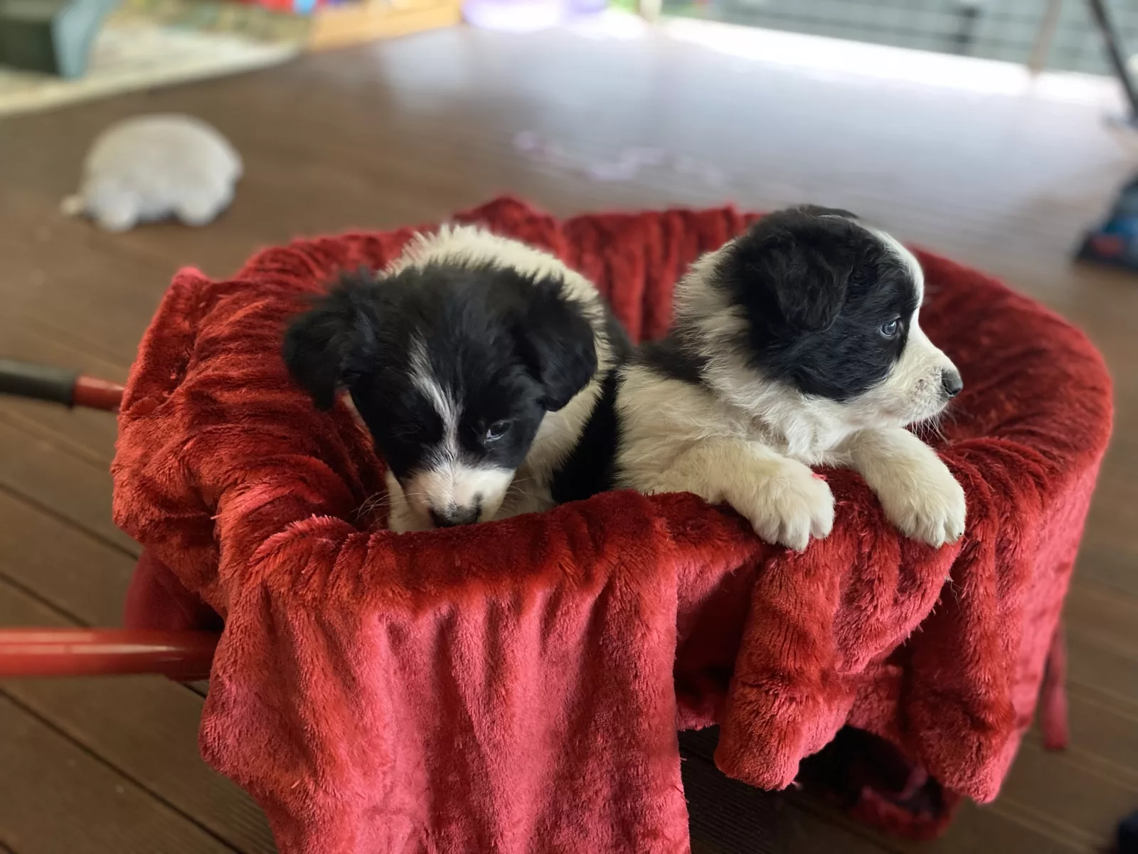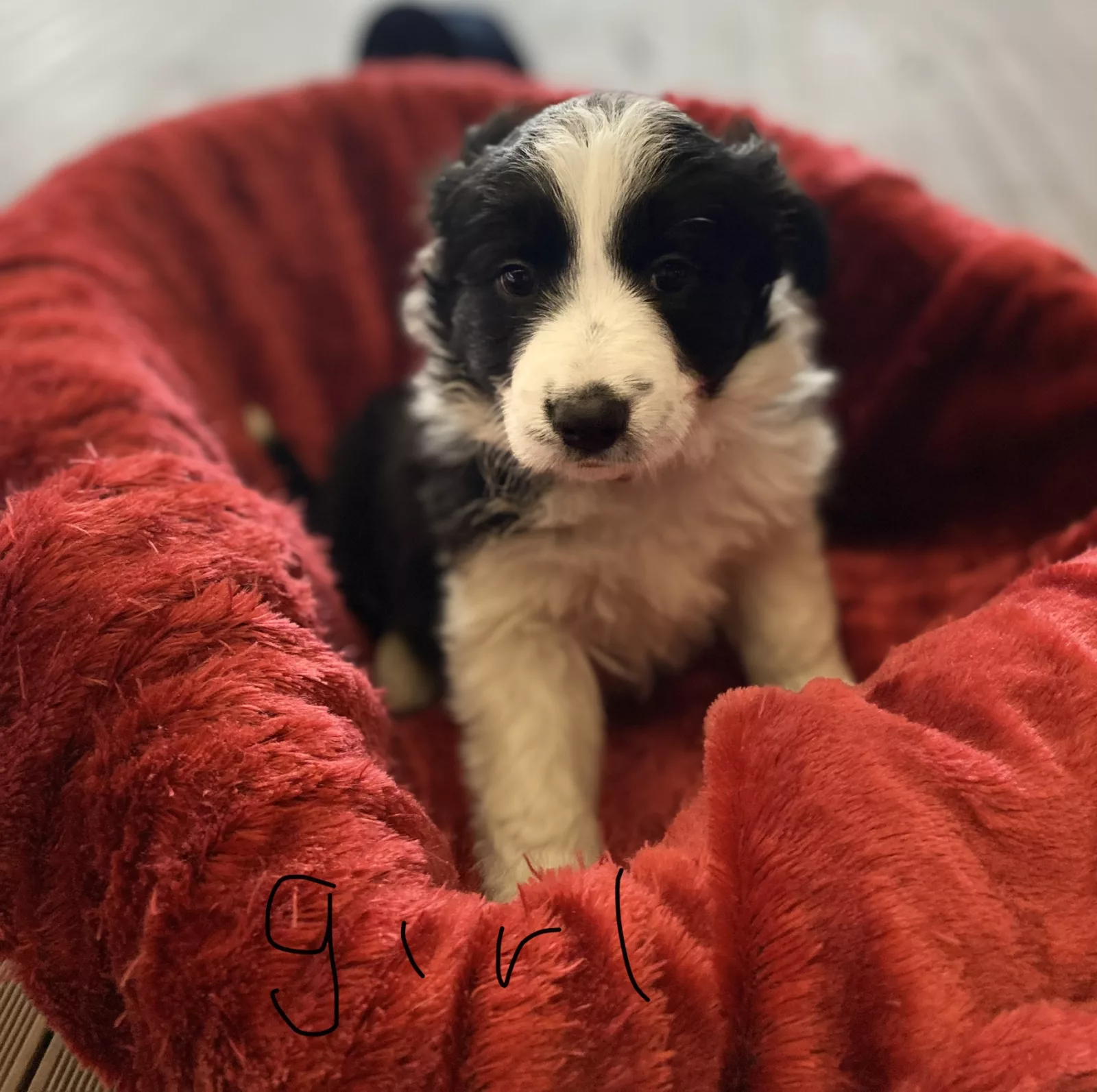 Four black and white girls and one black and white boy for sale. All are in good health, vet checked, wormed, vaccinated and microchipped. These puppies have been raised in a caring environment with regular handling and plenty of interaction. They are playful, curious and enjoy human company and cuddle time. The pups are growing well and starting to show their own little personalities. They are used to everyday household activity and are settling into early routines. These puppies would suit families or individuals who can provide time, guidance and regular activity as they grow. Looking for loving, responsible homes where they will be well cared for and included as part of the family.