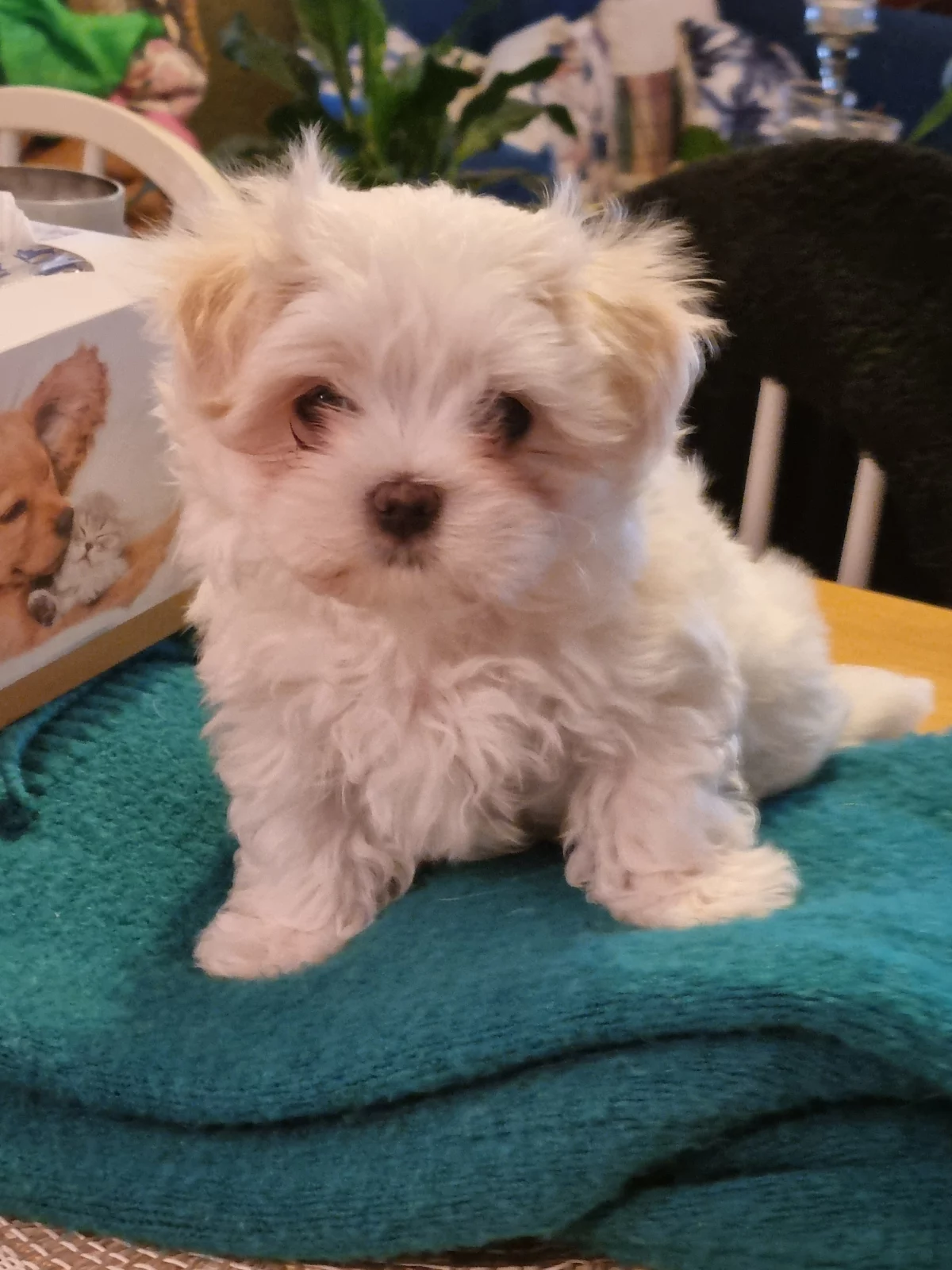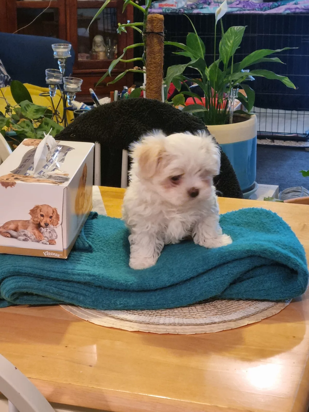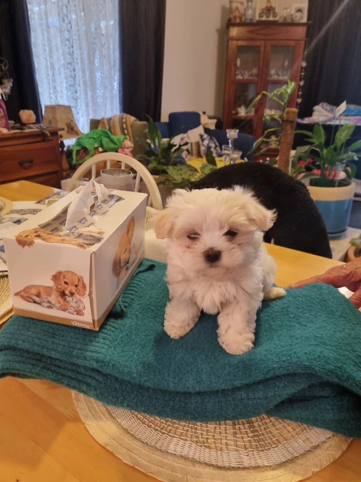 Pure breed maltese puppies. Mother normal size, father Toy size. Pictures of puppies 2 days off from 8 weeks old. These puppies will not be very big at all.