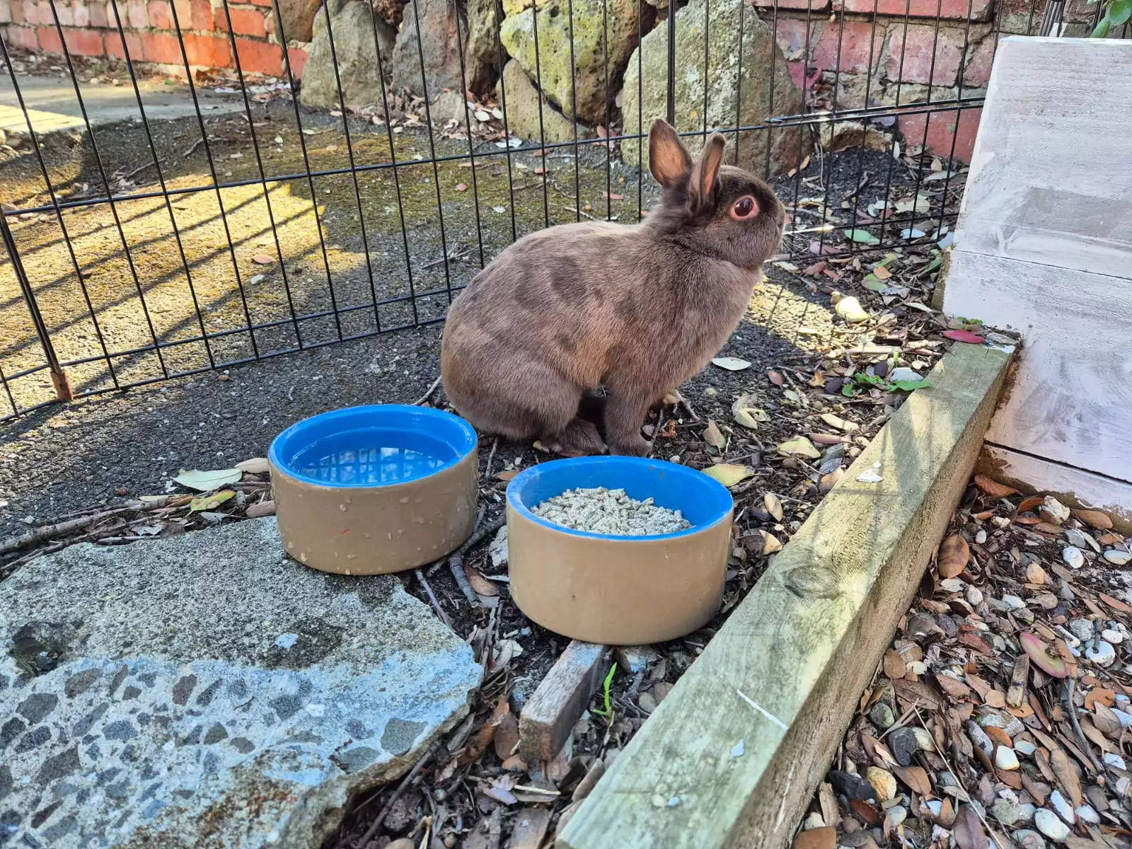 A cute rabbit including food containers and teh rabbit house
