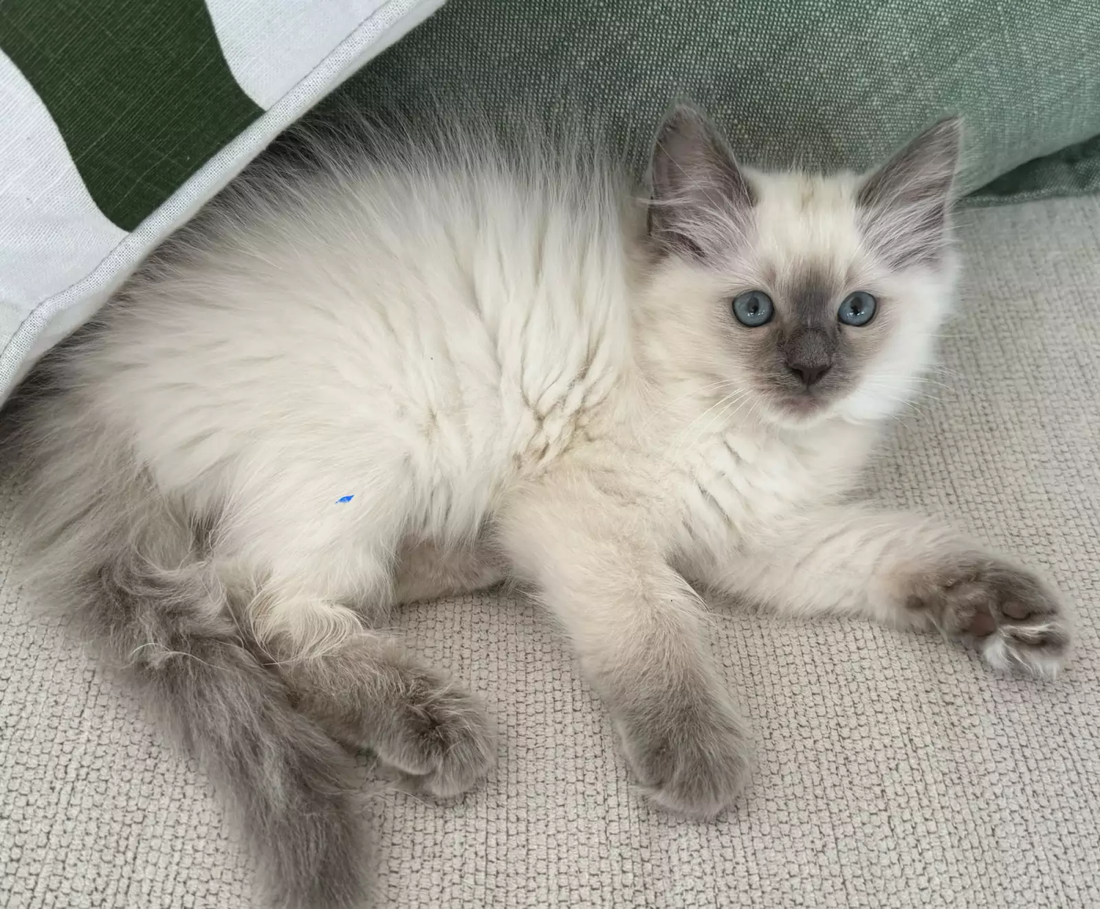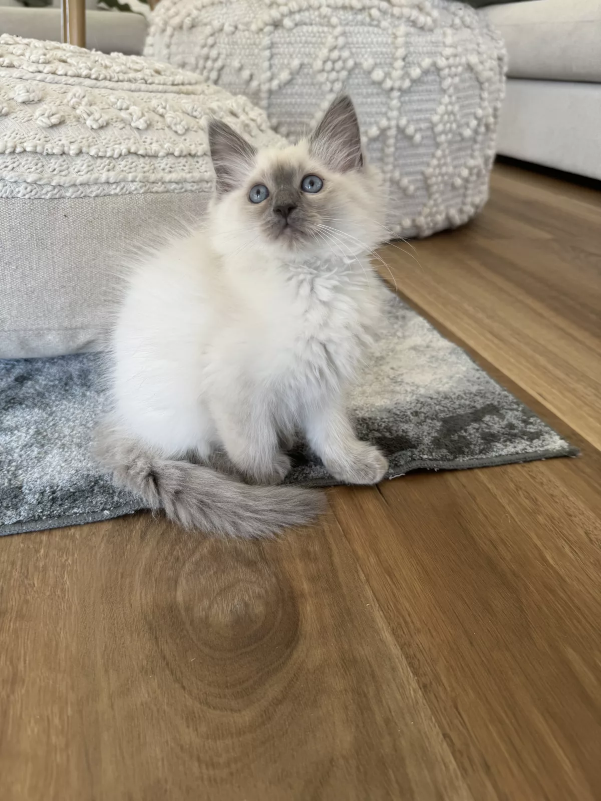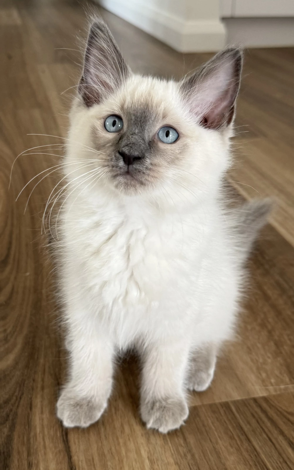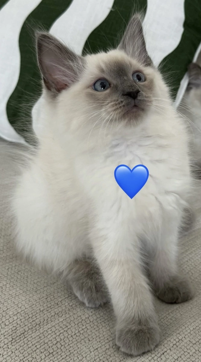 This beautiful Ragdoll kitten has a calm and loving temperament, making him an ideal companion for families or individuals alike. With his soft, plush coat and bright blue eyes, he’s as striking as he is sweet-natured. Raised in a caring home, he is well-socialised, enjoys playtime, and adores being cuddled. He’s fully litter trained, healthy, and comfortable around people and household sounds. This affectionate little boy is ready to bring warmth, love, and joy to his forever family.