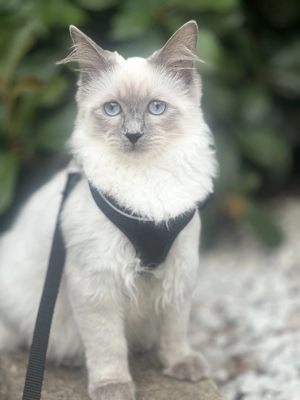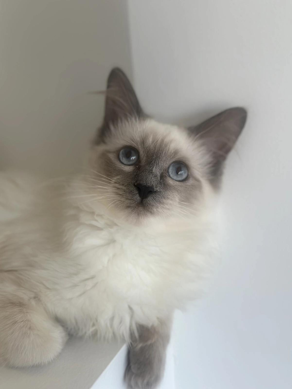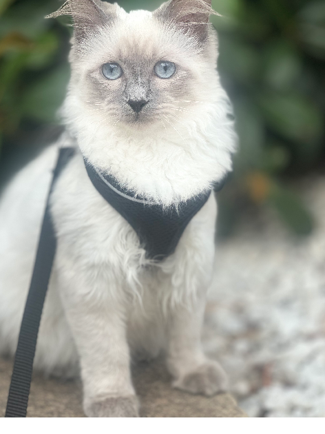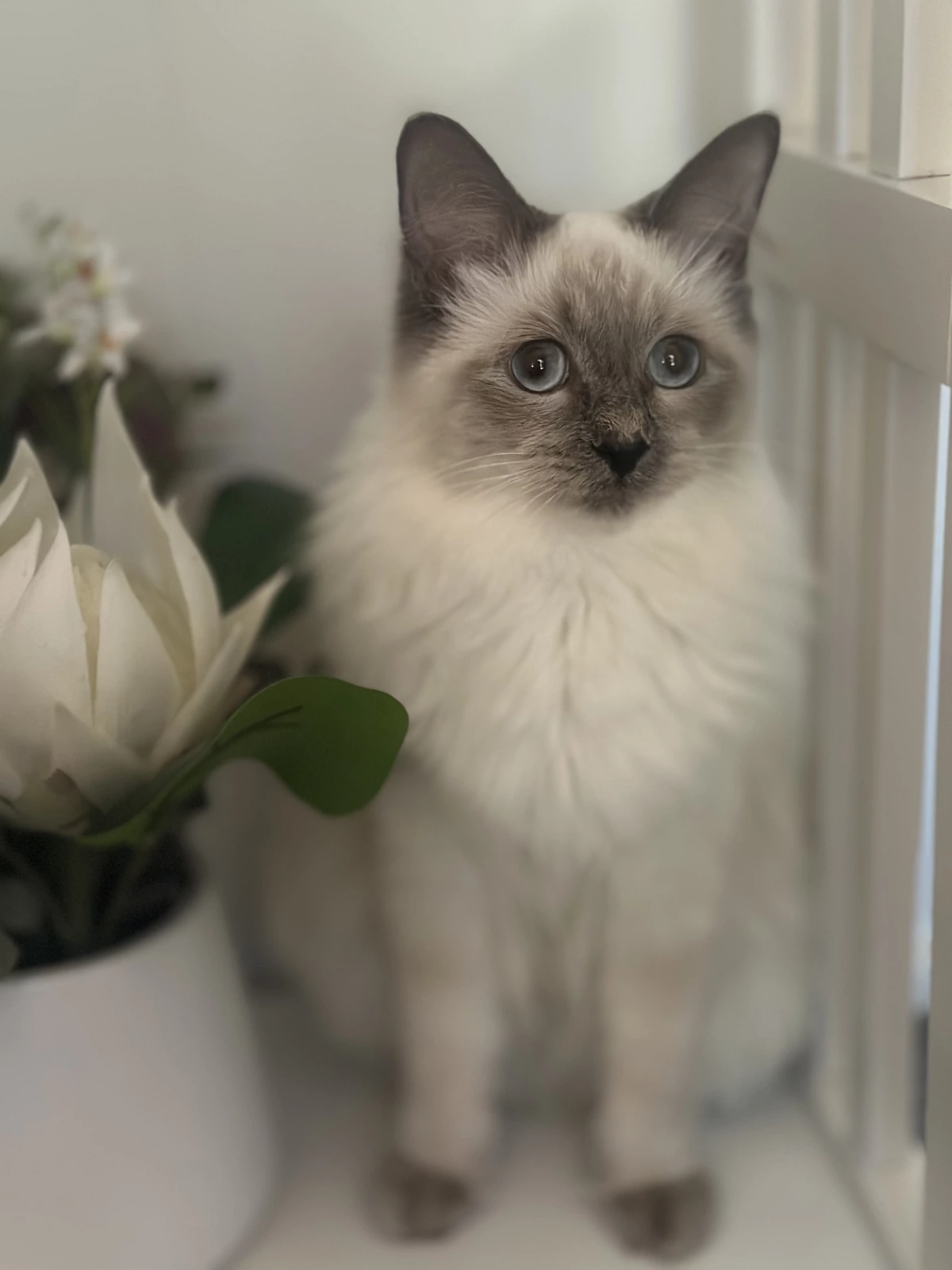 She is an intelligent cat who learns quickly and enjoys being around people. True to the Ragdoll breed, she has a gentle nature and likes to stay close to her human companions, often following them around the house and curling up beside them.