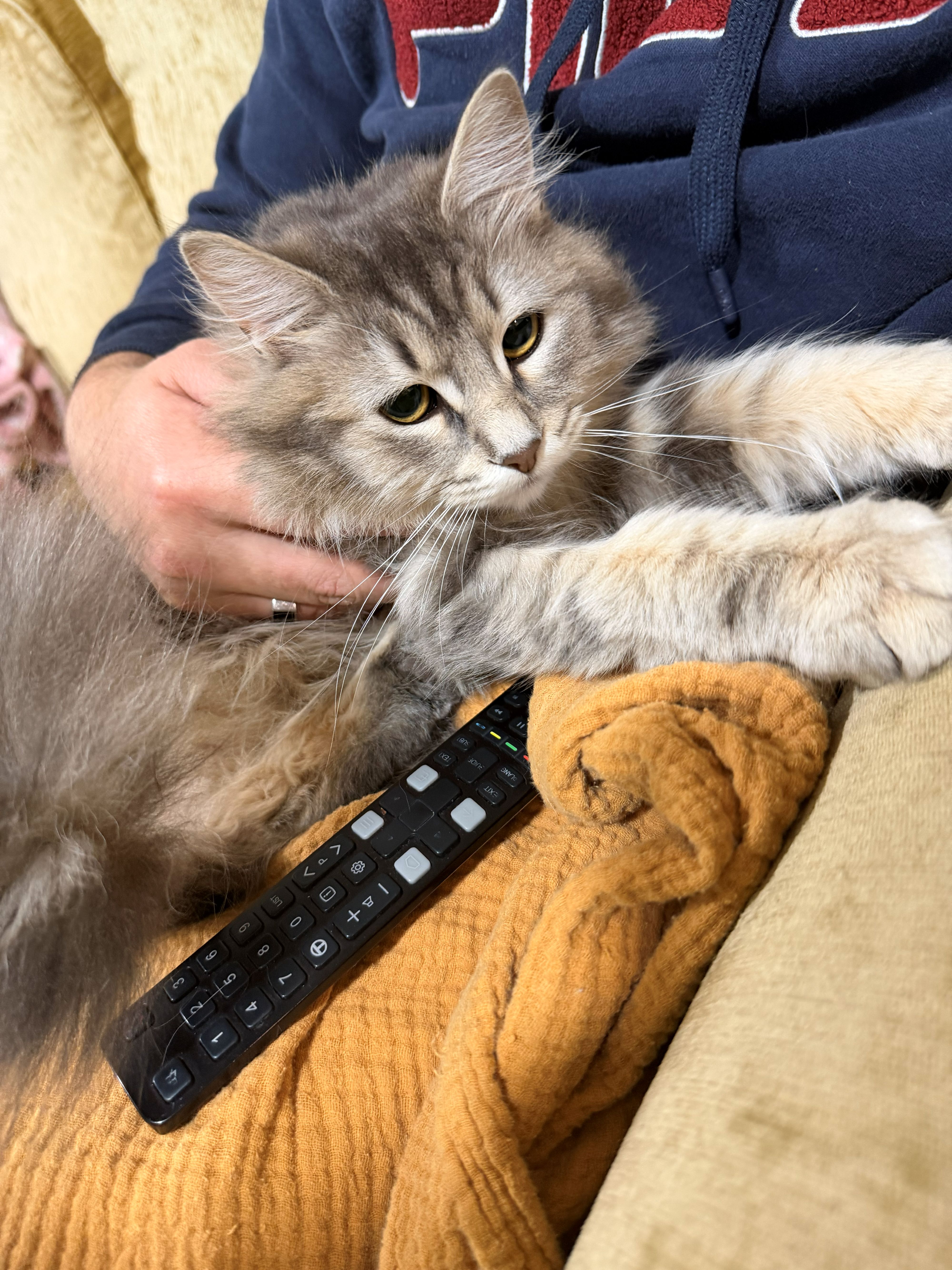 Kiwi is a sensitive cat, she was born into our family and is really used to us and the kids, it will take her some time to adjust in a new home. She greets us when we come home by rolling over and meowing. she also loves to sleep on the bed with us. She likes attention, head scratches and belly rubs on the bed before she sleeps.