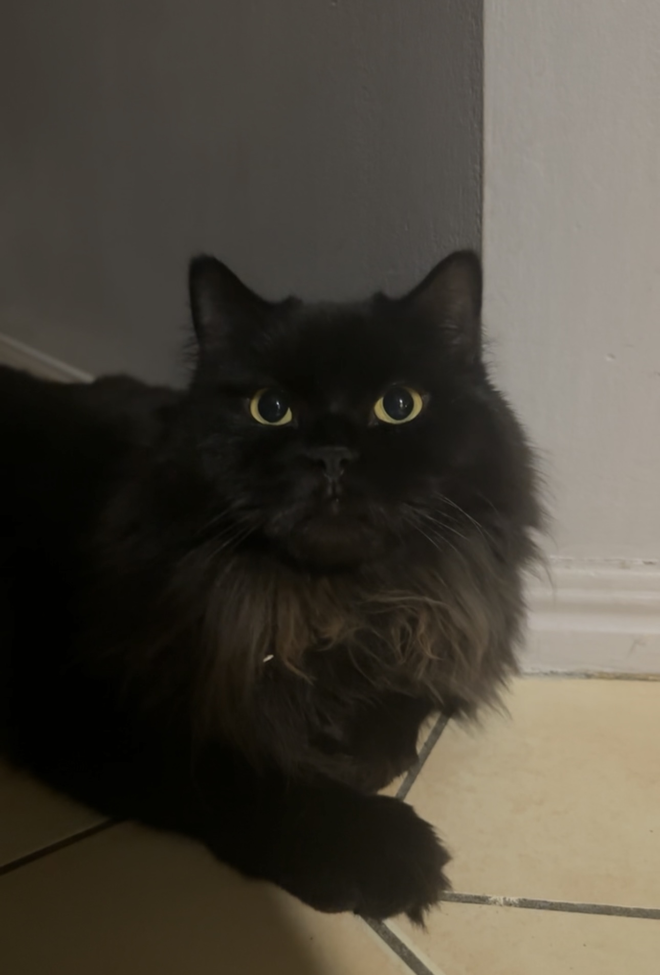 Black long haired mixed Persian/ragdoll male. He’s a confident cat who loves dogs. Always hungry and loves to be around people. Always sleepy.
