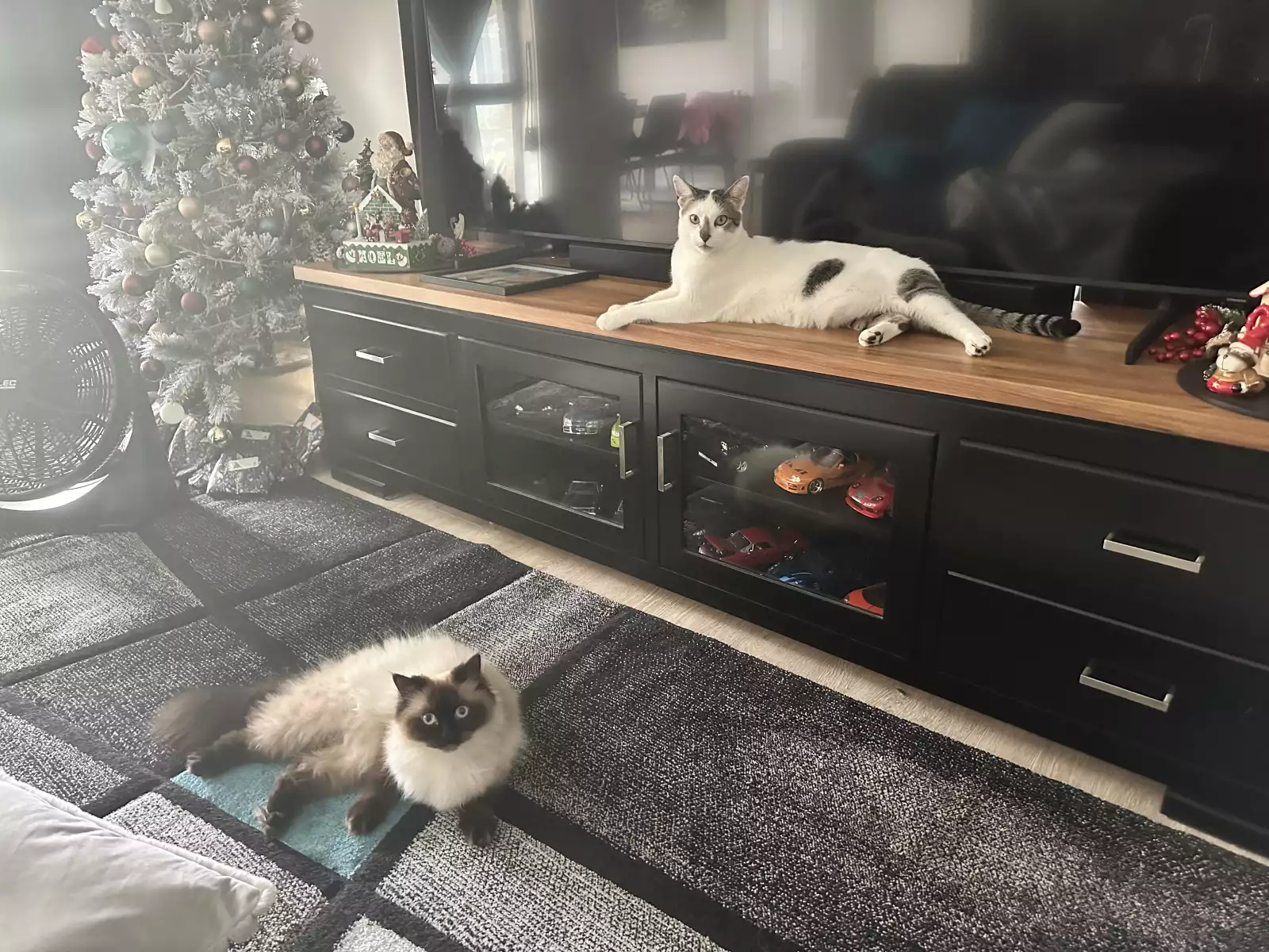 It is evident that you are urgently seeking a loving new home for your two cats, who are exceptionally well-prepared companions. These two felines are both healthy, mature adults, currently two years old, and importantly, they are both desexed, which ensures their calm, stable temperaments.