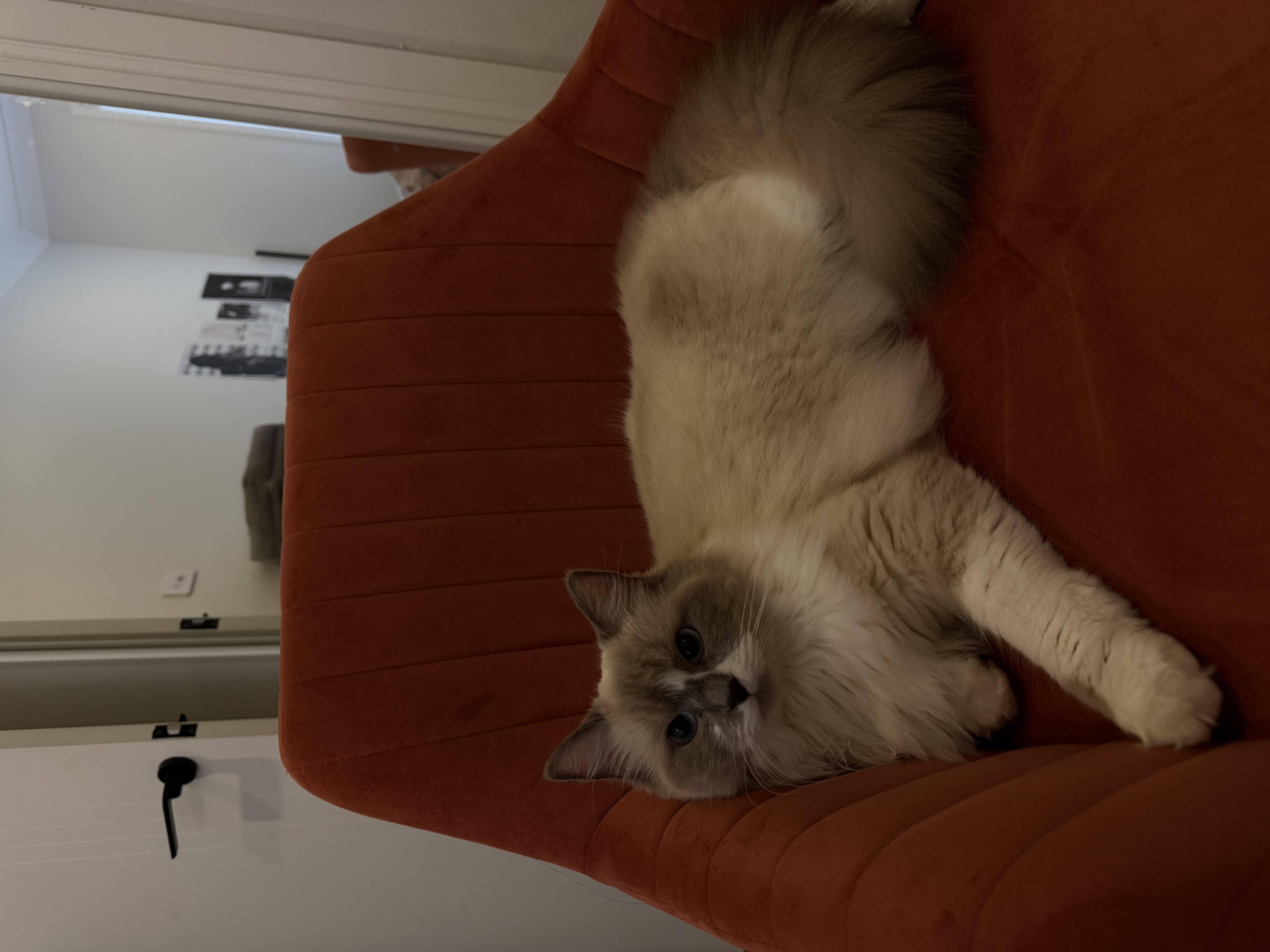 She’s a beautiful 1-year-old ragdoll girl with a soft, fluffy coat and striking blue eyes. She has a calm and gentle personality, loves being around people, and enjoys relaxing in cozy spots around the house. She’s affectionate, easygoing, and well-suited to indoor living, making her a perfect companion for someone looking for a sweet and low-maintenance cat.