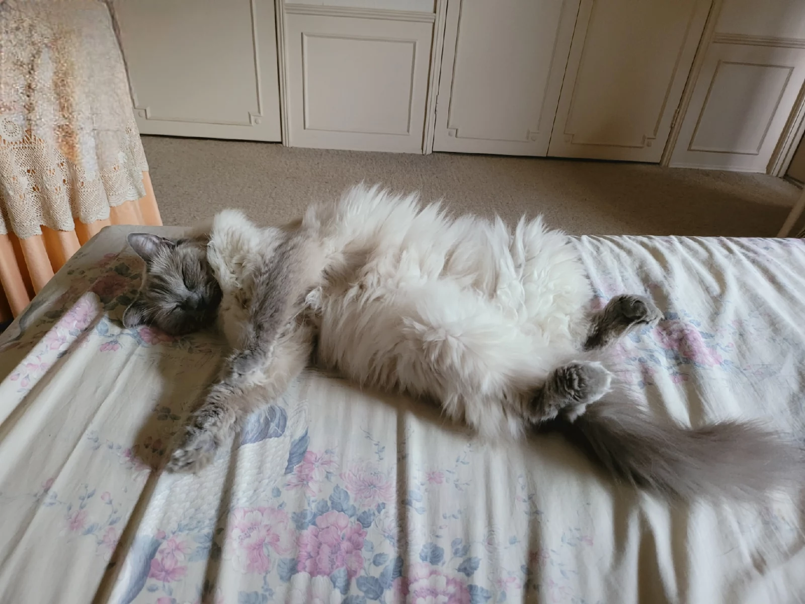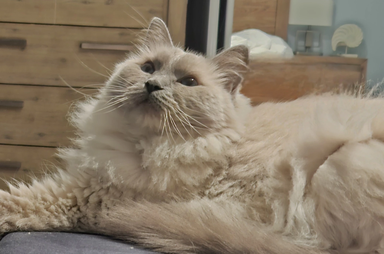 She is a strictly indoor cat keeps to herself mostly not overly affectionate but when it SUITS HER she will snuggle in and not move for hours this will only work if she is in the mood.. lol ( u will be held captive for hours when she is in cuddle mode )