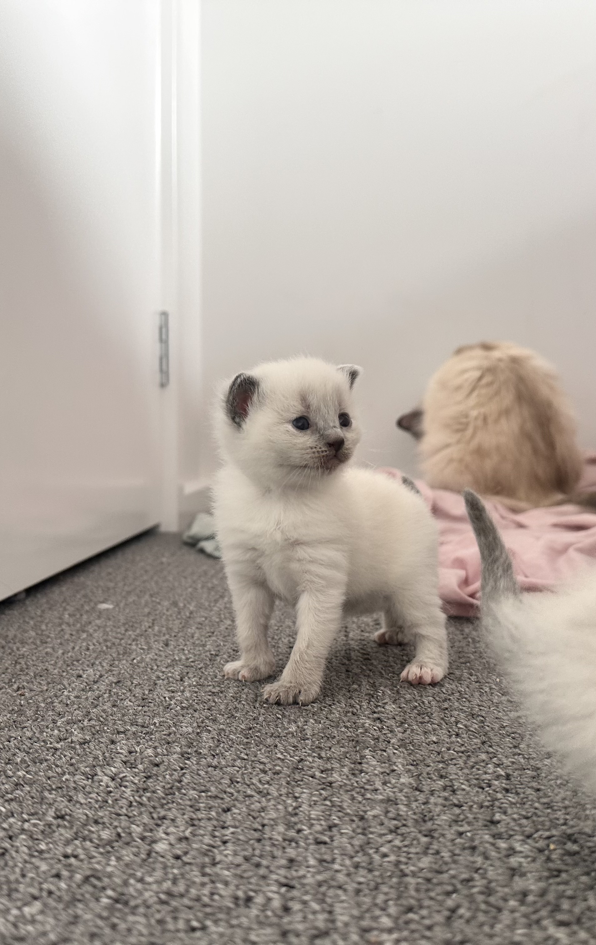 We are thrilled to present three exceptional purebred Ragdoll kittens, all exhibiting the classic Seal Point coloration. This means their body is a pale, uniform cream or fawn, with the "points"—ears, paws, tail, and face mask—developing a rich, dark seal-brown color, giving them their beautiful white and grey appearance.