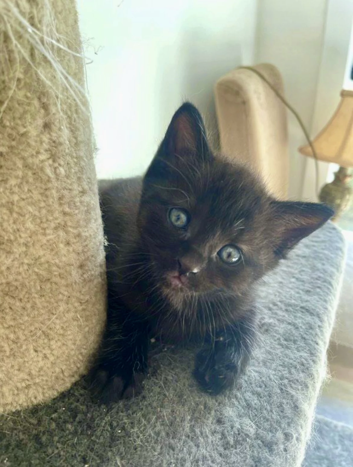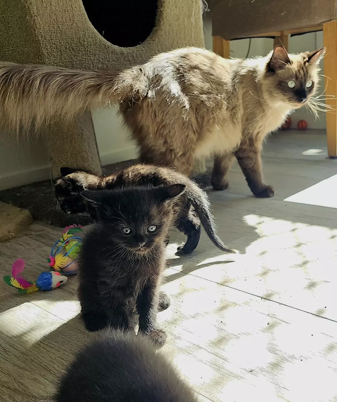 Mum is a beautiful Mink Seal Point Ragdoll with big green eyes.