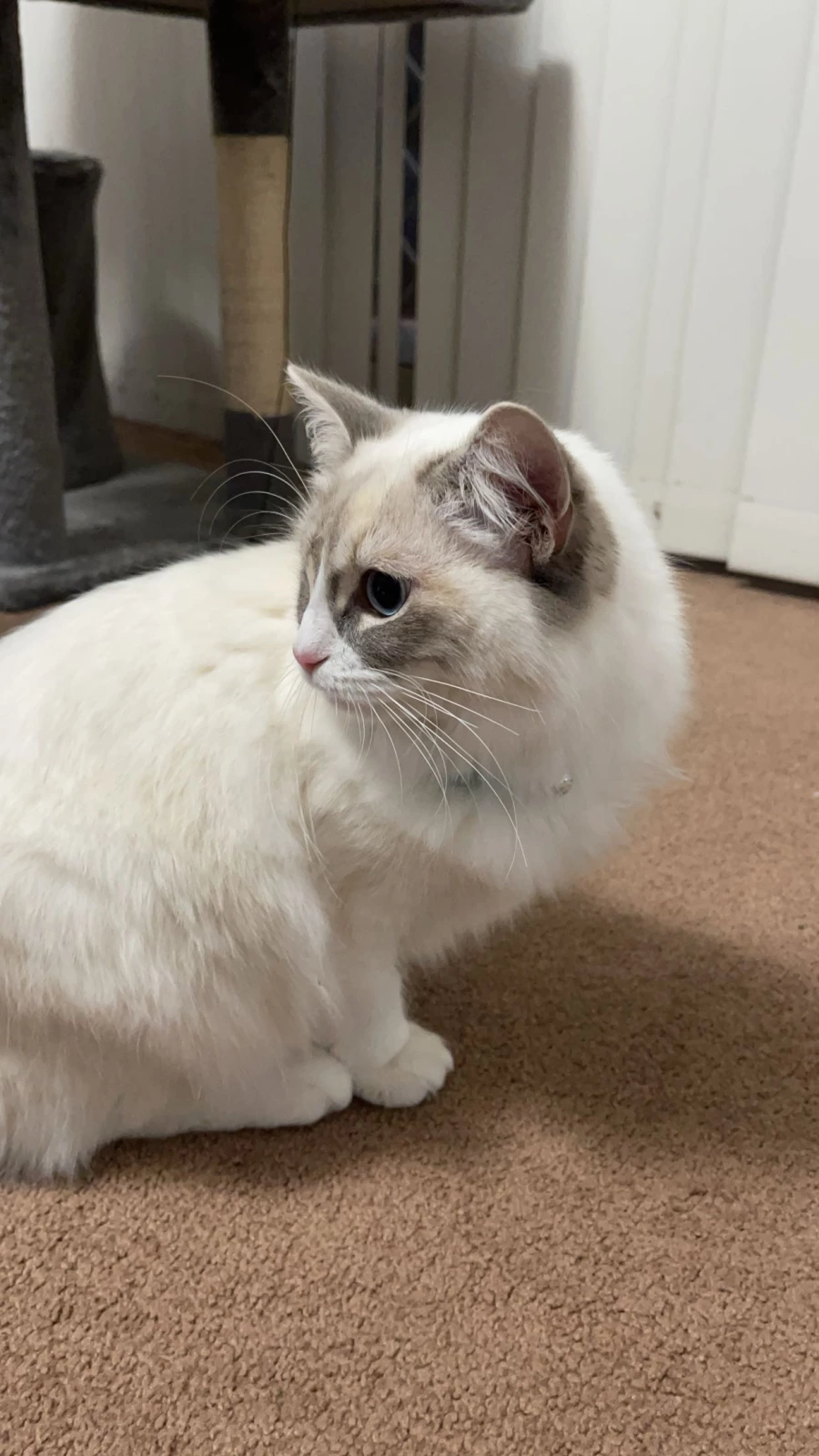 This is an offering for a beautiful purebred Ragdoll named Snow. She is a young female kitten, currently 5 months old, placing her at the perfect age for intensive bonding with her new family while still possessing delightful kitten energy.