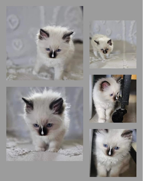 This affectionate female Ragdoll kitten is 11 weeks old and boasts a very playful personality. She has been exceptionally well-socialized, having been lovingly brought up around children and other cats and dogs, ensuring she is adaptable and confident in a busy family environment.