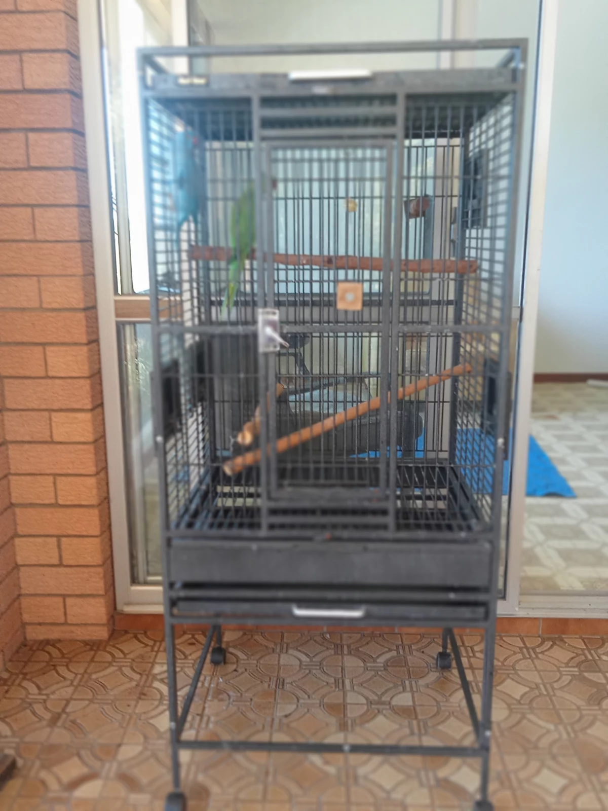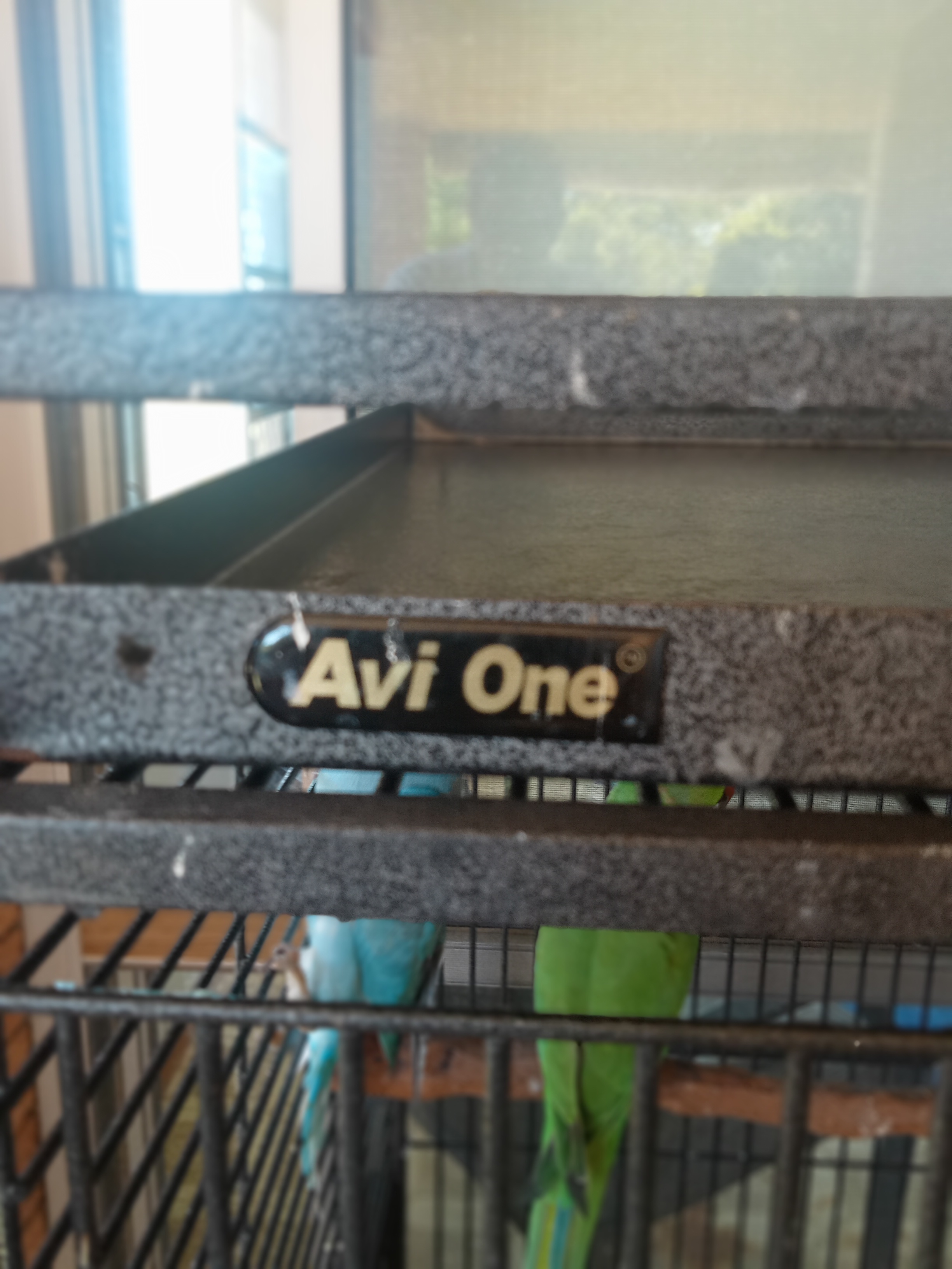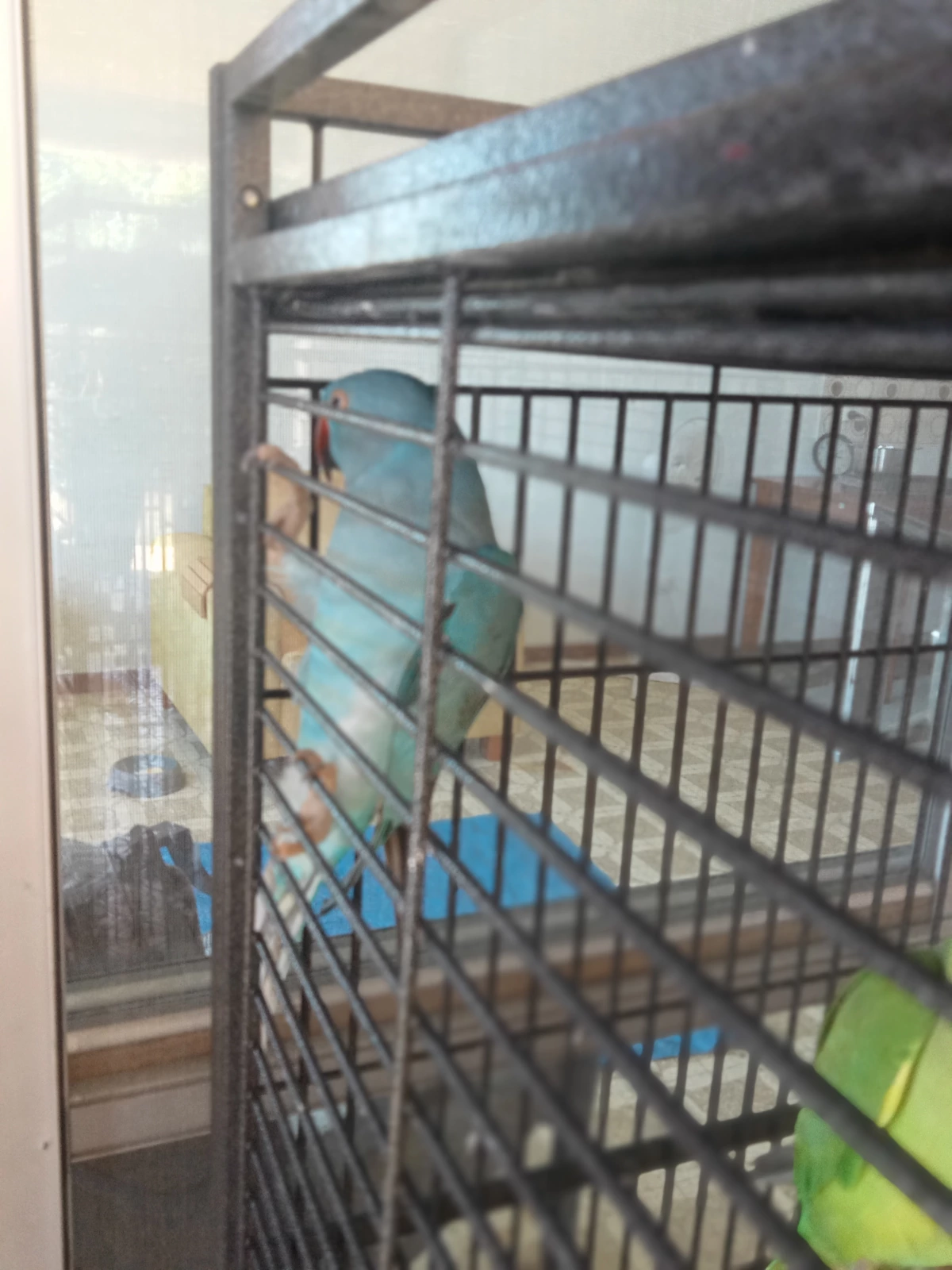 Avi One parrot cage.and 2 Indian Ringnecks - Green male 2 years old, Blue less than 12 months ols (sex not yet determined) Males get a black ring around their neck around 18 months old.